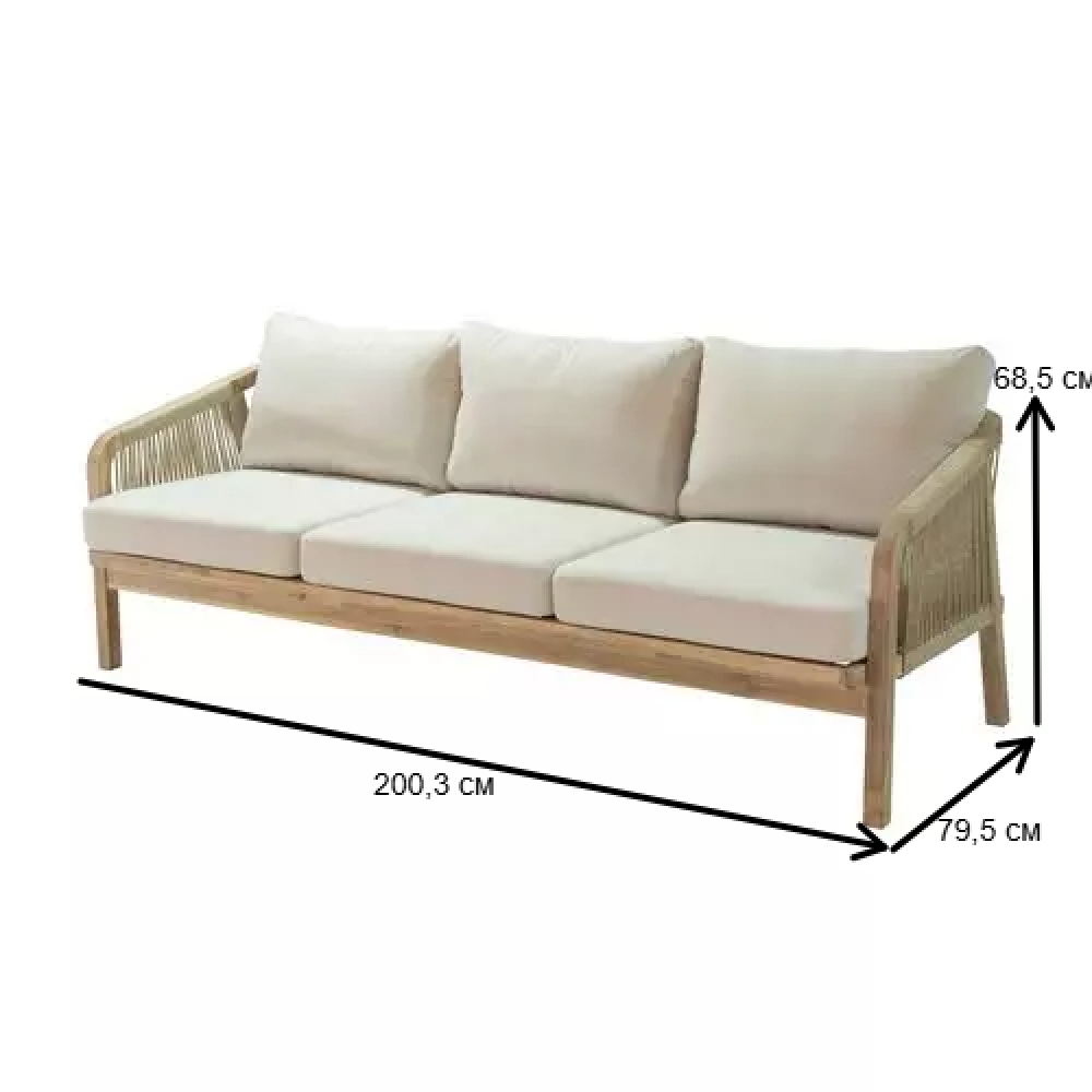 Особенности конструкции: Современный минимализм, сочетание массива акации и натурального веревочного плетения Роуп, эргономичная глубина посадки, мягкие подушки в комплекте, просторное сиденье для троих