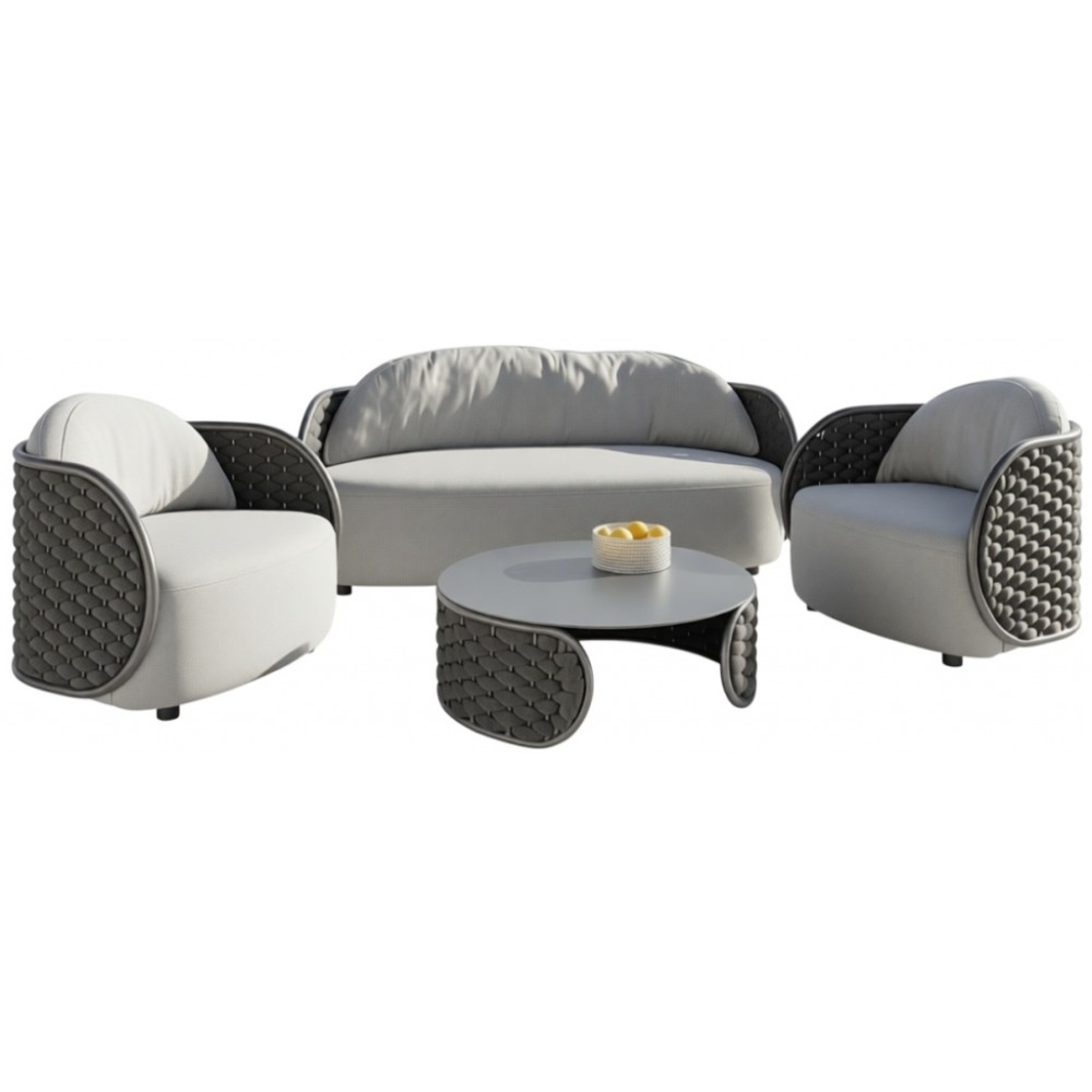 Данная продукция возится только под заказ с фабрики по предоплате. Комплект Mojoсостоит из двухместного дивана, двух кресели журнального столика. Устойчивый и надежный каркас кресел и дивана выполнен из алюминия иоплетен резиновым канатом с текстиленовой оплеткой. Подушки, выполненные из устойчивого к пятнам и ультрафиолетовому излучению олефина, обеспечивают комфортный отдых. Журнальный столик выполнен из алюминия. Стильный и удобный комплект можно разместить в зоне отдыха в помещении или на открытом воздухе. Состав комплекта: Диван с подушками, размер: 1800х780х700 мм, высота сиденья: 400 мм, вес: 30кг - 1 шт. Кресло с подушками, размер: 880х780х700 мм, высота сиденья: 400 мм, вес: 18 кг- 2шт. Журнальный стол, размер: Ø870х320 мм, вес: 12кг - 1 шт.