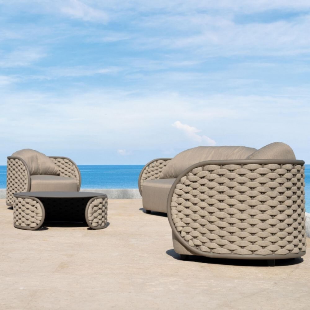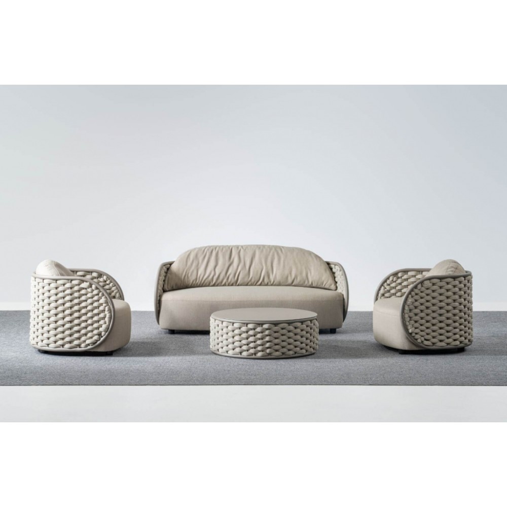 Данная продукция возится только под заказ с фабрики по предоплате. Комплект Mojoсостоит из двухместного дивана, двух кресели журнального столика. Устойчивый и надежный каркас кресел и дивана выполнен из алюминия иоплетен резиновым канатом с текстиленовой оплеткой. Подушки, выполненные из устойчивого к пятнам и ультрафиолетовому излучению олефина, обеспечивают комфортный отдых. Журнальный столик выполнен из алюминия. Стильный и удобный комплект можно разместить в зоне отдыха в помещении или на открытом воздухе. Состав комплекта: Диван с подушками, размер: 1800х780х700 мм, высота сиденья: 400 мм, вес: 30кг - 1 шт. Кресло с подушками, размер: 880х780х700 мм, высота сиденья: 400 мм, вес: 18 кг- 2шт. Журнальный стол, размер: Ø870х320 мм, вес: 12кг - 1 шт.