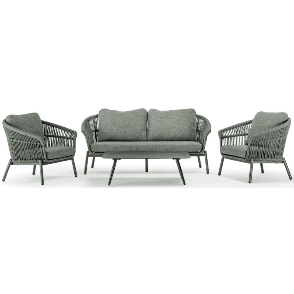 Данная продукция возится только под заказ с фабрики по предоплате. Садовый комплект для отдыха Tropea сочетает в себе современный дизайн, высокий комфорт и долговечность материалов. Он состоит из двух кресел, двухместного дивана и журнального столика с алюминиевой столешницей и идеально подходит для стильных открытых пространств. Алюминиевый каркас обтянут текстильным канатом толщиной 8 мм, а подушки из олефина с быстросохнущим пеноматериалом обеспечивают максимальный комфорт. Особенности: Рама:алюминий. Покрытие роупа:водостойкий текстильный канат диаметром 8 мм. Обивка:съемные подушки из олефиновой водоотталкивающей ткани с быстросохнущей пеной. Столешница столика:алюминий – прочный и легко моется. Комплект идеально подходит для террас, садов и стильных зон отдыха. Садовый гарнитур Tropea - этоидеальный выбор для тех, кто ищет комфортную и эксклюзивную зону отдыха на открытом воздухе. Идеально подходит для долгих часов отдыха под открытым небом. Состав комплекта: Диван с подушками, размер: 1800х820х800мм, высота сиденья: 400 мм, вес: 25 кг - 1 шт. Кресло с подушками, размер: 930х820х800 мм, высота сиденья: 400 мм, вес: 12 кг- 2 шт. Журнальный стол, размер: 1100х700х350мм, вес: 9кг - 1 шт.