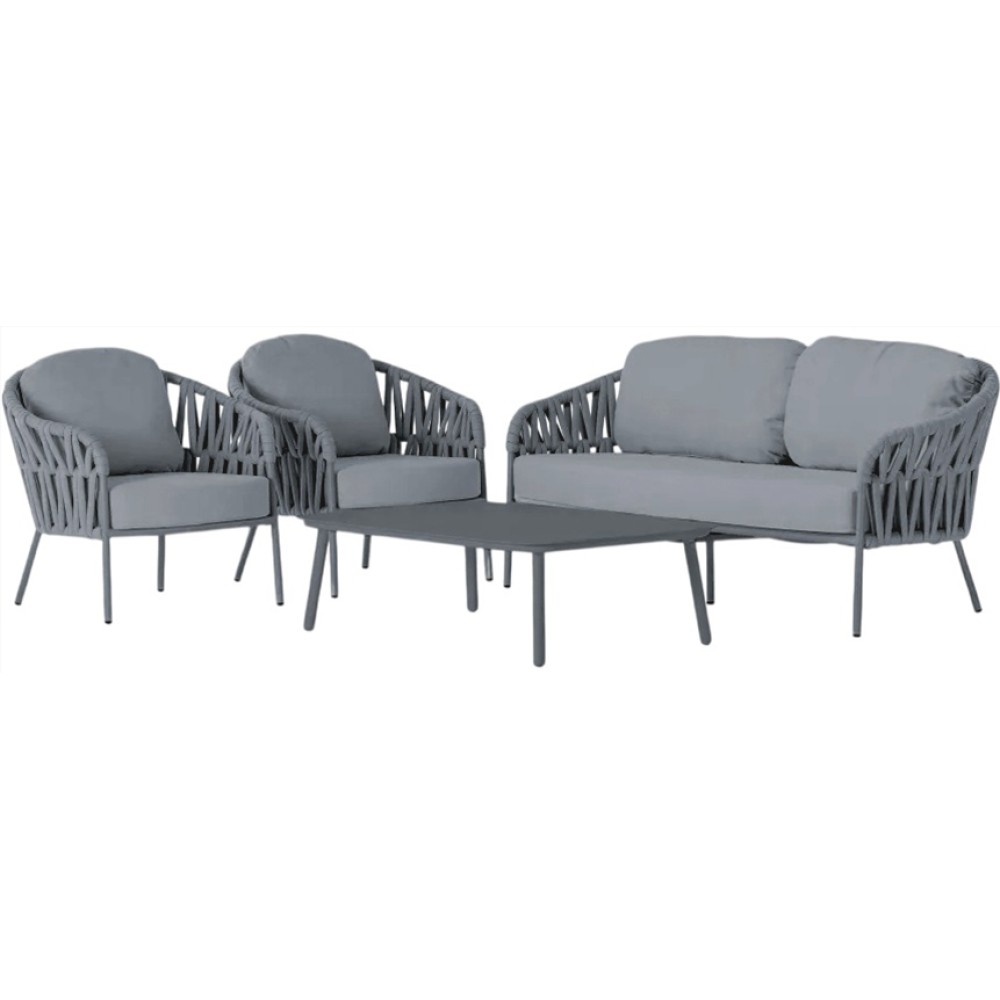 Данная продукция возится только под заказ с фабрики по предоплате. Садовый комплект мебели Victory -это идеальное сочетание современного дизайна, высокого качества изготовления и максимального комфорта. Этот комплект, состоящий из просторного дивана, двух удобных кресел и стильного журнального столика с алюминиевой столешницей, станет роскошным решением для отдыха на открытом воздухе: на террасе, в саду или в гостиной. Прочный алюминиевый каркас обтянут полиэстером и резиновым канатом, а съёмные подушки из олефина с водоотталкивающей пропиткой обеспечат максимальный комфорт. Состав комплекта: Диван с подушками, размер: 1700х780х790мм, высота сиденья: 450 мм, вес: 26 кг - 1 шт. Кресло с подушками, размер: 850х780х790мм, высота сиденья: 450 мм, вес: 12 кг- 2 шт. Журнальный стол, размер: 1100х700х350мм, вес: 9кг - 1 шт.