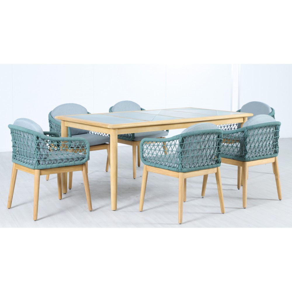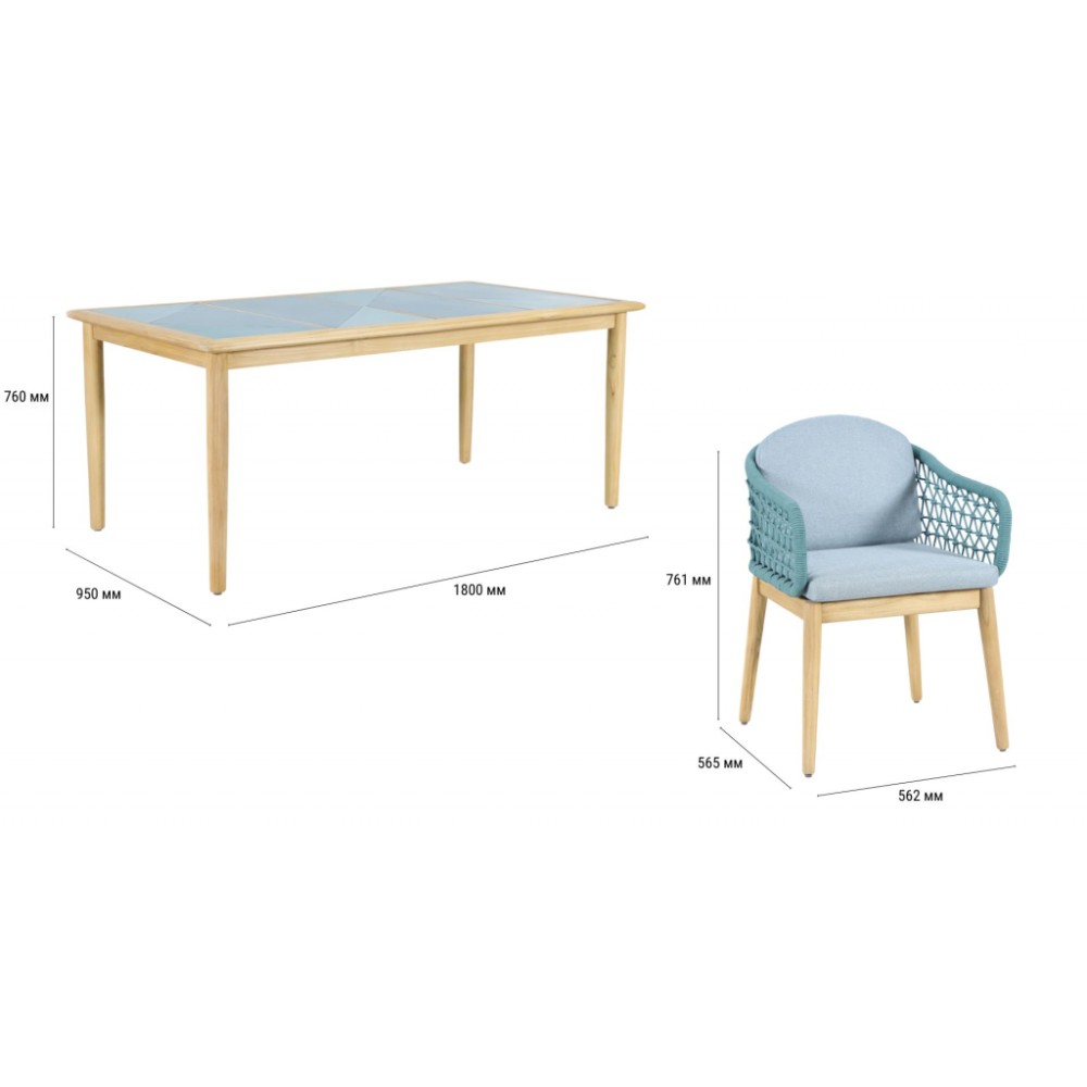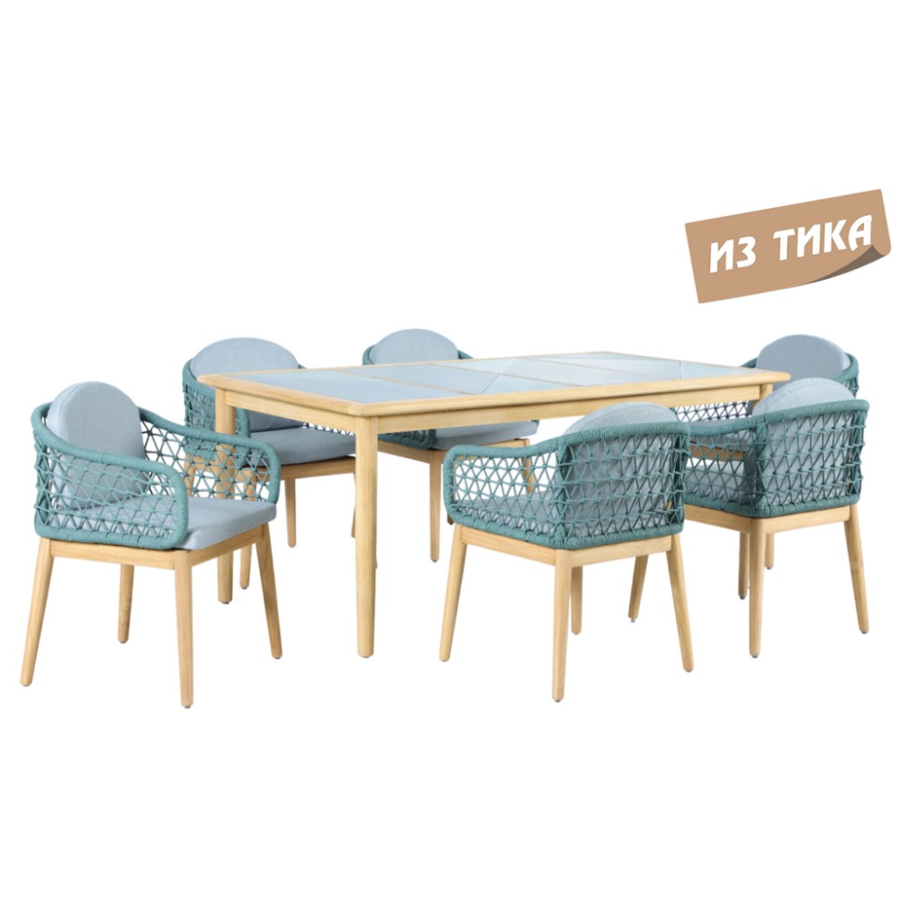 Обеденная группа Cambria на 6 персон- это современная серия уличной мебели, объединяющая натуральную тёплую текстуру ТИКА, верёвочное плетение роуп и комфортные съёмные подушки.Коллекция разработана для открытых пространств - террас, веранд и садовых зон отдыхаи ориентирована на тех, кто ценит долговечность, премиальный вид и минимальный уход. Особенности: Материал - массив ТИКА. отделка экомаслом натуральный. Тик - это лиственное дерево твердых пород, которое происходит из высокогорья. Никакая другая древесина не обладает такой исключительной прочностью и долговечностью, как тик. Его уникальная текстура и кожистый запах обусловлены высоким содержанием масла. Эти характеристики в сочетании с высокой плотностью древесины предотвращают коробление и гниение, позволяя мебели оставаться на открытом воздухе в любых условиях без ухода или защитных средств. Веревочное плетение роуп VPR - PR 730 толщиной 6 ммизлучает стиль в сочетании с деревянными поверхностями. Древесина, из которой изготовлена мебель, имеет сертификацию FSC (Forest Stewardship Council) - гарантия качества и происхождения древесины. Знак FSC - показатель того, что продукция происходит из леса, в котором ведется экологически и социально ответственное лесное хозяйство. Благодаря своей долговечности, прочности и устойчивости к вредителям эта древесина была создана для изготовления садовой мебели. Столешница из тика, вставка RAL 200 40 25 / RAL 180 90 05. Коррозионно-стойкая, анодированная фурнитура из нержавеющей стали. Подушки в комплекте, ткань подушек - олефин, наполнитель - толстый поролон. Материалы устойчивы к УФ-излучению и другим погодным воздействиям. Цвет подушек - Malmo 72. Состав комплекта: Креслос подушками, размер: 562х565х761 мм - 6шт. Стол обеденный,размер: 1800х750х760мм - 1 шт. Данные упаковки: Кресло: Вес нетто: 20 кг.Вес брутто: 23 кг. Размер упаковки: 600х600х655 мм. Объем упаковки: 0.118 м³. Количество в упаковке: 2шт. Кресло: Вес нетто: 20 кг.Вес брутто: 23 кг. Размер упаковки: 600х600х655 мм. Объем упаковки: 0.118 м³. Количество в упаковке: 2шт. Кресло: Вес нетто: 20 кг.Вес брутто: 23 кг. Размер упаковки: 600х600х655 мм. Объем упаковки: 0.118 м³. Количество в упаковке: 2шт. Столобеденный: Вес нетто: 34кг.Вес брутто: 40 кг. Размер упаковки: 1850х1000х135 мм. Объем упаковки: 0.250 м³. Количество в упаковке: 1 шт. Открыть инструкцию по уходу. Вся деревянная мебель должна обрабатываться специальным маслом или пропиткой минимум 1 раз в 6 месяцев (в условиях высокой влажности обработку следует проводить чаще). Для данной мебели не рекомендуются резкие температурные перепады. Дерево является натуральным материалом, поэтому любые трещины, неравномерные природные рисунки, различность оттенков ‐ являются естественным процессом, который вызван температурными изменениями или влажностью.