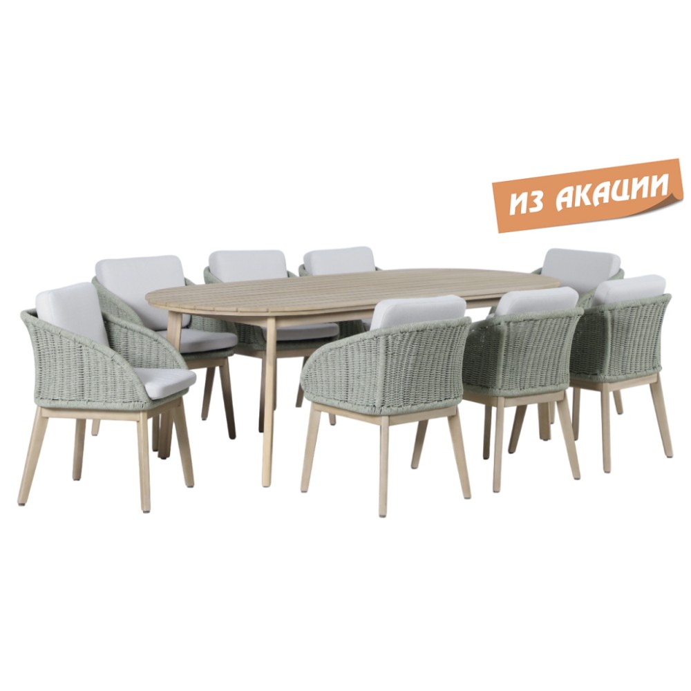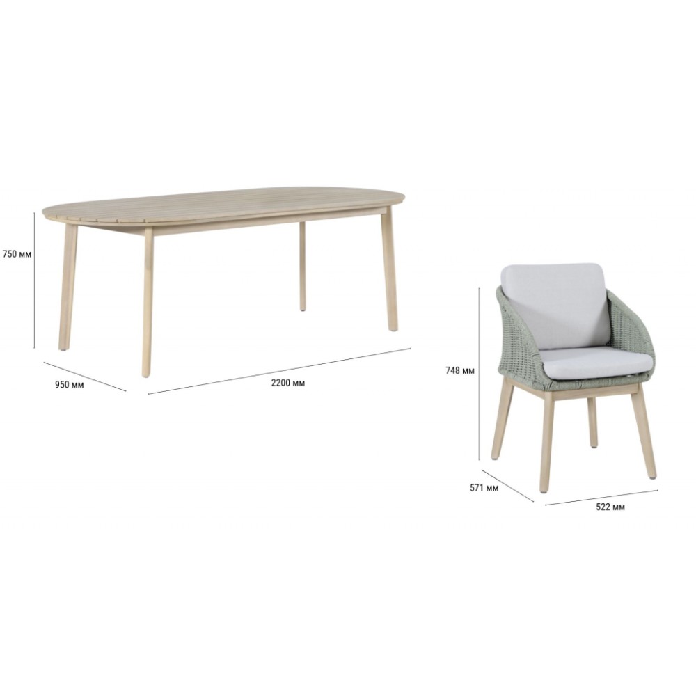 Обеденная группа Madrague на 8персон - это элегантная коллекция уличной мебели из АКАЦИИ, выполненная в комбинацииверевочного плетения роуп, акации и комплектом устойчивых к погоде подушек. Идеальна для террасы, веранды или комфортной зоны на открытом воздухе - сочетает эстетичный внешний вид, прочность и простой уход. Особенности: Материал - АКАЦИЯ, отделка экомаслом тик Light #01A. Веревочное плетение роупDPC 1783на спинке, сиденье и подлокотниках излучает стиль в сочетании с деревянными поверхностями. Древесина, из которой изготовлена мебель, имеет сертификацию FSC (Forest Stewardship Council) - гарантия качества и происхождения древесины. Знак FSC - показатель того, что продукция происходит из леса, в котором ведется экологически и социально ответственное лесное хозяйство. Благодаря своей долговечности, прочности и устойчивости к вредителям эта древесина была создана для изготовления садовой мебели. Страна происхождения древесины: Вьетнам, Малайзия. Средняя плотность древесины: 550 кг/м³. Столешница стола выполнена из массива акации. Анодированная фурнитура из нержавеющей стали. Подушки в комплекте, ткань подушек - олефин, наполнитель - толстый поролон. Материалы устойчивы к УФ-излучению и другим погодным воздействиям. Цвет подушек - светло-серый B103175. Состав комплекта: Креслос подушками, размер: 522х571х748 мм - 8шт. Стол обеденный,размер: 2200х950х750мм - 1 шт. Данные упаковки: Кресло: Вес нетто: 16 кг.Вес брутто: 19.5 кг. Размер упаковки: 645х660х625 мм. Объем упаковки: 0.133м³. Количество в упаковке: 2шт. Кресло: Вес нетто: 16 кг.Вес брутто: 19.5 кг. Размер упаковки: 645х660х625 мм. Объем упаковки: 0.133м³. Количество в упаковке: 2шт. Кресло: Вес нетто: 16 кг.Вес брутто: 19.5 кг. Размер упаковки: 645х660х625 мм. Объем упаковки: 0.133м³. Количество в упаковке: 2шт. Кресло: Вес нетто: 16 кг.Вес брутто: 19.5 кг. Размер упаковки: 645х660х625 мм. Объем упаковки: 0.133м³. Количество в упаковке: 2шт. Столобеденный: Вес нетто: 30 кг.Вес брутто: 36кг. Размер упаковки: 2245х995х110 мм. Объем упаковки: 0.246 м³. Количество в упаковке: 1 шт. Открыть инструкцию по уходу. Вся деревянная мебель должна обрабатываться специальным маслом или пропиткой минимум 1 раз в 6 месяцев (в условиях высокой влажности обработку следует проводить чаще). Для данной мебели не рекомендуются резкие температурные перепады. Дерево является натуральным материалом, поэтому любые трещины, неравномерные природные рисунки, различность оттенков ‐ являются естественным процессом, который вызван температурными изменениями или влажностью.