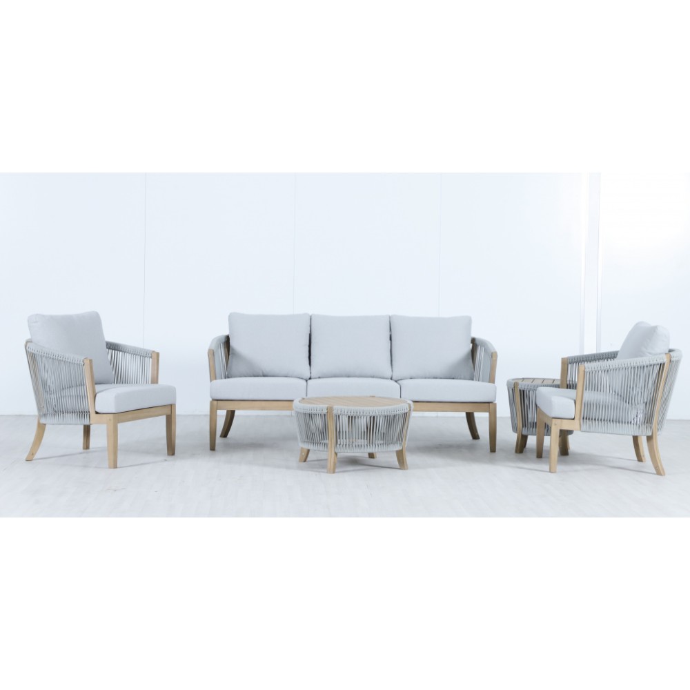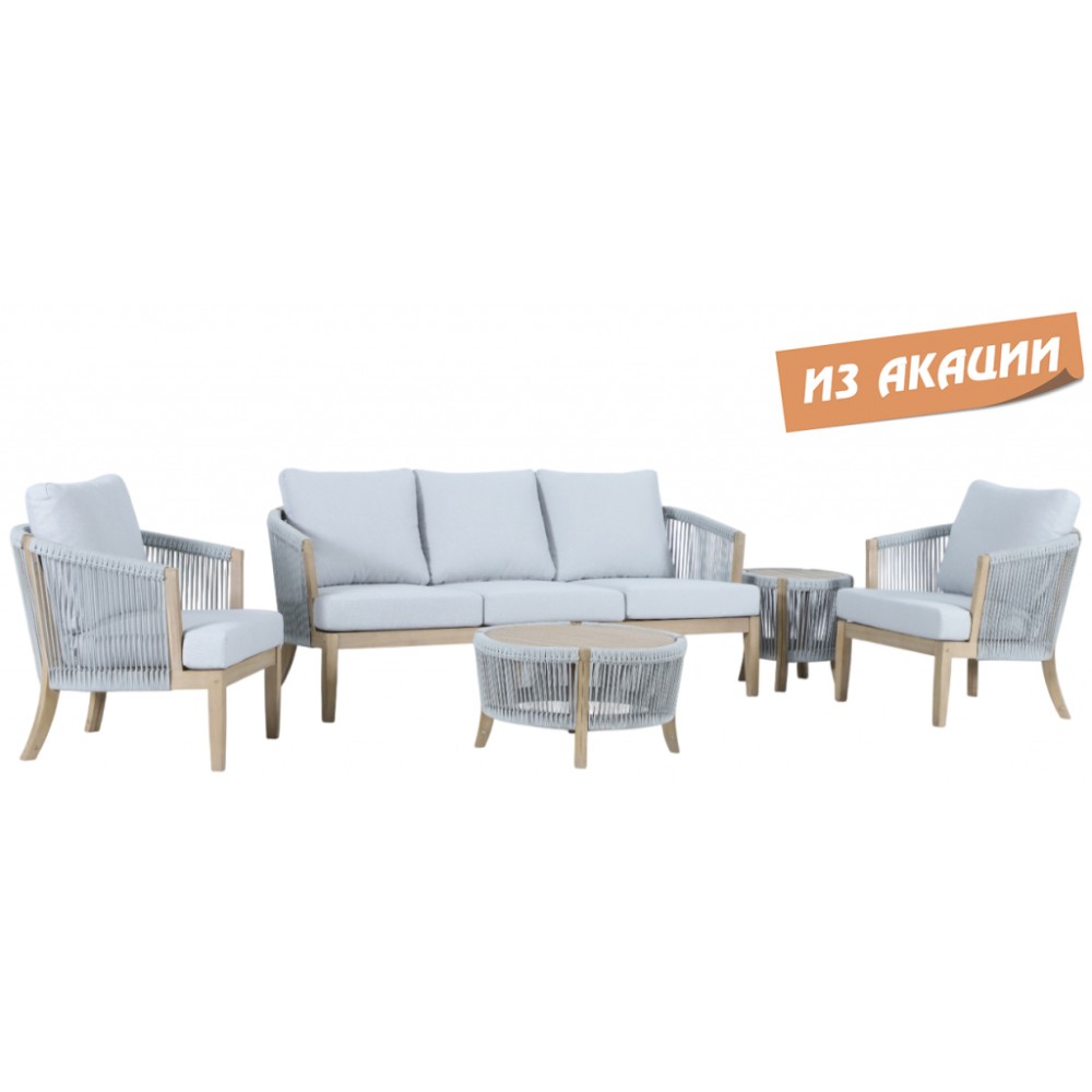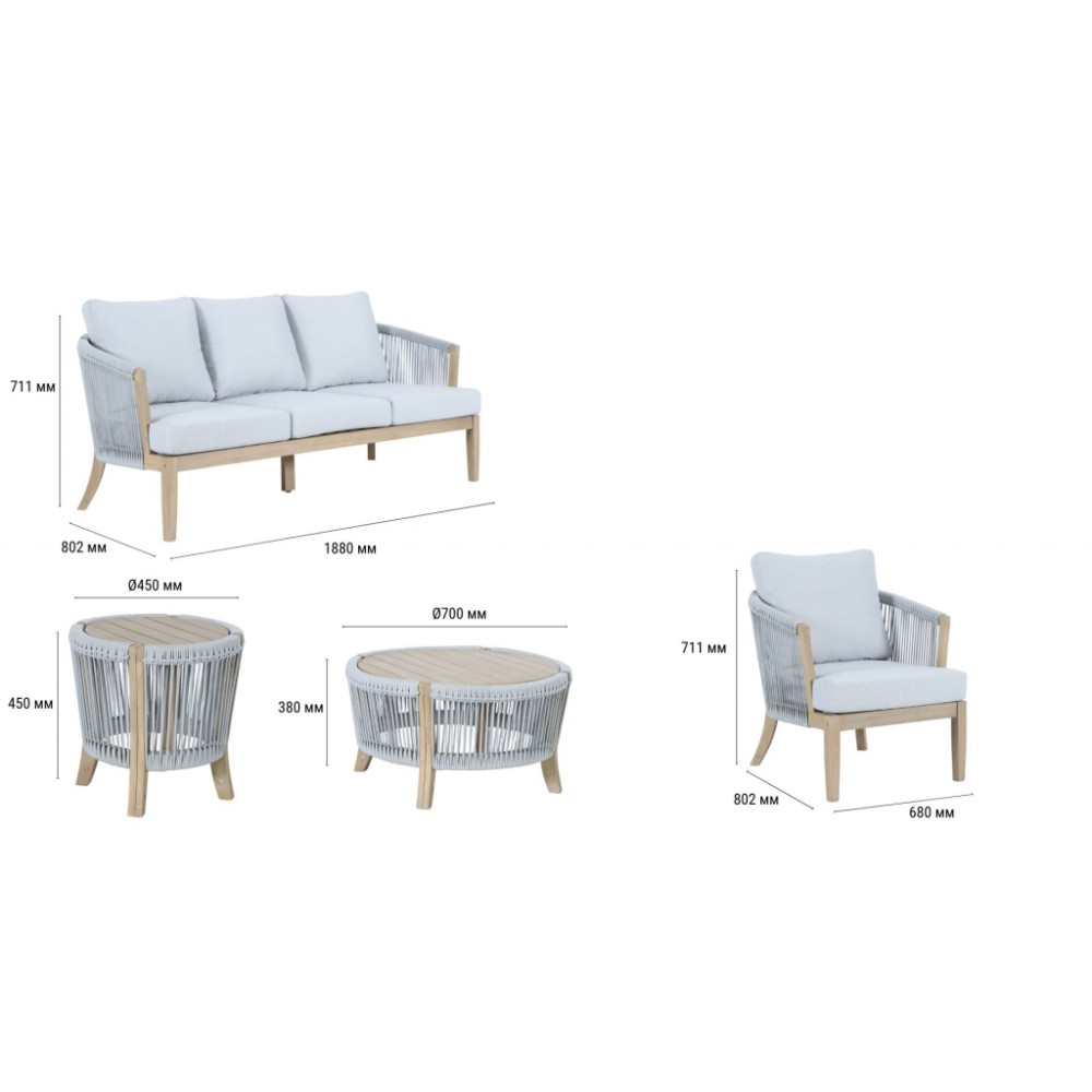 Коллекция Veneto - это линия уличной мебели из АКАЦИИ, объединяющая естественную теплоту дерева и стильные акценты из веревочного плетения роуп.Комплект для отдыха состоит из трехместного дивана, двух комфортных кресел и двух журнальныхстоликов. Veneto создаёт цельную атмосферу на террасе, веранде или в зоне у бассейна. Концепция коллекции - эстетика природных материалов, продуманная эргономика и долговечность в условиях открытого воздуха. Особенности: Материал - АКАЦИЯ, отделка экомаслом тик Light #01A. Веревочное плетение роупVPR PR325 толщиной 6 ммна спинке и подлокотниках излучает стиль в сочетании с деревянными поверхностями. Древесина, из которой изготовлена мебель, имеет сертификацию FSC (Forest Stewardship Council) - гарантия качества и происхождения древесины. Знак FSC - показатель того, что продукция происходит из леса, в котором ведется экологически и социально ответственное лесное хозяйство. Благодаря своей долговечности, прочности и устойчивости к вредителям эта древесина была создана для изготовления садовой мебели. Страна происхождения древесины: Вьетнам, Малайзия. Средняя плотность древесины: 550 кг/м³. Столешница стола выполнена из массива акации. Анодированная фурнитура из нержавеющей стали. Подушки в комплекте, ткань подушек - олефин, наполнитель - толстый поролон. Материалы устойчивы к УФ-излучению и другим погодным воздействиям. Цвет подушек: светло-серый W1920-776 легко сочетается с любыми ландшафтными решениями. Состав комплекта: Кресло лаунж с подушками, размер: 680х802х711мм - 2шт. Диван трехместный с подушками, размер: 1880х802х711мм - 1шт. Столик кофейный,размер: Ø700х380мм - 1 шт. Столик кофейный,размер: Ø450х450мм - 1 шт. Данные упаковки: Кресло лаунж: Вес нетто: 25.48 кг.Вес брутто: 34кг. Размер упаковки: 750х780х1070 мм. Объем упаковки: 0.313 м³. Количество в упаковке: 2шт. Диван трехместный: Вес нетто: 29.56кг.Вес брутто: 38.5кг. Размер упаковки: 1850х780х610 мм. Объем упаковки: 0.880 м³. Количество в упаковке: 1шт. Столик кофейный: Вес нетто: 9.08 кг.Вес брутто: 13кг. Размер упаковки: 665х665х400 мм. Объем упаковки: 0.177 м³. Количество в упаковке: 1 шт. Столик кофейный: Вес нетто: 5.74 кг.Вес брутто: 11.5кг. Размер упаковки: 520х435х340мм. Объем упаковки: 0.077 м³. Количество в упаковке: 1 шт. Открыть инструкцию по уходу. Вся деревянная мебель должна обрабатываться специальным маслом или пропиткой минимум 1 раз в 6 месяцев (в условиях высокой влажности обработку следует проводить чаще). Для данной мебели не рекомендуются резкие температурные перепады. Дерево является натуральным материалом, поэтому любые трещины, неравномерные природные рисунки, различность оттенков ‐ являются естественным процессом, который вызван температурными изменениями или влажностью.