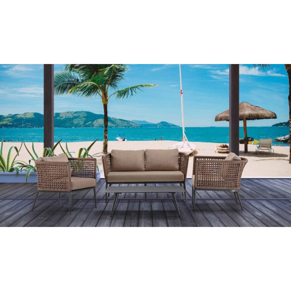 Данная продукция возится только под заказ с фабрики по предоплате. Обращаем Ваше внимание, что на фото указана другая модель журнального столика. Комплект Cuba состоит из двухместного дивана, двух кресел и журнального столика, каркас которых выполнен из алюминия с порошковым покрытием. Кресла и диван имеют низкую спинку, которая создает одно целое с подлокотниками благодаря канатному плетению из полиэстера Ø6мм. Объемные и мягкие подушки, созданные для максимизации комфорта, выполнены из олефина, устойчивого к пятнам и ультрафиолетовому излучению. Коллекция Cuba идеально подходит для тех, кто хочет произвести впечатление с помощью дизайнерской мебели в интерьере и на открытых площадках. Состав комплекта: Диван с подушками, размер: 1350х750х740 мм, высота сиденья: 450 мм, вес: 18 кг - 1 шт. Кресло с подушками, размер: 790х750х740 мм, высота сиденья: 450 мм, вес: 11 кг - 2 шт. Журнальный стол Jolly, размер: 1100х700х350мм, вес: 9 кг - 1 шт.