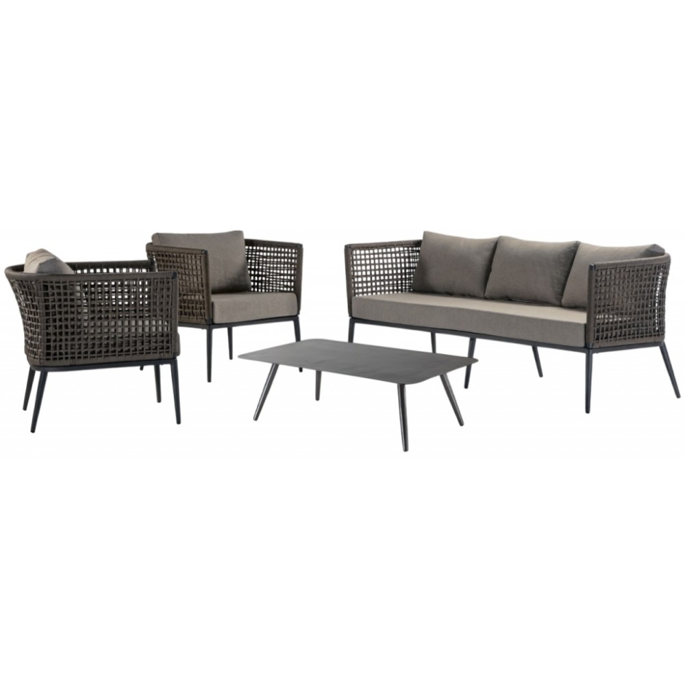 Данная продукция возится только под заказ с фабрики по предоплате. Обращаем Ваше внимание, что на фото указана другая модель журнального столика. Комплект Cuba состоит из трехместного дивана, двух кресел и журнального столика, каркас которых выполнен из алюминия с порошковым покрытием. Кресла и диван имеют низкую спинку, которая создает одно целое с подлокотниками благодаря канатному плетению из полиэстера Ø6 мм. Объемные и мягкие подушки, созданные для максимизации комфорта, выполнены из олефина, устойчивого к пятнам и ультрафиолетовому излучению. Коллекция Cuba идеально подходит для тех, кто хочет произвести впечатление с помощью дизайнерской мебели в интерьере и на открытых площадках. Состав комплекта: Диван с подушками, размер: 1950х750х740 мм, высота сиденья: 450 мм, вес: 26 кг - 1 шт. Кресло с подушками, размер: 790х750х740 мм, высота сиденья: 450 мм, вес: 11 кг - 2 шт. Журнальный стол Jolly, размер: 1100х700х350мм, вес: 9 кг - 1 шт.