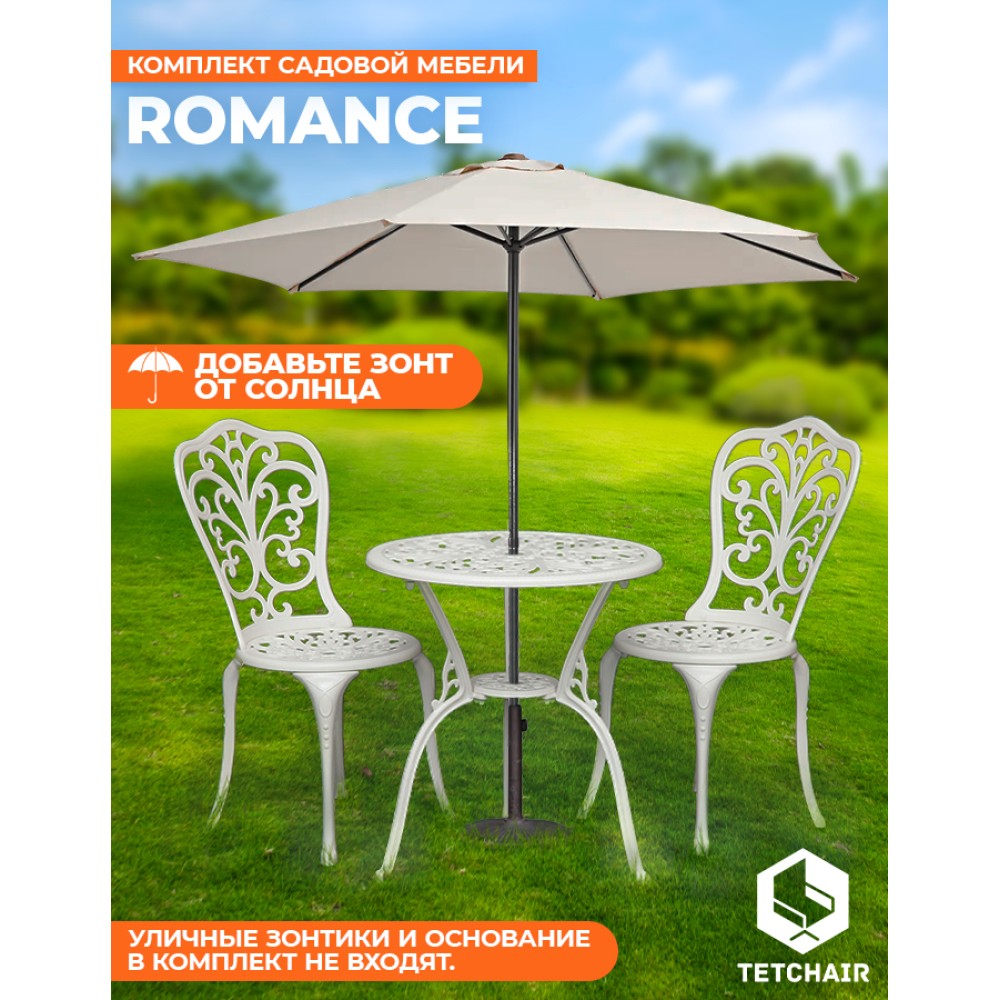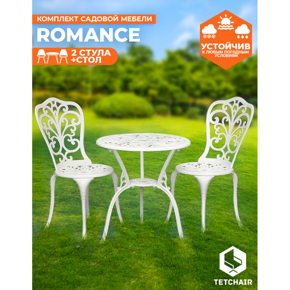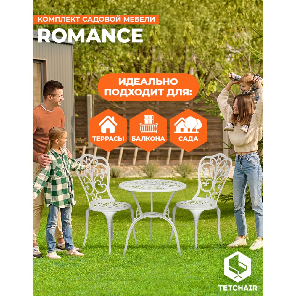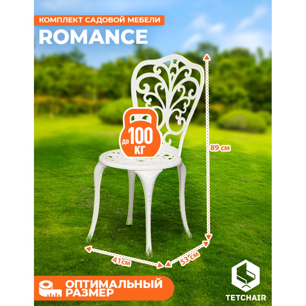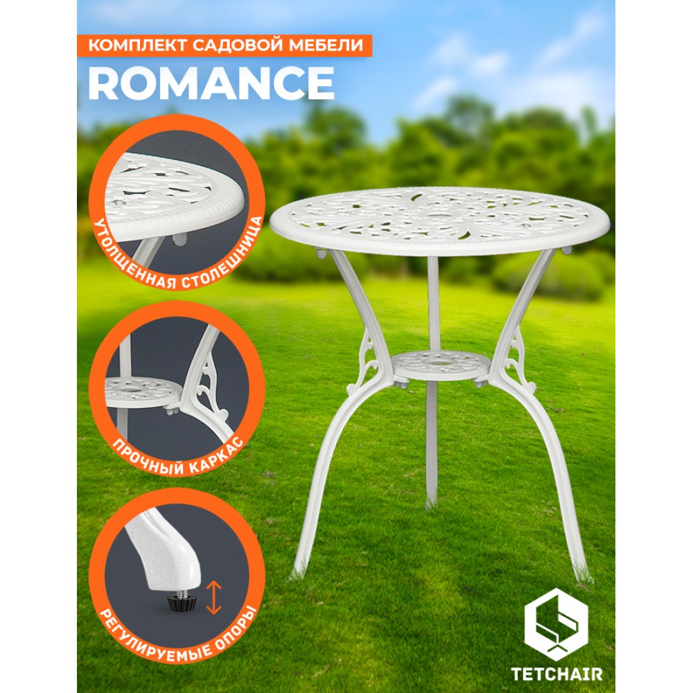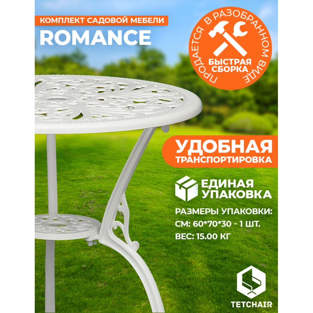 Изысканный комплект кованой мебели Secret De Maison Romance из коллекции JARDIN, состоящий из стола и двух стульев, будет прекрасно смотреться в загородном доме, на дачной веранде, отлично подойдёт для отдыха на приусадебной лужайке. Высокое качество и красота неповторимых ажурных узоров столешницы и спинок стульев добавит благородства в ваш ландшафтный дизайн, подчеркнет вкус и статус своего владельца. Устойчивый стол на трех ножках, дополненный миниатюрной нижней полочкой, и два удобных стула выполнены из литого алюминия и покрашены в белый цвет. Эта функциональная, прочная и красивая мебель займет важное место в оформлении вашего сада. Комплект устойчив к любым погодным условиям и будет радовать вас долгие годы своим первоначальным видом. Изделия прекрасно сочетаются с мебелью из коллекции JARDIN, поставляются в разобранном виде. Для вашего удобства на стулья можно дополнительно приобрести декоративные подушки из нашей коллекции текстиля.