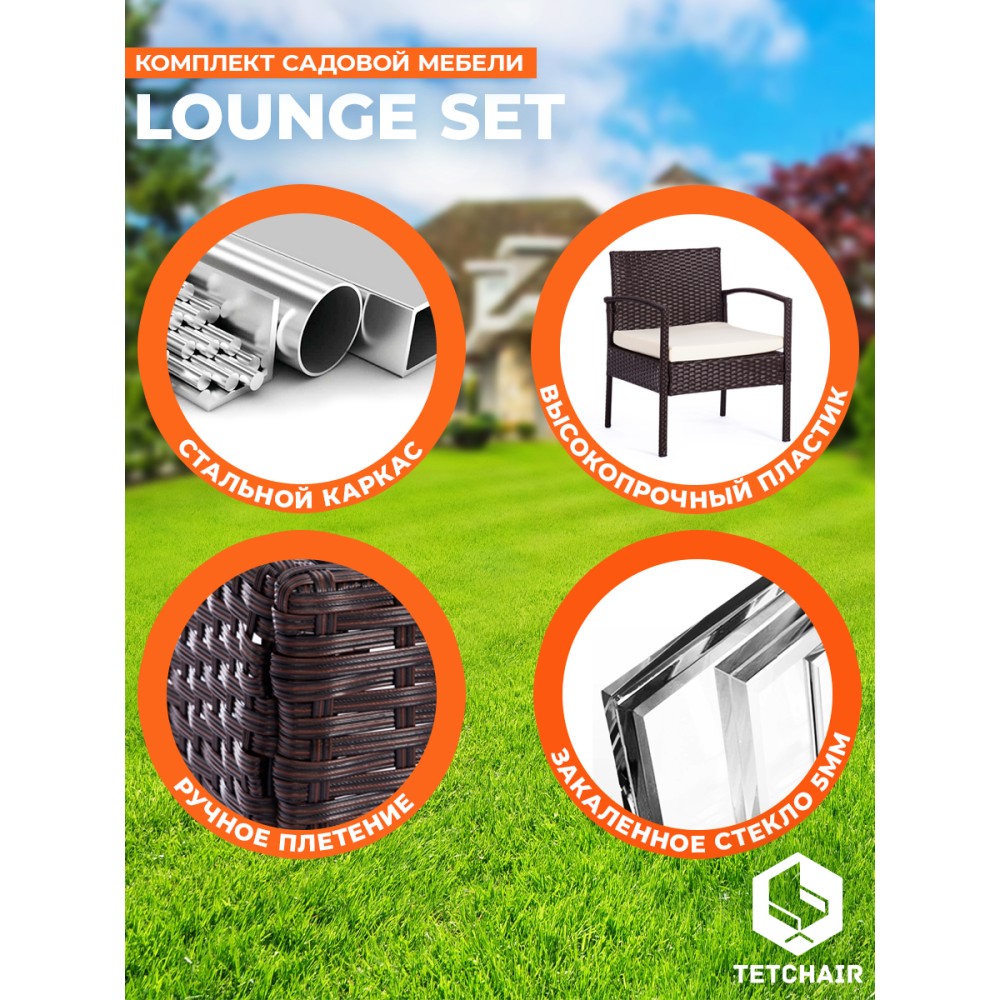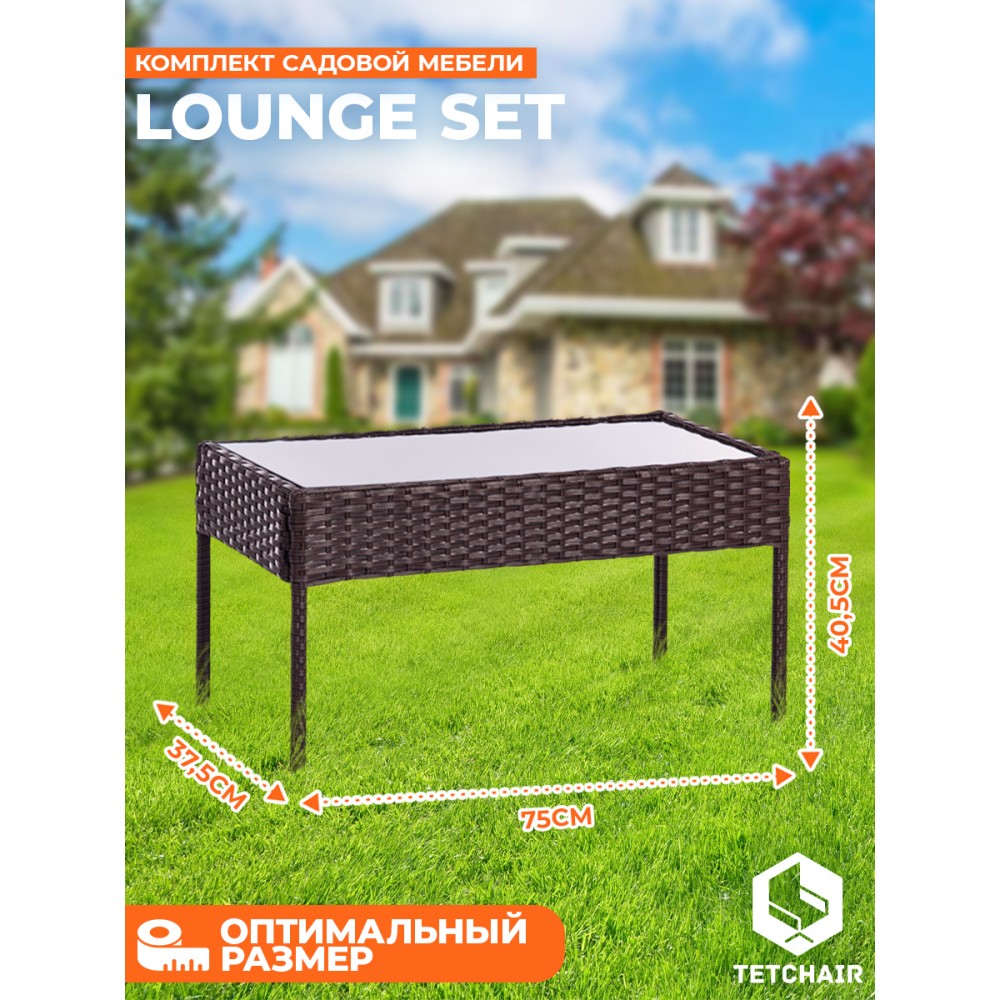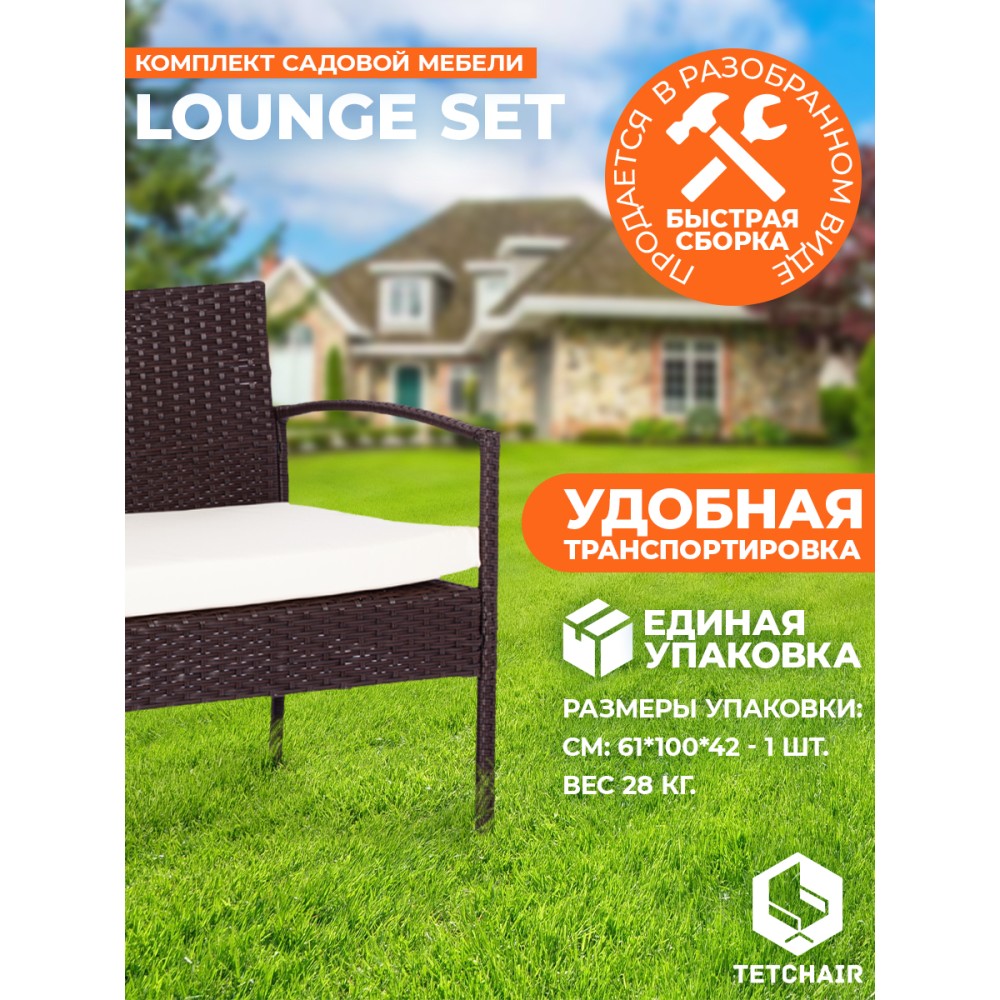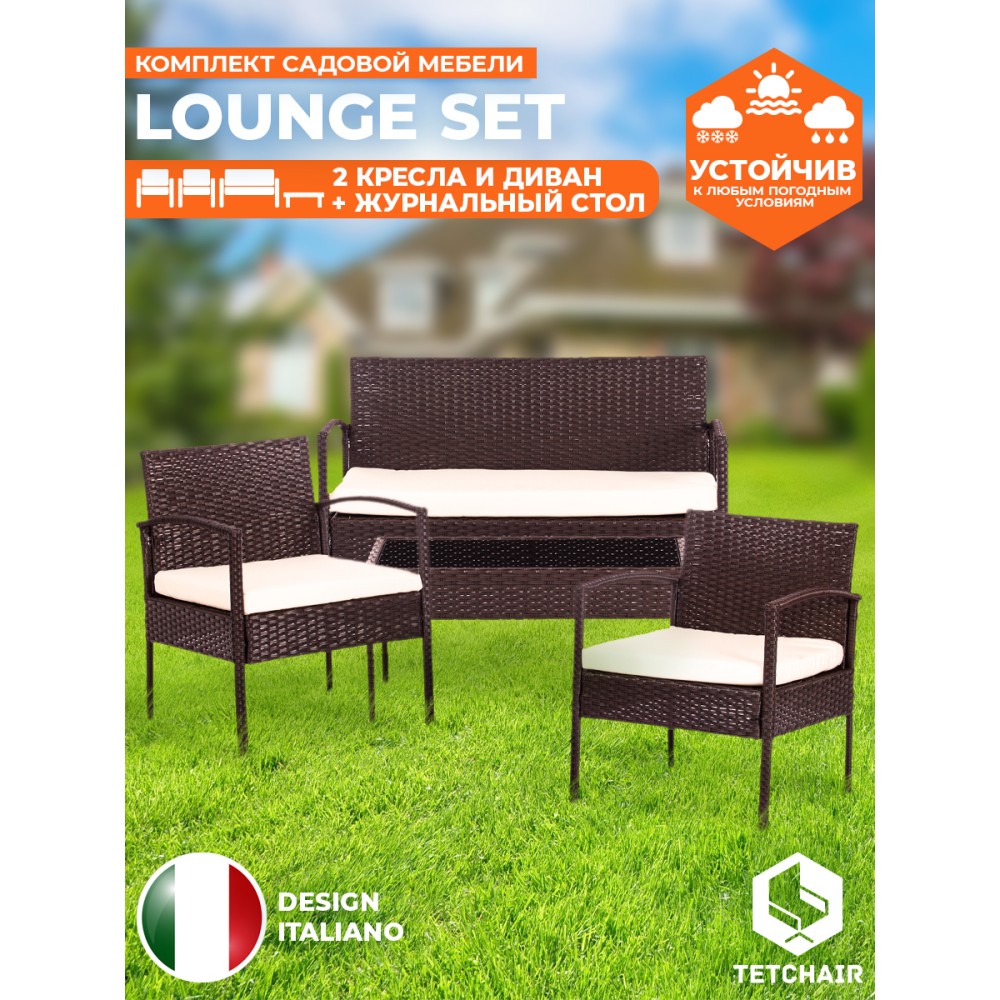 Привлекательный комплект для отдыха «Лаундж сет/Лаундж сет» из коллекции Lounge/Лаундж поможет оформить уютный уголок на свежем воздухе в вашем загородном пространстве. Гарнитур из искусственного ротанга прекрасно подойдет для открытой террасы, веранды или сада. В комплект входят четыре предмета мебели - диван, два кресла и стол. Устойчивый каркас из металла прочен и надежен. Спинка и сиденье изготовлены из полиротанга. Такой материал устойчив к воздействиям влаги, перепадам температур и ультрафиолету. Мягкие подушки выполнены из водоотталкивающего полиэстра с пропиткой от дождя. Крепкая стеклянная поверхность стола способна выдерживать высокие температуры и механические удары, легко моется, долговечна и не теряет своего первоначального внешнего вида на протяжении длительного времени. Благодаря своему небольшому весу комплект для отдыха легко перемещается с места на место. Контрастное сочетание коричневого искусственного ротанга с тканью бежевого цвета выглядит стильно и оригинально. Элегантный набор мебели «Лаундж сет/Лаундж сет» прекрасно впишется в любой интерьер вашего дома или дачи, удивит своими эксплуатационными качествами и прослужит вам долгие годы. Комплект поставляется в разобранном виде. Необходима несложная сборка по прилагаемой инструкции.