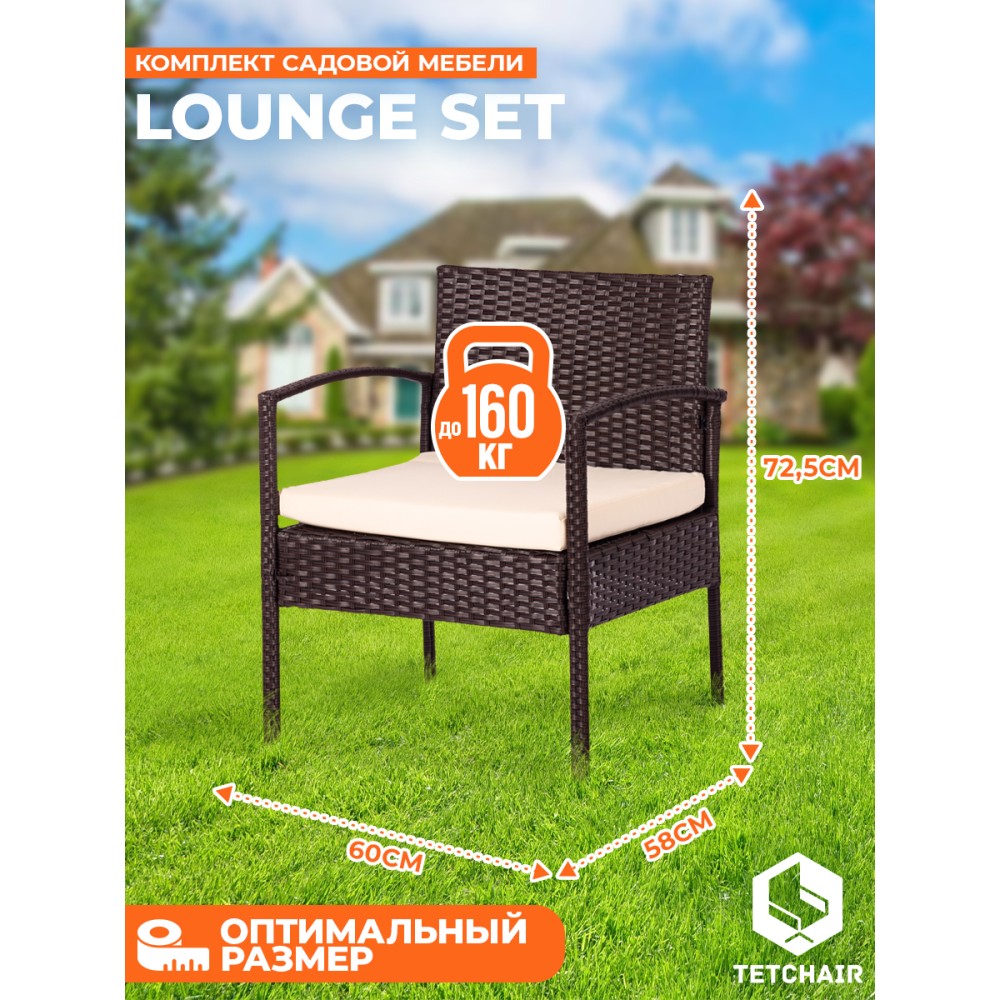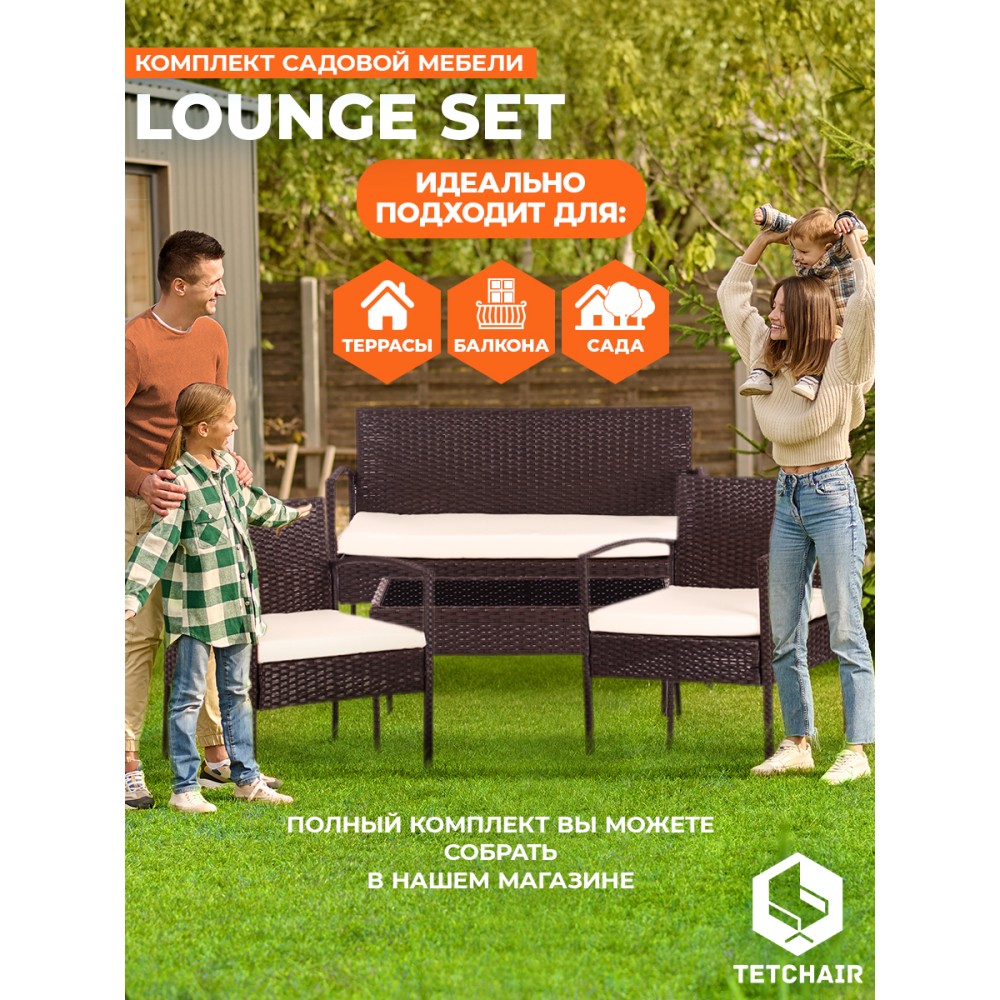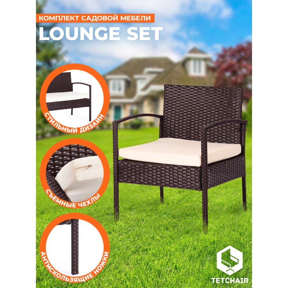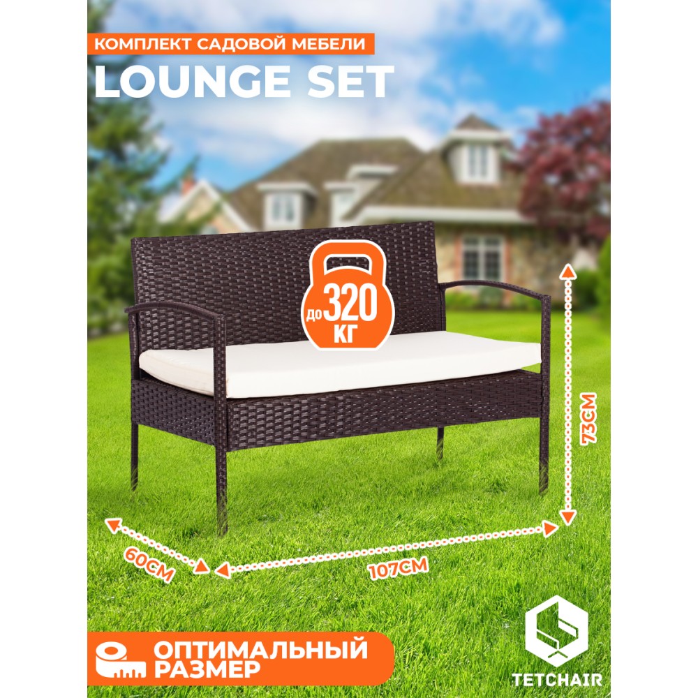Привлекательный комплект для отдыха «Лаундж сет/Лаундж сет» из коллекции Lounge/Лаундж поможет оформить уютный уголок на свежем воздухе в вашем загородном пространстве. Гарнитур из искусственного ротанга прекрасно подойдет для открытой террасы, веранды или сада. В комплект входят четыре предмета мебели - диван, два кресла и стол. Устойчивый каркас из металла прочен и надежен. Спинка и сиденье изготовлены из полиротанга. Такой материал устойчив к воздействиям влаги, перепадам температур и ультрафиолету. Мягкие подушки выполнены из водоотталкивающего полиэстра с пропиткой от дождя. Крепкая стеклянная поверхность стола способна выдерживать высокие температуры и механические удары, легко моется, долговечна и не теряет своего первоначального внешнего вида на протяжении длительного времени. Благодаря своему небольшому весу комплект для отдыха легко перемещается с места на место. Контрастное сочетание коричневого искусственного ротанга с тканью бежевого цвета выглядит стильно и оригинально. Элегантный набор мебели «Лаундж сет/Лаундж сет» прекрасно впишется в любой интерьер вашего дома или дачи, удивит своими эксплуатационными качествами и прослужит вам долгие годы. Комплект поставляется в разобранном виде. Необходима несложная сборка по прилагаемой инструкции.