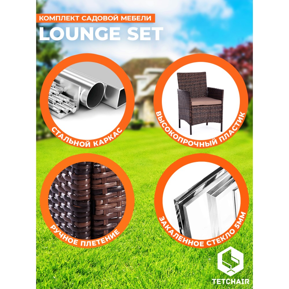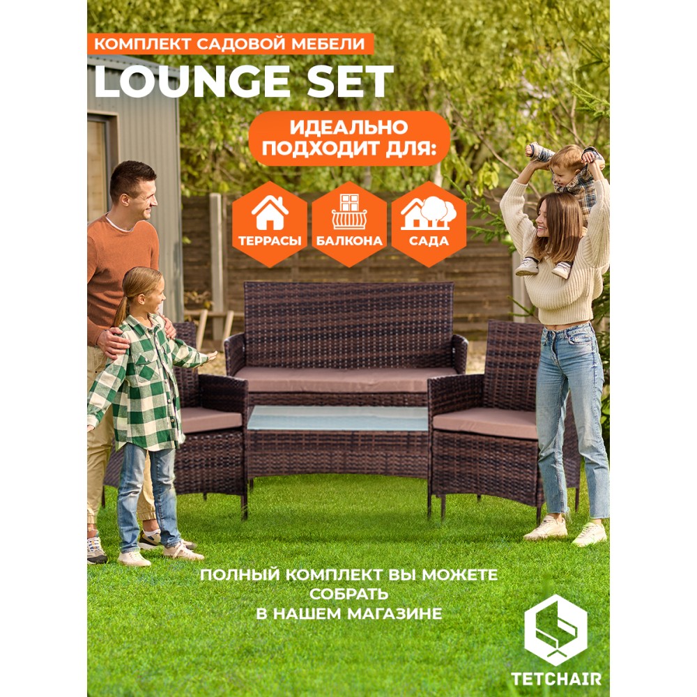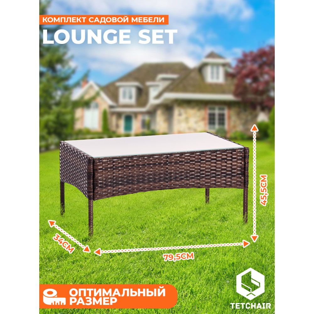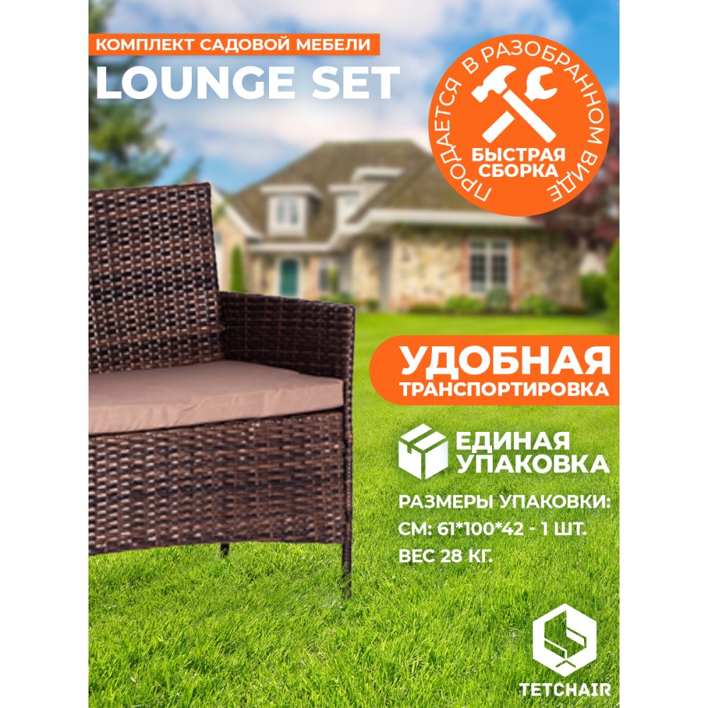 Легкость и простота дизайна комплекта садовой мебели «Лаундж сет/Lounge set» из коллекции Lounge/Лаундж помогут создать атмосферу уюта и спокойствия на летней веранде, террасе или в саду. Изысканный и лаконичный набор будет прекрасно смотреться в любом загородном доме, кафе или ресторане, четко передавая безупречный вкус своих владельцев. В комплект входят четыре предмета мебели - диван, два кресла и стол. Устойчивый каркас из металла прочен и надежен. Удобная спинка и вместительное сиденье изготовлены из искусственного ротанга. Такой материал устойчив к воздействиям влаги, перепадам температур и ультрафиолету. Мягкие подушки выполнены из полиэстра с пропиткой от дождя. Столешница из стекла износостойка и долговечна. При длительной эксплуатации поверхность не меняет форму и не истирается, выдерживает большие нагрузки, не требует сложного ухода. Благодаря своему небольшому весу гарнитур легко перемещается в пространстве. Сочетание темно-коричневого искусственного ротанга и серой ткани DB-18 выглядит стильно и элегантно. Мебель для отдыха практична и оригинальна, удивит вас своей износостойкостью, привлекательностью и надежностью, станет основным акцентом в дизайне вашего загородного дома или кафе. Комплект поставляется в разобранном виде. Необходима несложная сборка по прилагаемой инструкции.