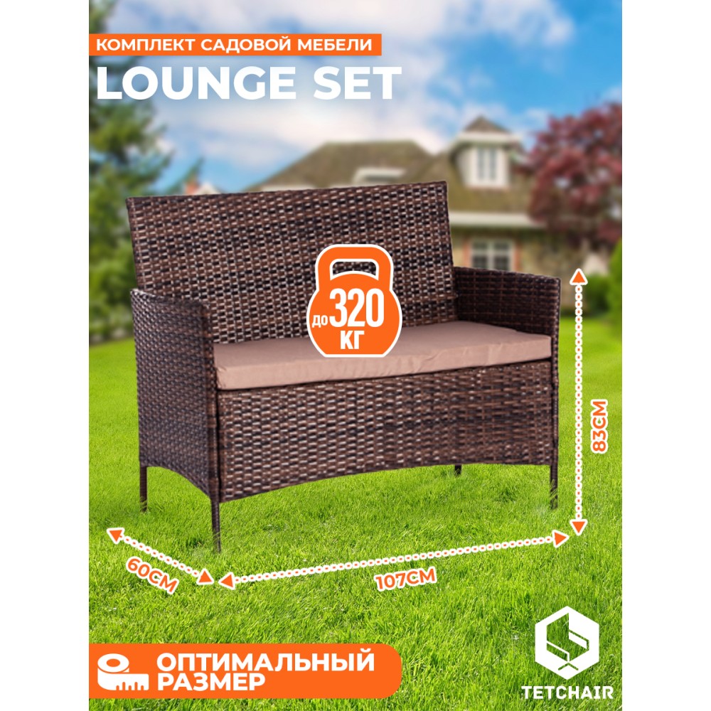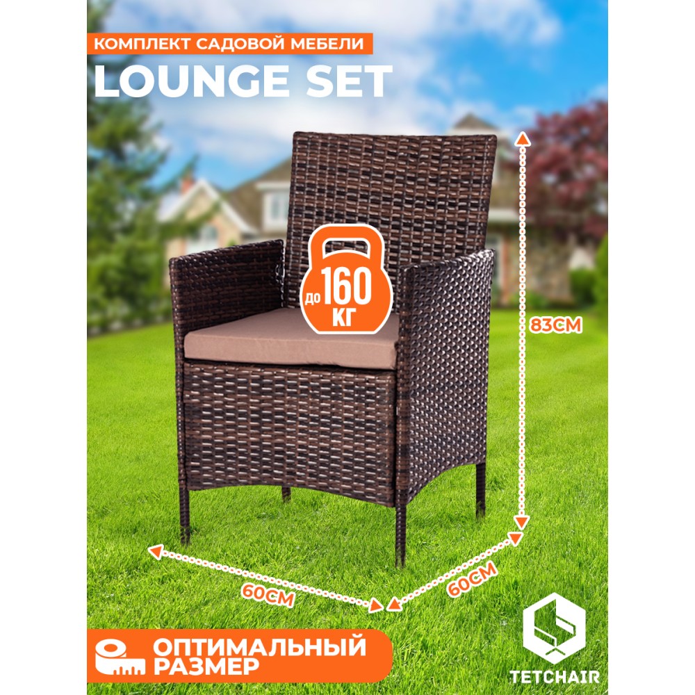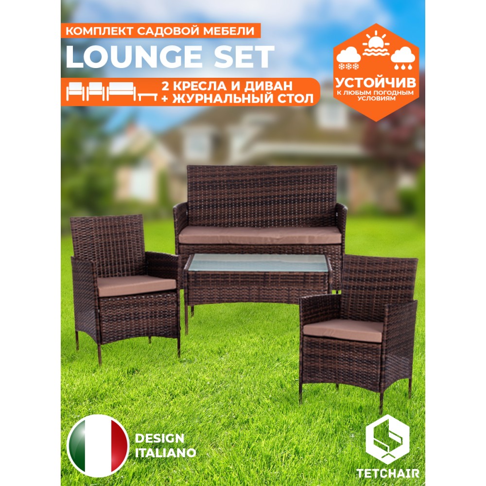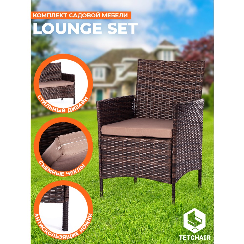 Легкость и простота дизайна комплекта садовой мебели «Лаундж сет/Lounge set» из коллекции Lounge/Лаундж помогут создать атмосферу уюта и спокойствия на летней веранде, террасе или в саду. Изысканный и лаконичный набор будет прекрасно смотреться в любом загородном доме, кафе или ресторане, четко передавая безупречный вкус своих владельцев. В комплект входят четыре предмета мебели - диван, два кресла и стол. Устойчивый каркас из металла прочен и надежен. Удобная спинка и вместительное сиденье изготовлены из искусственного ротанга. Такой материал устойчив к воздействиям влаги, перепадам температур и ультрафиолету. Мягкие подушки выполнены из полиэстра с пропиткой от дождя. Столешница из стекла износостойка и долговечна. При длительной эксплуатации поверхность не меняет форму и не истирается, выдерживает большие нагрузки, не требует сложного ухода. Благодаря своему небольшому весу гарнитур легко перемещается в пространстве. Сочетание темно-коричневого искусственного ротанга и серой ткани DB-18 выглядит стильно и элегантно. Мебель для отдыха практична и оригинальна, удивит вас своей износостойкостью, привлекательностью и надежностью, станет основным акцентом в дизайне вашего загородного дома или кафе. Комплект поставляется в разобранном виде. Необходима несложная сборка по прилагаемой инструкции.