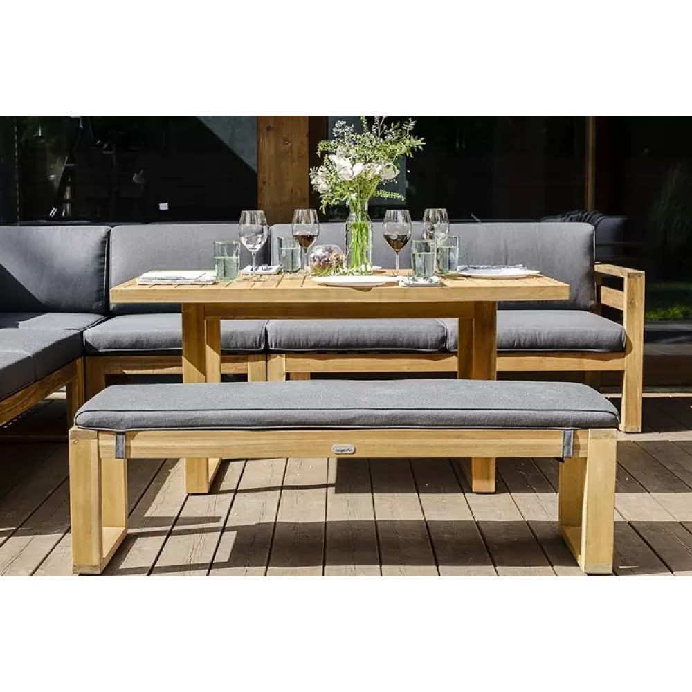 Максимально вместительное и универсальное решение для организации многофункциональной зоны отдыха премиум-класса. Этот комплект БУКА объединяет пять модульных секций (две боковые софы, угловой элемент, центральная секция и отдельное кресло), практичную скамью и просторный обеденный стол, создавая глубокую, многоуровневую композицию из массива акации и мягких подушек цвета «темно-серый графит».