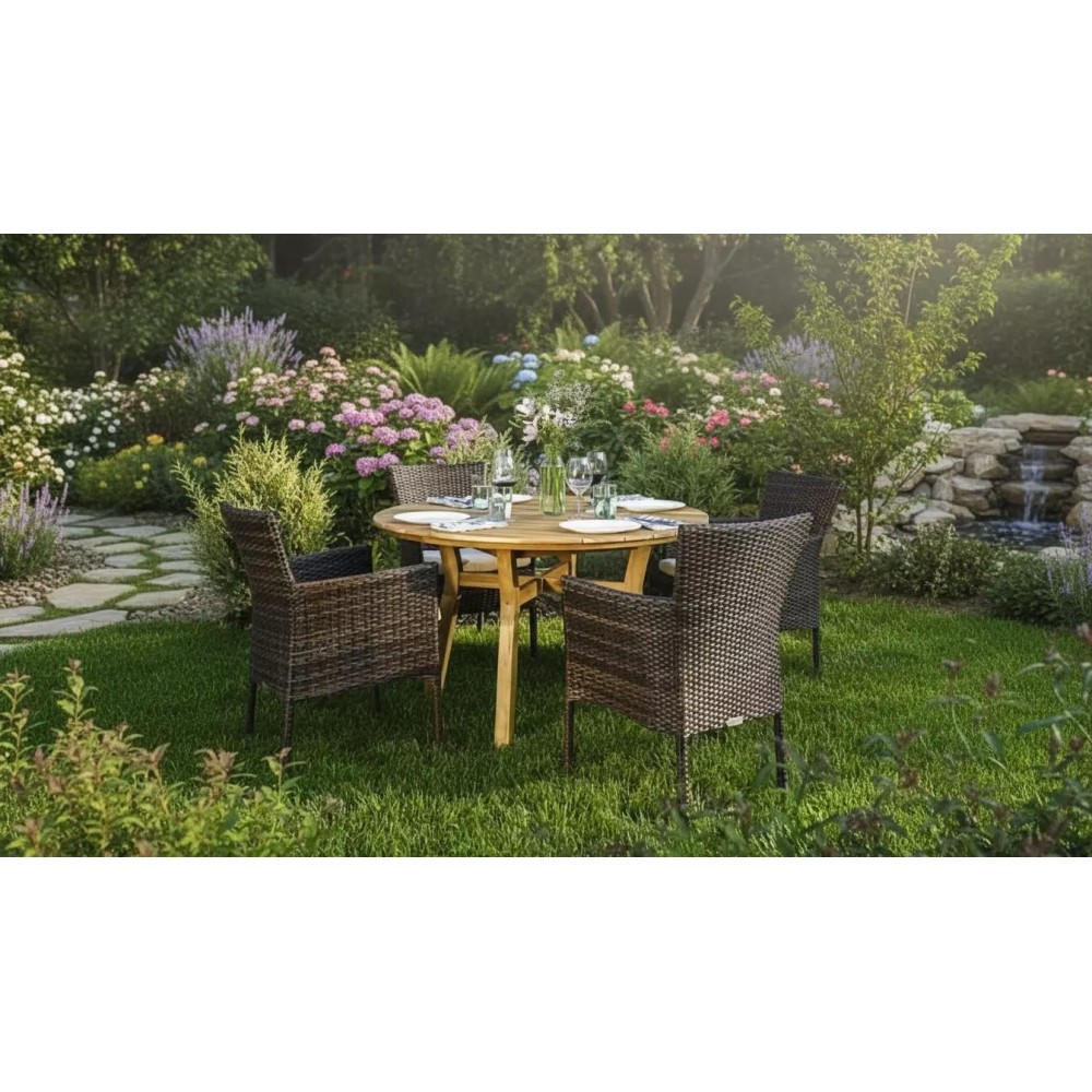 Артикул комплекта: 31222 / 28513Состав набора: Круглый обеденный стол (диаметр 116,5 x 75 см), 4 плетеных кресла (60 x 55 x 85 см)