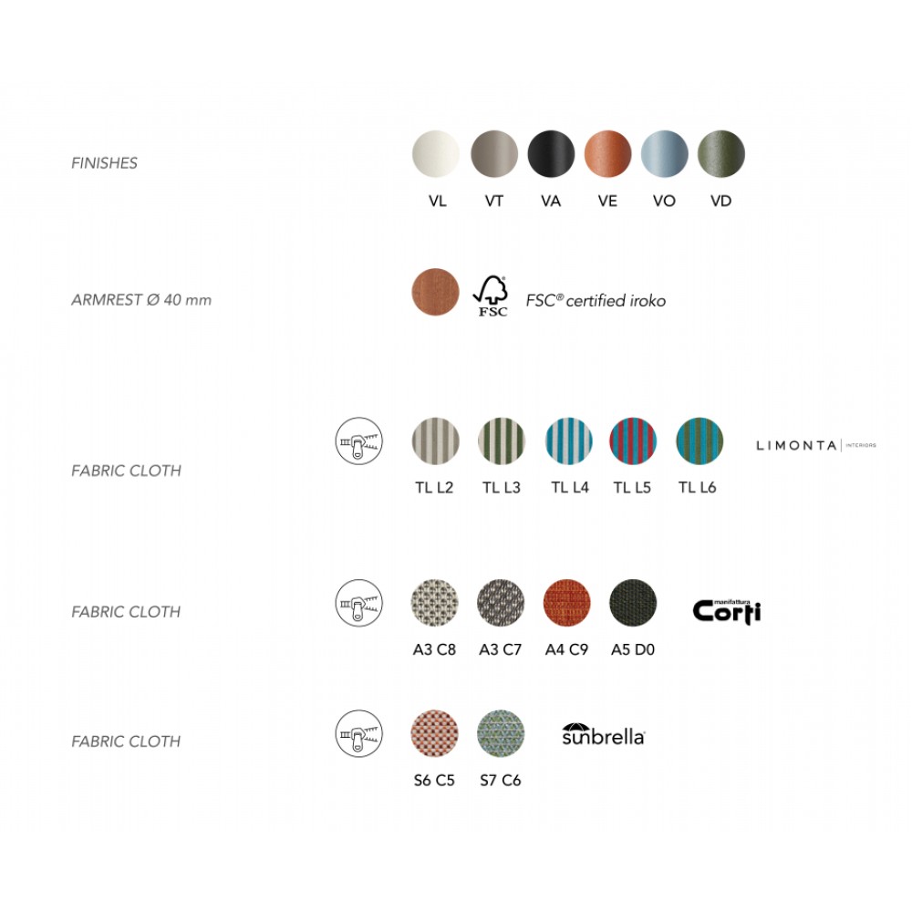 Дизайн: Gumdesign. Новая коллекцияDress Codeвдохновленаканонами высокой моды. Дизайнеры постарались воспроизвести игру с сочетаниями цветов конструкций и сидений,с рисунками тканей для внутреннего и уличного использования.Вдополнение к версиямBasicиSmartиз гладкихи плоскихтканейесть стеганая версияGlamиз больших квадратов и волнообразная версияFashionс мягкой подкладкой. Выстегивание и мягкая обивка являются как эстетическим элементом, так и источником большего комфорта. Особенности: Каркас выполнен из оцинкованной сталис порошковым покрытием. Подлокотники выполнены из дерева ироко,сертифицированного FSC. Знак FSC - показатель того, что продукция происходит из леса, в котором ведется экологически и социально ответственное лесное хозяйство. Сиденье может быть выполнено из тканей коллекций Corti (водо- и грязестойкий акрил),Sunbrella (огнестойкий, дышащий, водо- и грязестойкий, устойчивыйк плесени иультрафиолетовому излучению акрил),Limonta (огнезащитный, антибактериальный и гипоаллергенный материал, устойчивый к плесени, УФ-излучению и воздействию воды, пригодный для вторичной переработки). Тканевая вставка съемная, крепление на молнии. В комплект входит подушка-подголовник, выполненная из той же ткани, что и сиденье. Подушка крепится к раме ремнями на липучке. Варианты сочетаний каркаса и сиденья:можно выбрать из палитры. Посмотреть каталог отделоки обивок. Посмотреть технические характеристики. Цена на сайте указана за модель с сиденьем из ткани Corti. Для уточнения всех возможных вариантов материала и цвета данного изделия обращайтесь к нашим менеджерам!