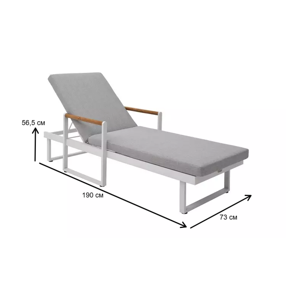 Особенности конструкции: Современный минимализм, сочетание алюминиевого каркаса и натуральной текстуры тика, эргономичная длина 190 см для комфортного положения тела, подлокотники из тика для дополнительной опоры, мягкая подушка в комплекте