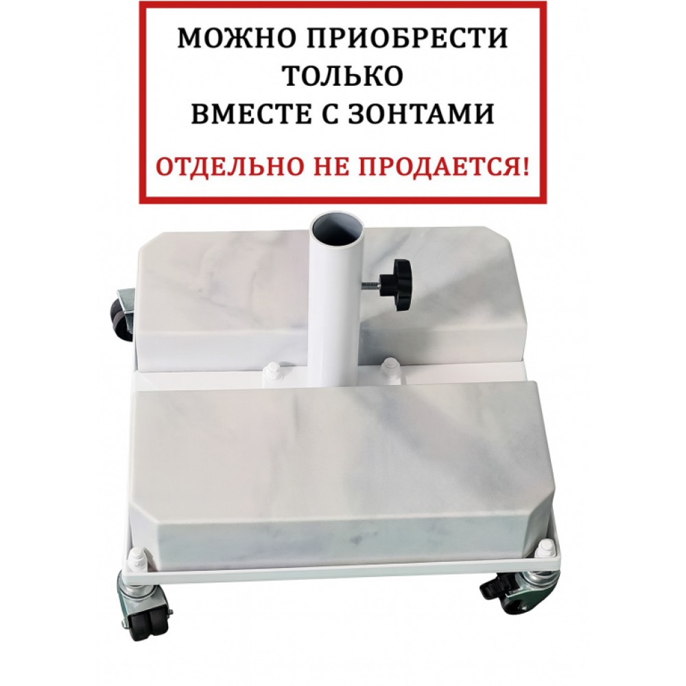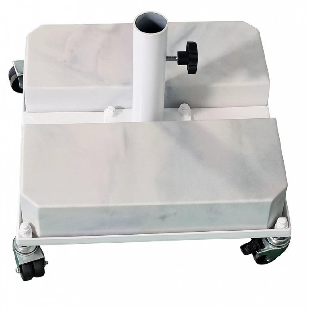 Утяжелительная базаBase Luxuryна колесах для зонтов фабрикиTHEUMBRELA выполнена из металла, утяжелители - из мрамора. Вес базы без утяжелителей: 10 кг. Вес базы с утяжелителями (2 шт.): 70 кг. Для зонтов с опорой диаметром50 мм.