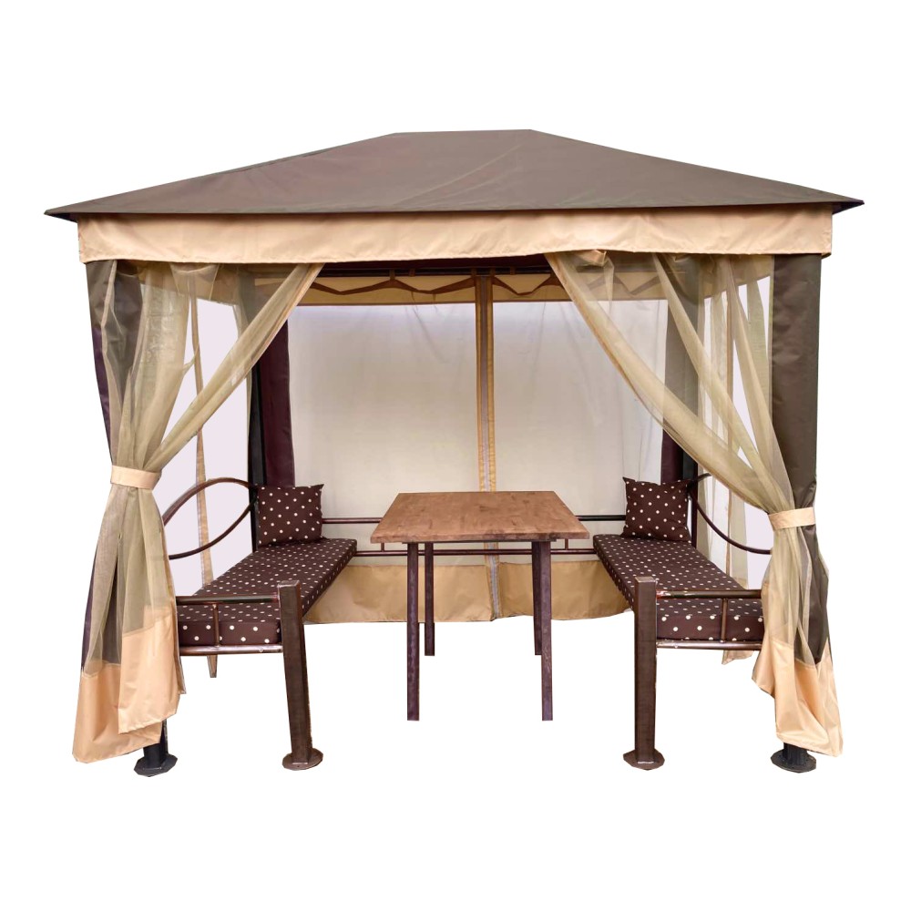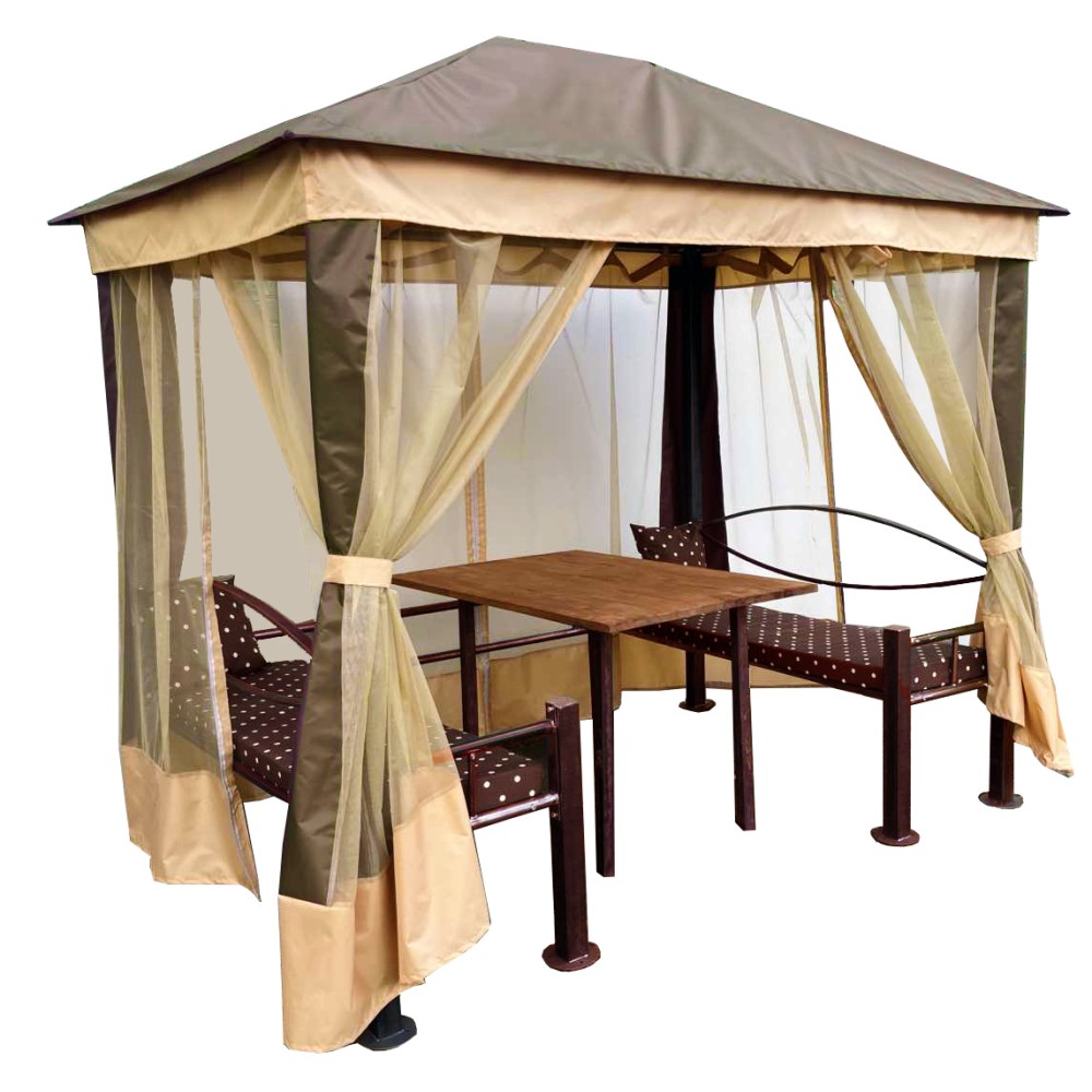 Шатер беседка, 6 ти местный. Лавочки- 2 шт единая конструкция шатра, сиденье сварная сетка: 1500*500*80,толщина мягкого элемента - 80 мм, наполнитель мягкого элемента hollcon/forplit, стол- металл окрашенный/дерево пропитка 1200*800*800. Крыша Oxford 420D. Защита от насекомых: пологи из специальной сетки, м/э
