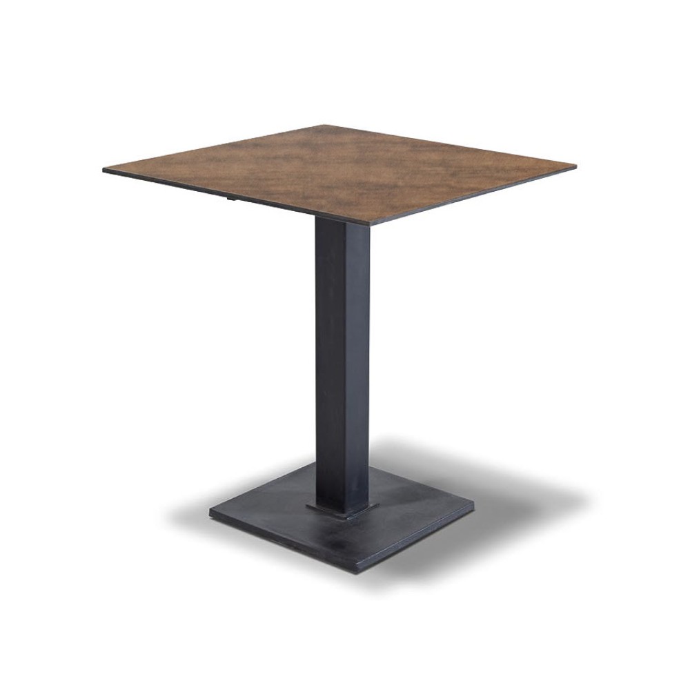 Квадратный интерьерный стол «Каффе» для двоих персон. Столешница выполнена из современного полимерного компакт-пластиком HPL, толщиной 12 мм, в цвете «дуб». Этот материал устойчив к высоким температурам (можно ставить горячую посуду), пролитой жидкости, не требует специального ухода. Подстолье изготовлено из металла, благодаря чему столик очень устойчив на любых поверхностях.