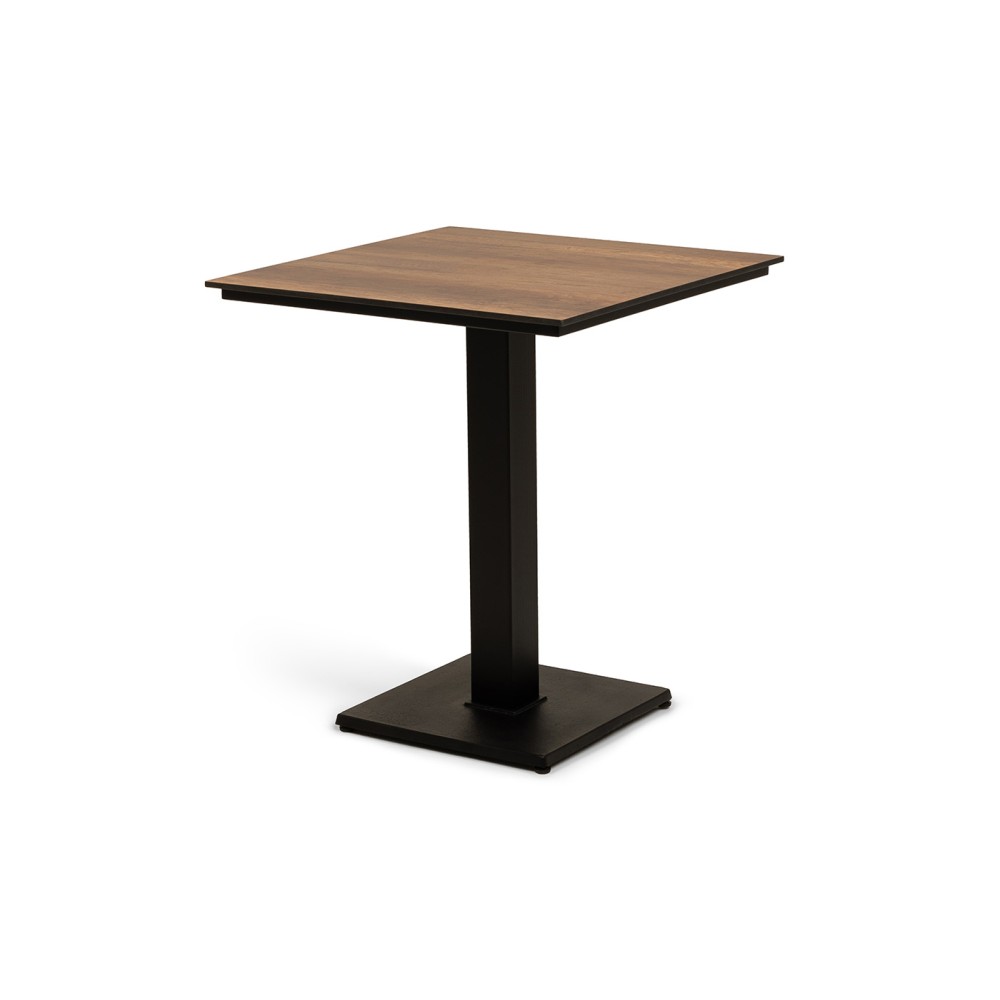 Квадратный интерьерный стол «Каффе» для двоих персон. Столешница выполнена из современного полимерного компакт-пластиком HPL, толщиной 10 мм, в цвете «дуб». Этот материал устойчив к высоким температурам (можно ставить горячую посуду), пролитой жидкости, не требует специального ухода. Подстолье изготовлено из чугуна, благодаря чему столик очень устойчив на любых поверхностях.
