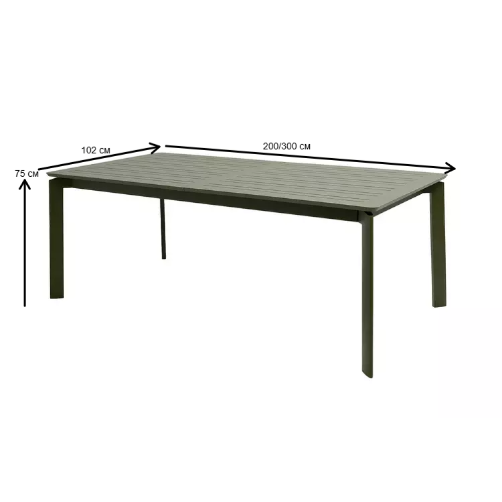 Особенности конструкции: Современный минимализм, сочетание графитового каркаса и столешницы в цвете «олива», надежный раздвижной механизм (200–300 см) для гибкости сервировки, эргономичная высота стола (75 см) для комфортной посадки, легкость конструкции для удобного перемещения