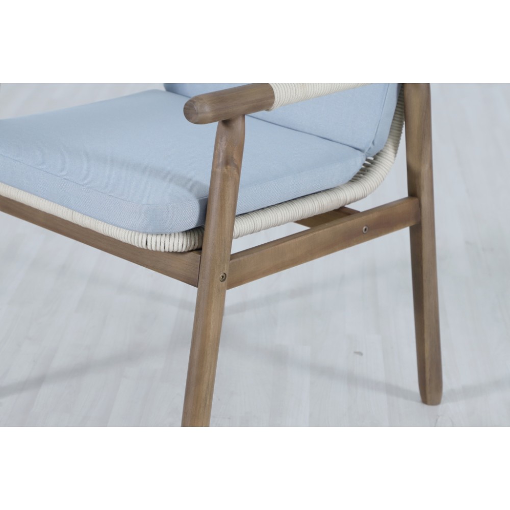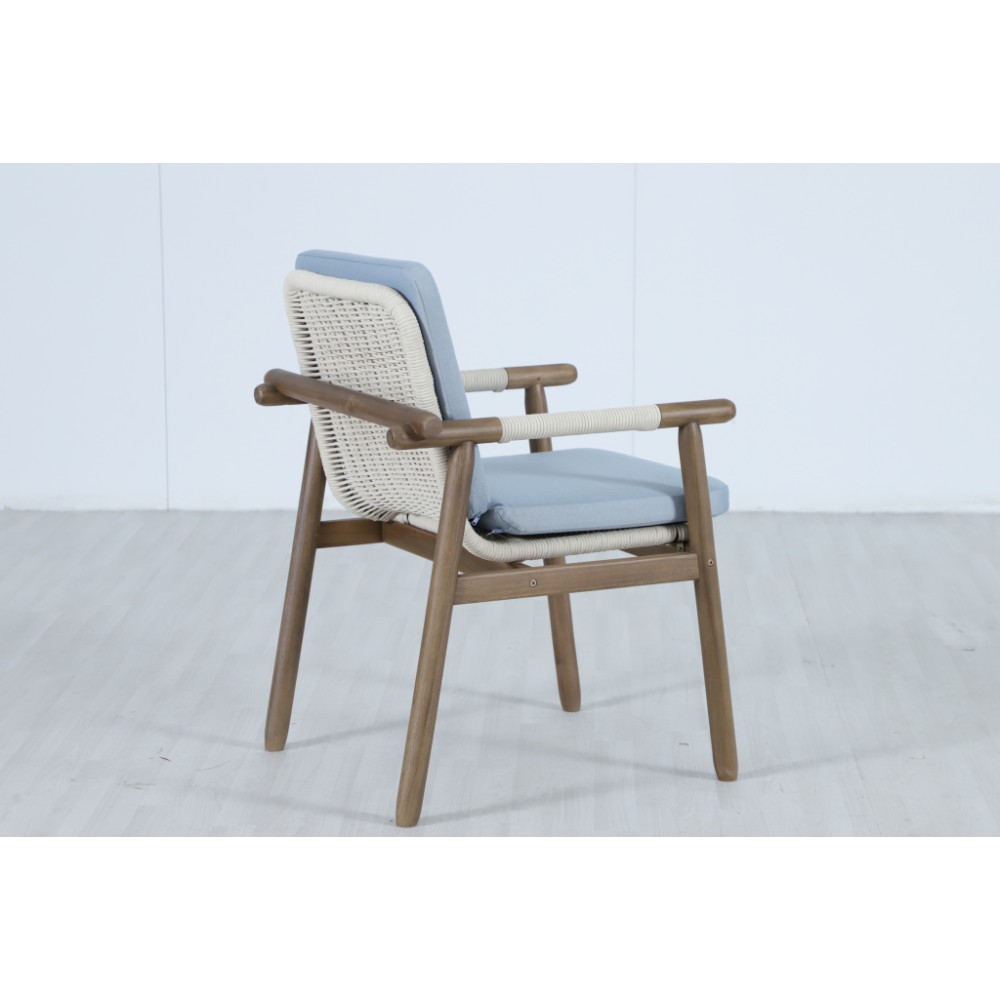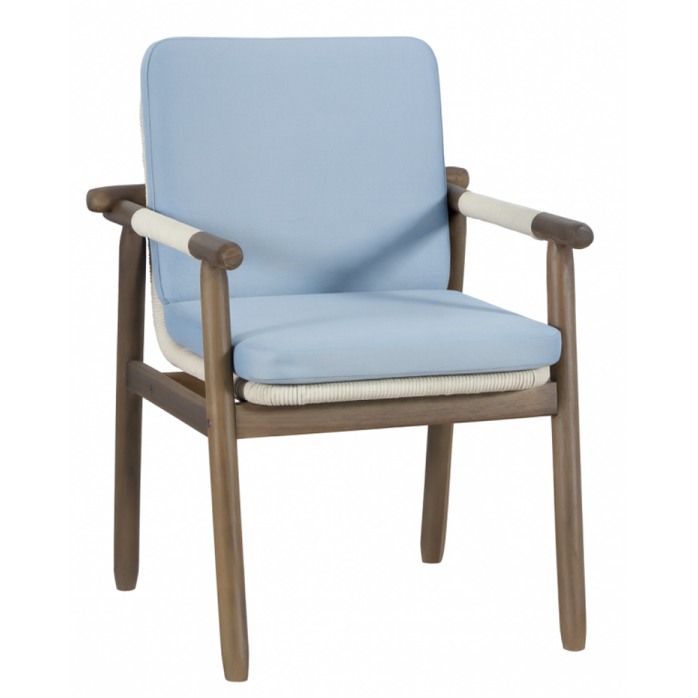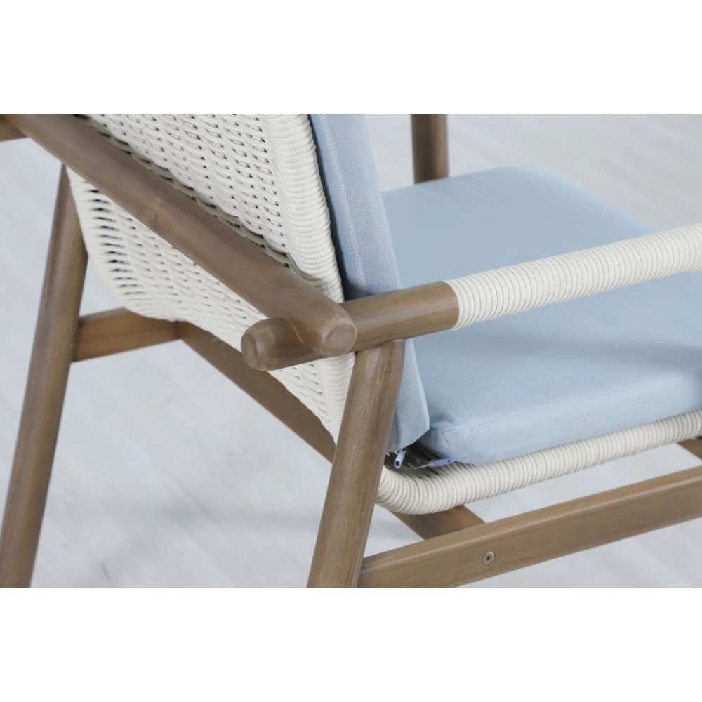 Apoyo - это стильная коллекция уличной мебели из массива АКАЦИИ, в которой сочетаются натуральное верёвочное (роуп) плетение, тёплая текстура дерева и комфортные подушки. Превосходноерешение для террасы или веранды, подходящее для тех, кто ценит долговечность и эстетический вид уличной мебели Особенности: Материал - АКАЦИЯ, отделка экомаслом грецкий орехTPW #4. Веревочное плетение роуп VPR - PR388на спинке, сиденье и подлокотниках излучает стиль в сочетании с деревянными поверхностями. Древесина, из которой изготовлена мебель, имеет сертификацию FSC (Forest Stewardship Council) - гарантия качества и происхождения древесины. Знак FSC - показатель того, что продукция происходит из леса, в котором ведется экологически и социально ответственное лесное хозяйство. Благодаря своей долговечности, прочности и устойчивости к вредителям эта древесина была создана для изготовления садовой мебели. Страна происхождения древесины: Вьетнам, Малайзия. Средняя плотность древесины: 550 кг/м³. Коррозионно-стойкая, анодированная фурнитура из нержавеющей стали. Подушки в комплекте, ткань подушек - олефин, наполнитель - толстый поролон. Материалы устойчивы к УФ-излучению и другим погодным воздействиям. Цвет подушек - голубой W1887-980.