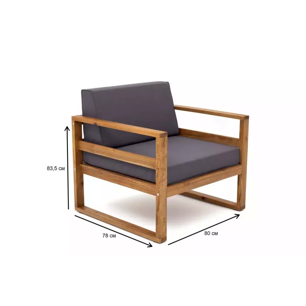 Элегантное и эргономичное место для уединенного отдыха, воплощающее сдержанную эстетику коллекции. Кресло БУКА выполнено из массива акации с теплой натуральной отделкой и дополнено мягкой подушкой цвета «темно-серый графит», создавая идеальный уголок для чтения, созерцания сада или неспешной беседы за чашкой кофе.