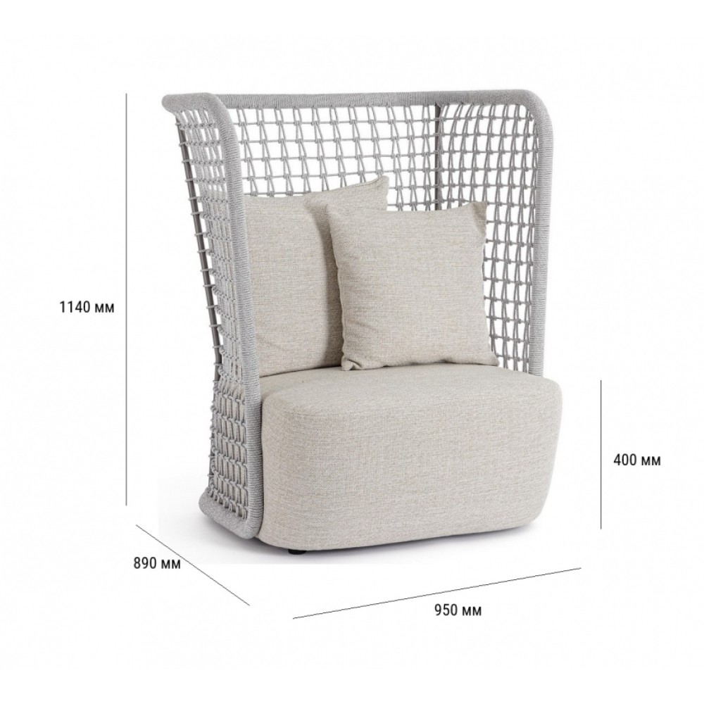 Минимальный заказ данной модели 1 шт. Уличное плетеное кресло Kollarидеально подходит для обстановки лаунж зон на террасах, летних площадок, зон возле бассейна. Особенности: Каркас выполнен из алюминия с порошковым покрытием (полиэстер) делает изделие устойчивым и надежным. Веревочное плетение из олефиновой ткани (100% полипропилен), благодаря которому кресло выглядит стильно в любом помещении или на открытой площадке. Сиденье с водонепроницаемым наполнителем, несъемный чехолиз олефина (100% полипропилен), водоотталкивающий и устойчивый к ультрафиолетовому излучению (7 класс). Подушка для спинки со съемным чехлом из олефиновой ткани (100% полипропилен) обеспечивает комфортный отдых. Открыть инструкцию по использованию и уходу. Для уточнения всех возможных вариантов материала и цвета данного изделия обращайтесь к нашим менеджерам.