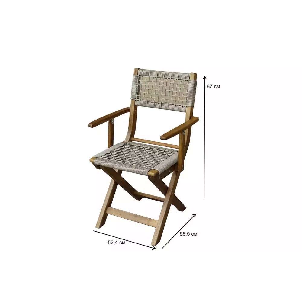 Особенности конструкции: Современный минимализм, сочетание массива акации и натурального веревочного плетения Роуп, складная конструкция для экономии места, удобные подлокотники для расслабления рук, эргономичная высота спинки, комфортная глубина посадки
