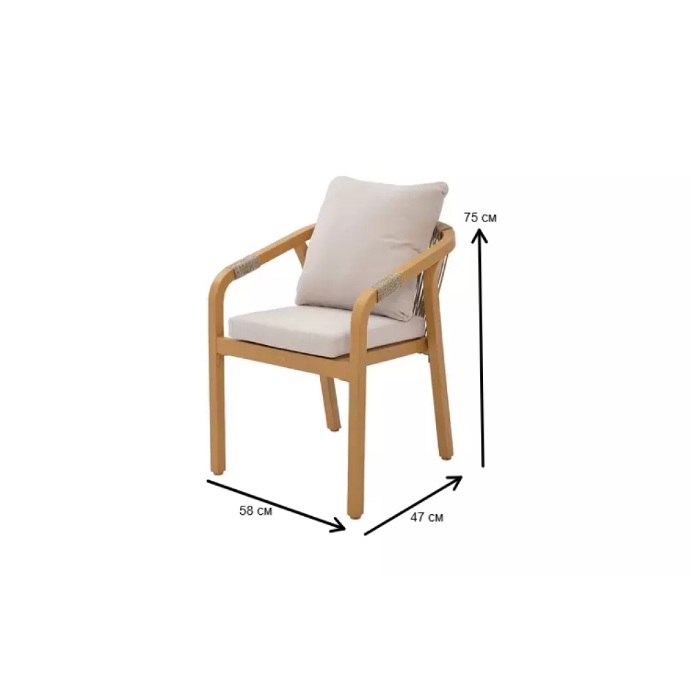 Особенности конструкции: Современный минимализм, сочетание массива акации и натурального веревочного плетения Роуп, эргономичная высота спинки, комфортная глубина посадки (47 см), мягкая подушка в комплекте
