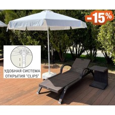 •  Классический зонт. Универсальное решение с центральной стойкой. Простая установка, подходит для любого стола. Диаметр 2-3 м — оптимален для 4-6 персон.