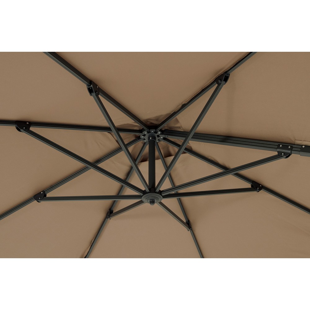 Толщина опоры зонта 110×80 мм. Конструкция состоит из 16 длинных спиц (196 см - 8 шт. и 147 см - 8 шт.). Высота от земли до нижнего края купола - 220 см.