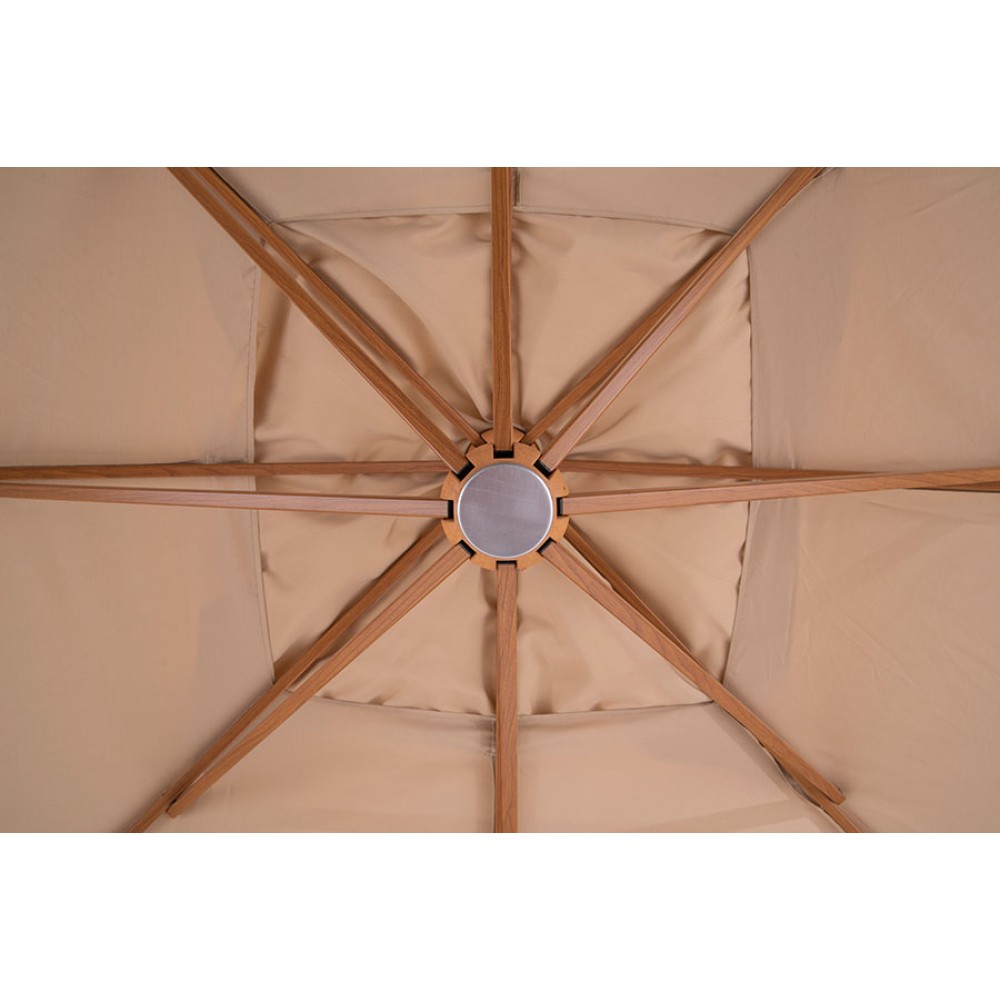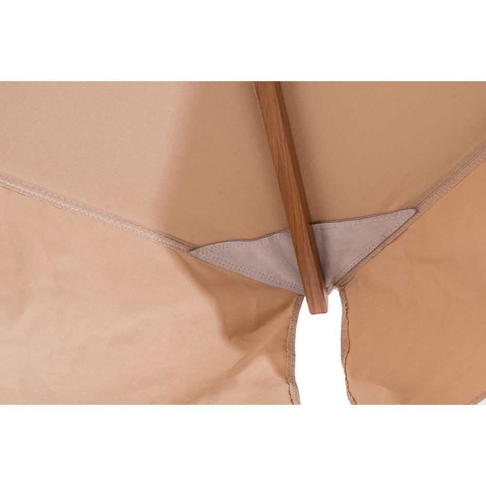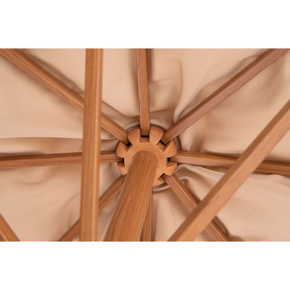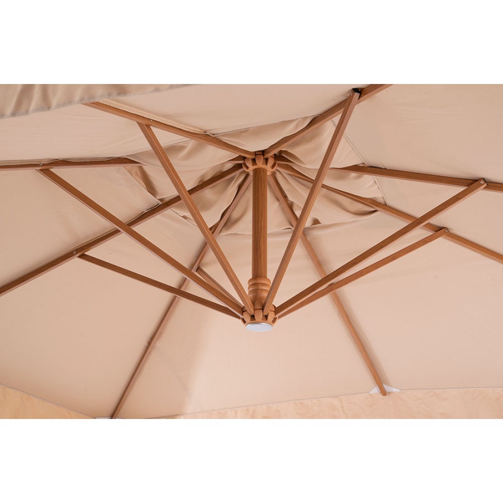 Зонт состоит из восьми алюминиевых спиц и алюминиевой боковой опоры из двух частей, соединенных стальной основой.