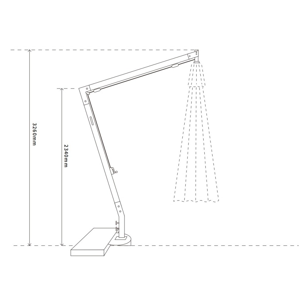 Общая высота зонта - 326 см, высота от земли до нижнего края купола - 228 см.