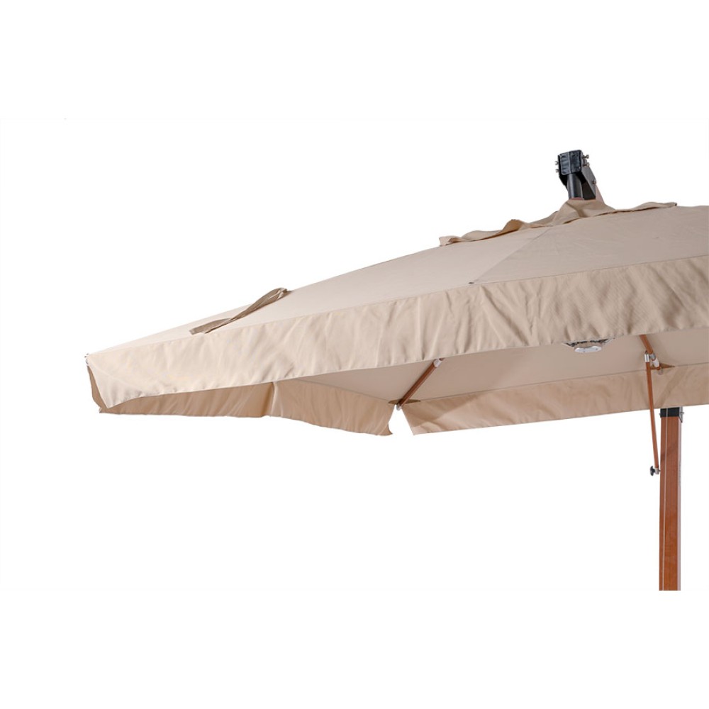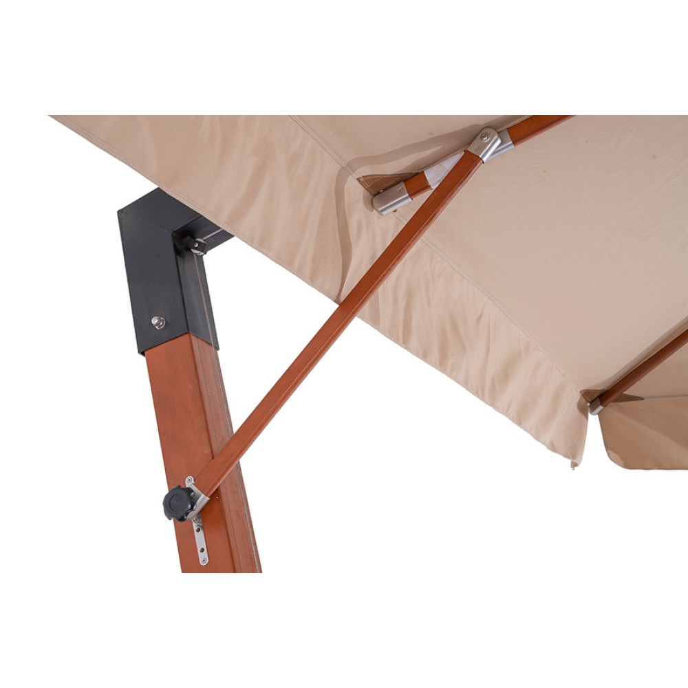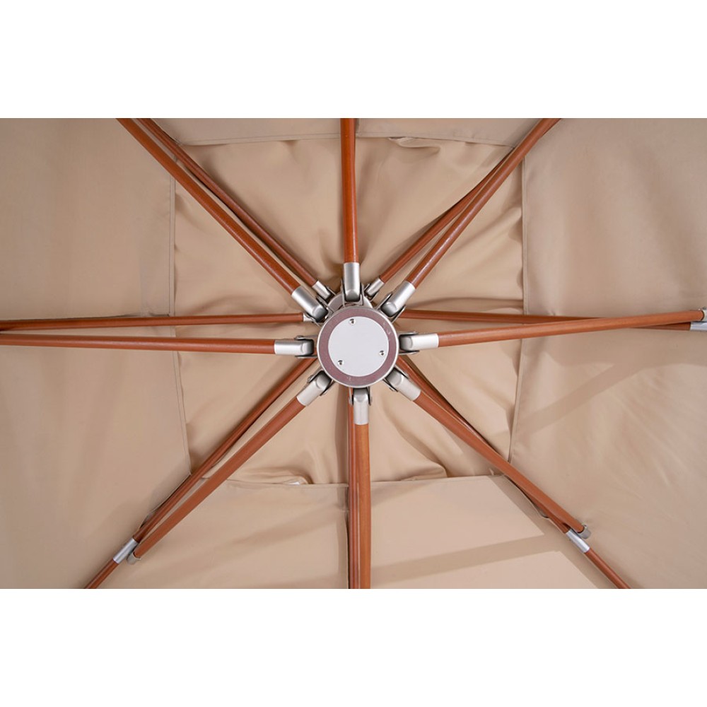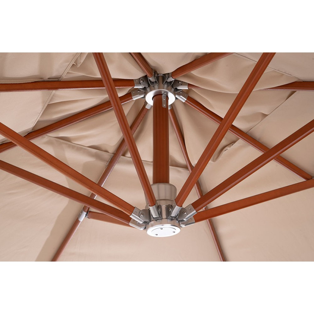 Зонт оснащен деревянной ступицей с алюминиевой защитой и рукояткой с автоматической блокировкой и вращающимся механизмом на 360°, что позволяет раскрывать купол в любое необходимое положение. Диаметр вращения рукоятки - 11 см.