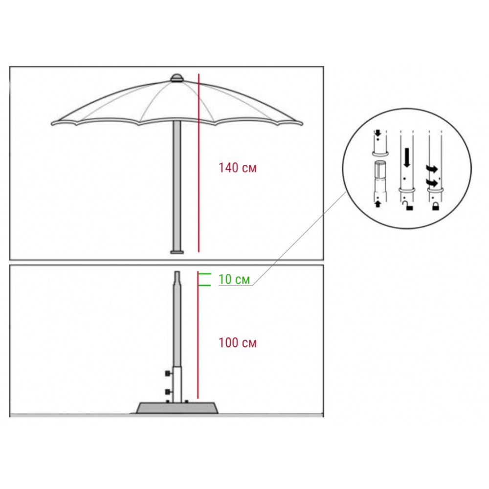 Зонт Cezanne- элегантная модель для оборудования морских пляжей. Он также прекрасно подходит для бассейнов, садов, летних площадок ресторанов, гостиниц.Легко сочетается с различными моделями лежаков, шезлонгов и кресел Magnani. Особенности модели: опора (диаметр 40 мм, длина 1400 мм) выполнена из анодированного алюминия; байонетная система блокировки во время ветра; система безопасного открытия/закрытия Diamante; ручка из нержавеющей стали; 10 спиц из оцинкованной и окрашенной стали, стойкие к действию соленой воды и других атмосферных явлений (100/10 cm/n°); купол выполнен из ткани Tempotest Para mare - 100% окрашенный акрил плотностью 290 г/м², гарантия от выцветания в течение 6 лет. по запросу доступныдополнительные аксессуары:пластиковый столик, база для зонта, пепельница, ветровой клапан (приобретаются отдельно). В комплект входитнижняя алюминиевая стойка (Lower Pole) Ø40 мм. Высота стойки может составлять 800 мм, 1000 мм, 1200 мм. Может быть выполненас острием или без. Посмотреть технические характеристики модели.