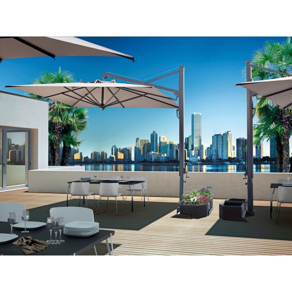 Профессиональный зонт Galileo Dark - модель с обновленной выдвижной системой открытия-закрытия зонта, которая позволяет легко закрывать зонт, не передвигая мебель. Это лучшая система, разработанная Scolaro, которая имеет несомненные преимущества: функциональность; эстетичность; возможность легко отремонтировать (заменить) испорченные детали. Зонт Galileo Dark имеет уникальную конструкцию, которая позволяет легко отсоединить зонт от каркаса, например для очистки ткани зонта или замены спиц. Однако, не рекомендуется проделывать эту операцию слишком часто - это может привести к поломке механизма закрытия зонта. Каркас и спицы выполнены из алюминия с порошковым покрытием цвета антрацит, аксессуары - из нейлона. Специальное крепление к опоре (Wind Stop) для лучшей устойчивости в ветренную погоду и для обеспечения наклона зонта. Возможность наклона зонта на 60°. Купол выполнен из акрила 350 г/м² с пропиткой. Варианты цвета: слоновая кость (A1), терракота (T2), бордовый (T3), серо-коричневый (T6), белый (T7), серебристо-серый (T8), антрацит (T9), черный (S1). Цена на сайте указана для зонта с куполом в цвете слоновая кость (A1) без волана. По запросу доступно выполнение купола из акрила Special Collection класса A и B (минимальный заказ 5 шт.). Технические характеристики: высота до кромки открытого зонта: 2400 мм; высота до кромки закрытого зонта: 500 мм. общая длина: 4400 мм (включая базу), общая ширина: 3500 мм. Посмотреть технические характеристики. Посмотреть инструкцию по установке зонта. Таблица выбора утяжелительных баз для стабилизации зонта. В комплект поставки входит: Каркас с поворотным механизмом (360°). Купол, механизм открытия-закрытия, вентиляционная заглушка (ветровой клапан). Система быстрой замены спиц "Easy Change". База для утяжелительных плит. Открыть инструкцию поэксплуатации уличных зонтов. Компания Scolaro создана 40 лет назад и была известна как ремесленное производство деревянных зонтиков. Традиционные позиции и современные знания позволили Scolaro выпускать широкий спектр зонтов, которые позволяют не только укрываться от солнца и дождя, но и являются прекрасным дополнением интерьера стильных заведений. Дизайн, новые технические решения и сочетание высококачественных материалов имеют решающее значение для технической эволюции зонтов Scolaro, процесс производства которых является полностью итальянским. Наша компания - официальный эксклюзивный дистрибьютор фабрики Scolaro Mario & Fabio srl. в России. На все зонты компании Scolaro предоставляется сервисное и гарантийное обслуживание. Для того, чтоб зонт прослужил долго, воспользуйтесь инструкциями по эксплуатации и хранению зонтов.