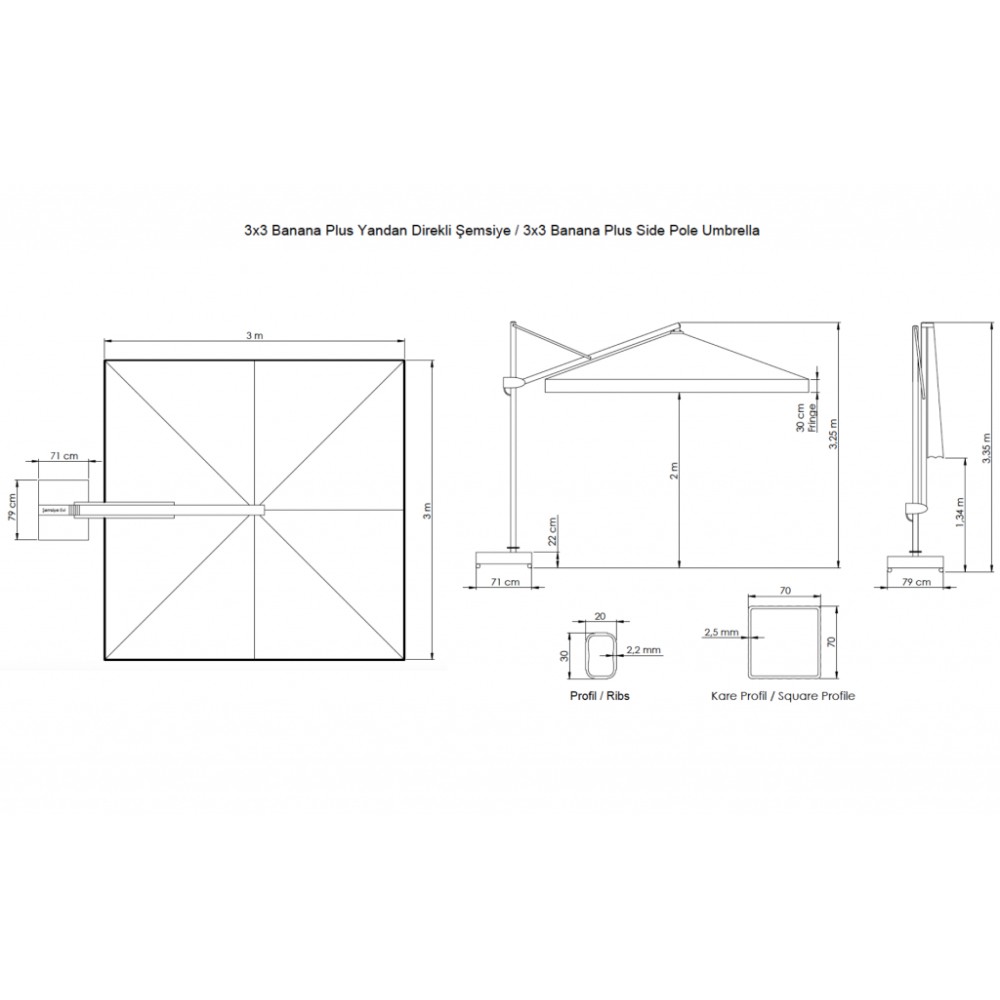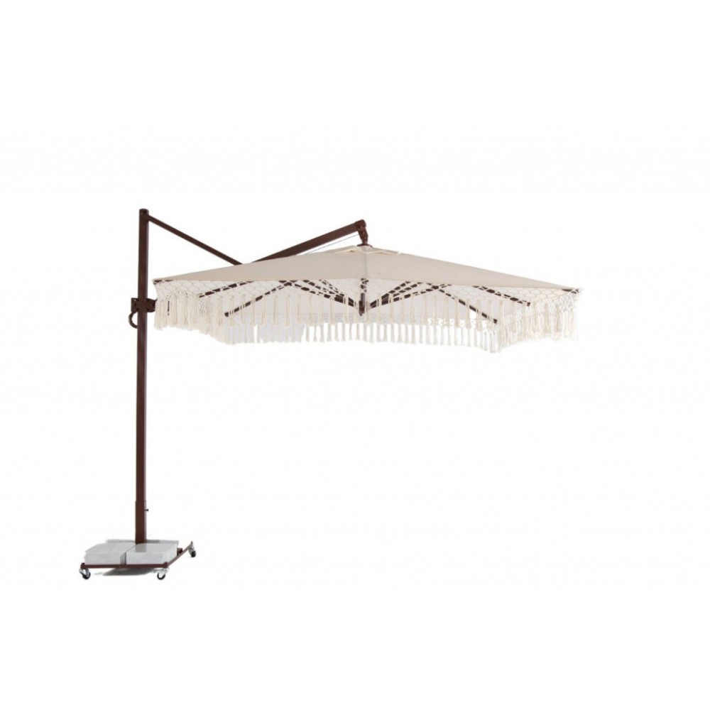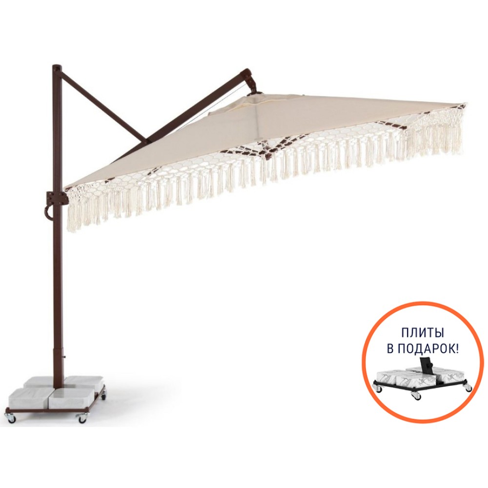 Banana Plus Boho- модель компании THEUMBRELA, сочетающая в себе высококачественные материалы, впечатляющие технологии и простое управление. Это особенный продукт для тех, кто ищет стильный дизайн, стильный внешний вид и функциональность среди зонтов с боковой опорой.Вязаный крючком зонт представляет собой идеальное тенистое место, которое добавит роскоши пляжному пространству. Зонт легко открывается и закрывается при помощи рукоятки, а сам механизм блокируется для безопасности. Купол может подниматься под углом до 60°. Для того, чтобы закрыть или открыть зонт Banana Plus, не нужно двигать мебель под ним. Эффектный зонт в стиле бохо с бахромой, кисточками и орнаментом на 100% изготовлен в Турции и идеально подходит для пляжа, открытой летней площадки кафе, ресторана, праздничной церемонии на открытом воздухе, а также станет прекрасным украшением частного двора и сада. Нейтральный оттенок делает зонт чрезвычайно универсальным, чтобы органично вписаться в любое пространство. Особенности: Боковая опора сечением 70х70 мм и толщиной стенки 2.5 мм выполнена из окрашенного алюминия со специальной термообработкой, которая повышает прочность и коррозионную стойкость зонта. Высота опоры - 3100 мм. 8 спиц из алюминия сечением 20х30 мм и толщиной стенки 2 мм. Термообработанный и усиленный кронштейн и каркас. Прочные пластиковые детали и соединительные элементы. В комплект входит металлическая база на колесах, размер: 790х710х60 мм, с мраморными утяжелителями, размер: 340х340х120 мм. Вес базы 24 кг, каждый утяжелитель 34 кг. Общий вес базы 160 кг. Размер упаковки: 850х750х100 мм. Функцию вращения на 360º можно приобрести дополнительно. Покрытие опоры и спиц можно выбрать из представленной палитры. Возможно выполнение купола из тканей: полиэстер, олефин. Цвет купола из ткани олефин можно выбрать из представленной палитры. Вес ткани купола 10 кг, объем 0,2 м3. Волан связан крючком из полиэфирного шнура. Открыть инструкцию поэксплуатации уличных зонтов. Обращаем Ваше внимание! Плиты идут в подарок к зонту! В норме допускаются незначительные сколы и царапины мрамора по периметру, т.к. мрамор - это природный материал. На плиты рекламации не принимаются, Вы имеете право безвозмездно отказаться от них. Цена на сайте указана за модель с коричневым каркасом и куполом из бежевого полиэстера. Цены на другие модели Вы можете уточнить у менеджеров.
