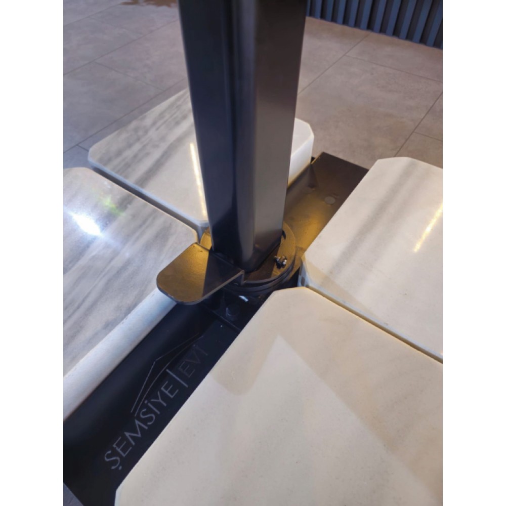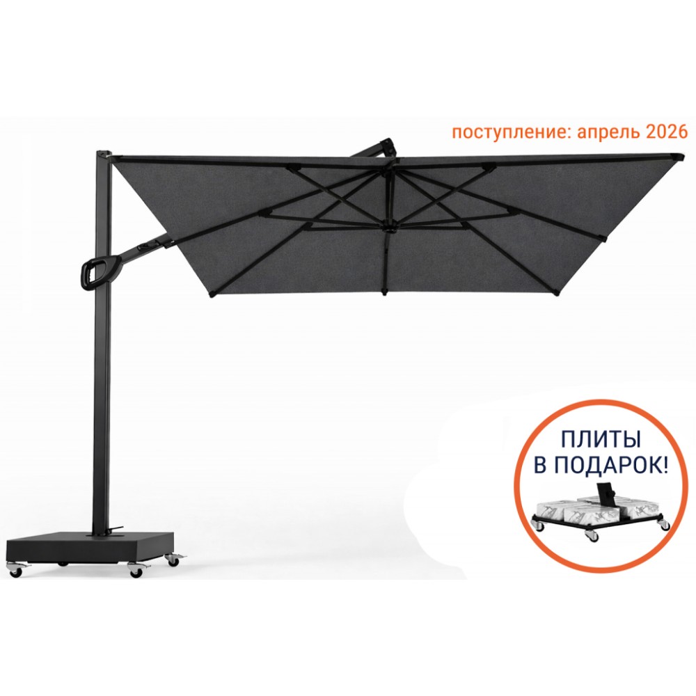 Banana Plus Prime- новейшая модель компании THEUMBRELA, сочетающая в себе высококачественные материалы, впечатляющие технологии и простое управление. Это особенный продукт для тех, кто ищет крутой дизайн, стильный внешний вид и функциональность среди зонтов с боковой опорой. Зонт легко открывается и закрывается при помощи рукоятки, а сам механизм блокируется для безопасности. Купол может подниматься под углом до 60°. Для того, чтобы закрыть или открыть зонт Banana Plus, не нужно двигать мебель под ним. ОтличияBanana Plus PrimeотBanana Plus: Гладкий профиль (классическая модель имеет рифленый). Трос спрятан внутри профиля. Современная ручка для открытия зонта. Особенности: Боковая опора сечением 70х70 мм и толщиной стенки 2.5 мм выполнена из окрашенного алюминия со специальной термообработкой, которая повышает прочность и коррозионную стойкость зонта. Высота опоры - 3100 мм. 8 спиц из алюминия сечением 20х30 мм и толщиной стенки 2 мм. Термообработанный и усиленный кронштейн и каркас. Прочные пластиковые детали и соединительные элементы. В комплект входит металлическая база на колесах, размер: 790х710х60 мм с утяжелителями. Функция вращения на 360º входит в комплектацию. Покрытие опоры и спиц черного цвета. Купол без волана выполнен из акрила 2831 (mineral). Дополнительно можно приобрести подсветку (заказать можно ТОЛЬКО совместно с зонтом, отдельно не приобретается). Открыть инструкцию поэксплуатации уличных зонтов. Обращаем Ваше внимание! Плиты идут в подарок к зонту! В норме допускаются незначительные сколы и царапины мрамора по периметру, т.к. мрамор - это природный материал. На плиты рекламации не принимаются, Вы имеете право безвозмездно отказаться от них. Цена на сайте указана за модель с каркасом черного цвета и куполом из акрила. Цены на другие модели Вы можете уточнить у менеджеров.