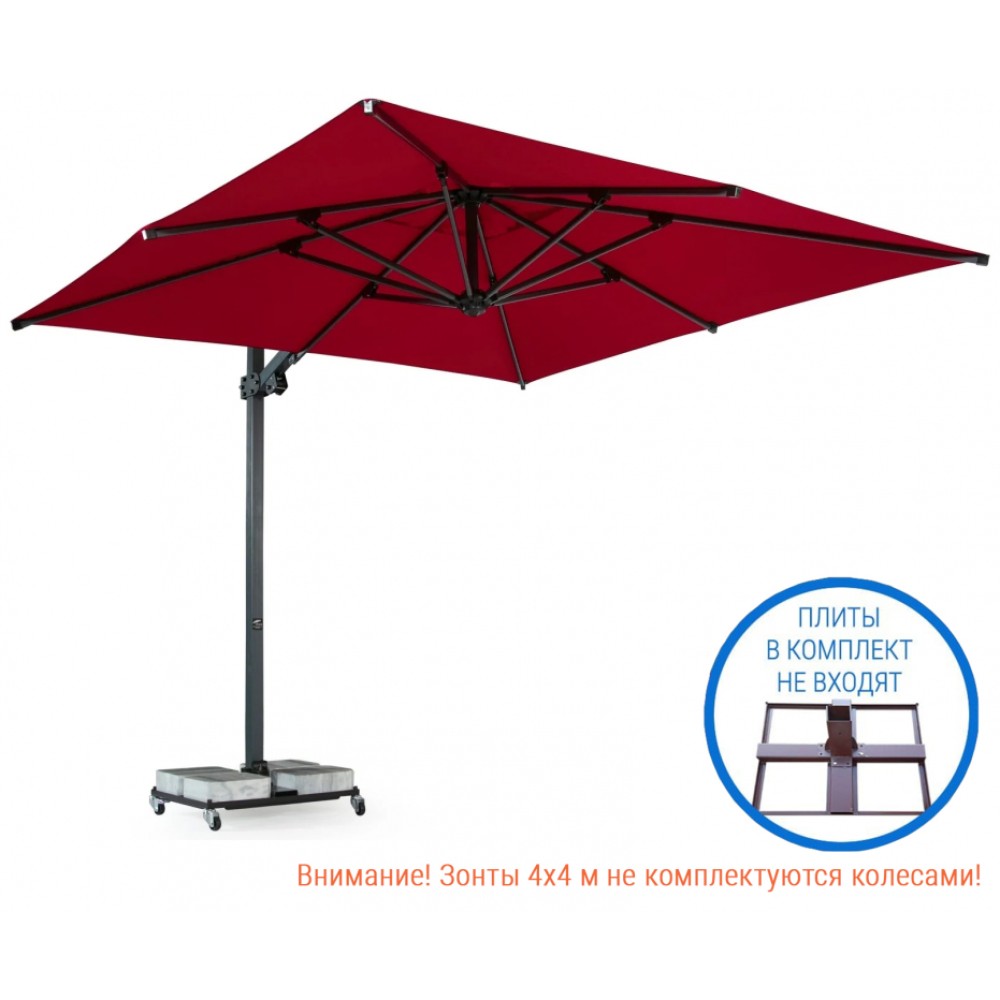 Banana Plus - новейшая модель компании THEUMBRELA, сочетающая в себе высококачественные материалы, впечатляющие технологии и простое управление. Это особенный продукт для тех, кто ищет крутой дизайн, стильный внешний вид и функциональность среди зонтов с боковой опорой. Зонт легко открывается и закрывается при помощи рукоятки, а сам механизм блокируется для безопасности. Купол может подниматься под углом до 60°. Для того, чтобы закрыть или открыть зонт Banana Plus, не нужно двигать мебель под ним. Особенности: Боковая опора сечением 100х100 мм и толщиной стенки 2 мм выполнена из окрашенного алюминия со специальной термообработкой, которая повышает прочность и коррозионную стойкость зонта. Высота опоры - 3660 мм. 8 спиц из алюминия сечением 20х30 мм и толщиной стенки 2.2 мм. Термообработанный и усиленный кронштейн и каркас. Прочные пластиковые детали и соединительные элементы. В комплект входит металлическая база 950х950 мм без колес и утяжелителей. Дополнительно можно приобрести утяжелительные плиты, арт. AVT/TR-4040-10. Необходимое количество плит на 1 зонт: 8 шт. Функцию вращения на 360º можно приобрести дополнительно. Покрытие опоры и спиц можно выбрать из представленной палитры. Возможно выполнение купола из тканей: бежевый полиэстер, акрил. Цвет куполаможно выбрать из представленной палитры. Открыть инструкцию поэксплуатации уличных зонтов. Цена на сайте указана за модель с куполом из ткани акрил. Цены на другие модели Вы можете уточнить у менеджеров.