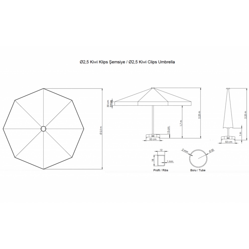 Kiwi Clips- профессиональный зонт с центральной опорой из алюминия, что обеспечивает высокую устойчивость модели. Он защитит от ярких солнечных лучей и создаст приятную затененную атмосферу в частных садах, открытых летних площадках кафе, баров и ресторанов, зоны возле бассейна. Это больше, чем зонт, с его эстетичным и стильным внешним видом, простотой открытия и закрытия, долговечностью и дополнительными функциями, такими как журнальный столик и пепельница. Система зажимов, используемая зонте Kiwi Clips, работает по логике, аналогичной ручным зонтам. В отличие от ручных зонтов, сила, используемая для открывания и закрывания, исходит от натяжения ткани зонта. Нажимая пластиковый корпус вверх, зонт открывается. После прохождения определенного места гибкость ткани берет на себя силу, приложенную к пластиковому корпусу, и зонт остается полностью раскрытым и зафиксированным. Если опустить пластиковый корпус, и зонт закроется. Особенности: Открывается легким движением руки, с плавным ходом и надежной фиксацией. Центральная опора Ø35 мм, столщинойметалла 2 мм, выполнена из алюминия.Алюминий окрашен и прошел специальную термообработку, которая повышаетпрочность и коррозионную стойкость зонта. 8 спиц 12х18,с толщиной металла 1 мм, выполнены из алюминия. Высота зонта2100 мм , в открытом виде до спиц - 1800 мм. Детали выполнены из цельного пластика. Возможно выполнение купола из тканей: полиэстер, акрил. Покрытие опоры и спиц можно выбрать из представленной палитры. Возможно выполнение зонта с наклонным механизмом, +20% к стоимости изделия. Дополнительно можно приобрести утяжелительнуюбазувесом 50 кг. Цена на сайте указана за модель с куполом из акрила. Цены на другие модели Вы можете уточнить у менеджеров.