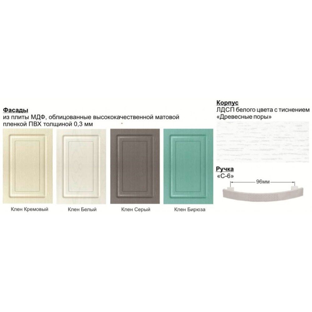 — Корпус из ЛДСП белого цвета с тиснением «Древесные поры», фасады из плиты МДФ, облицованные высококачественной матовой пленкой ПВХ толщиной 0,3 мм