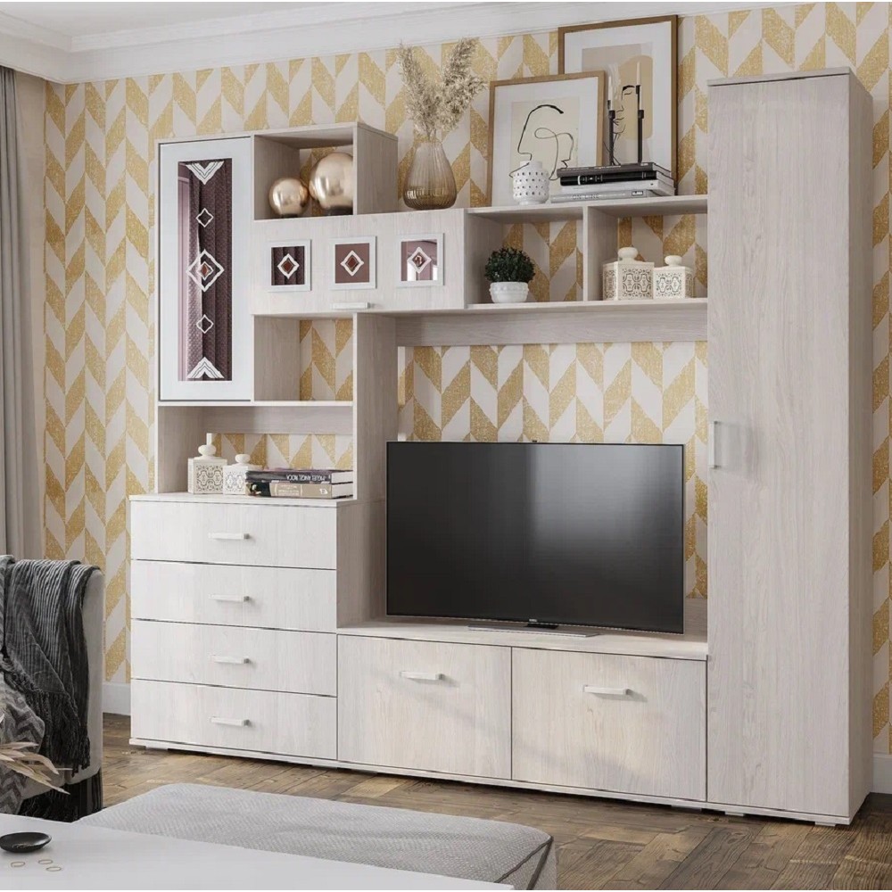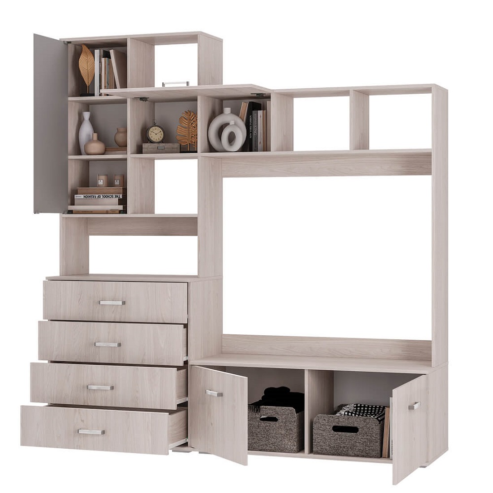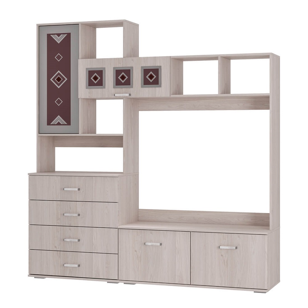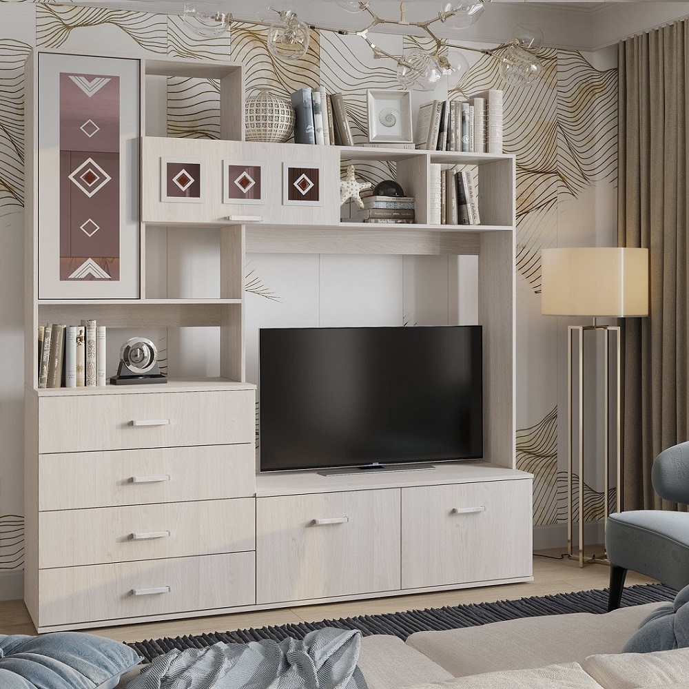 Центральная секция Белла в декоре «ясень белый» — это стильный и функциональный элемент мебели, который добавит изысканности и уюта в ваш интерьер. Центральная секция Белла состоит из комода с четырьмя выдвижными ящиками, тумбы под телевизор (размер ниши 118.4х102.4х47 см) и множества полок для хранения книг, посуды и других предметов. Секция выполнена в приятном древесном декоре «ясень белый», оснащена витражными стеклянными вставками и стильной фурнитурой.