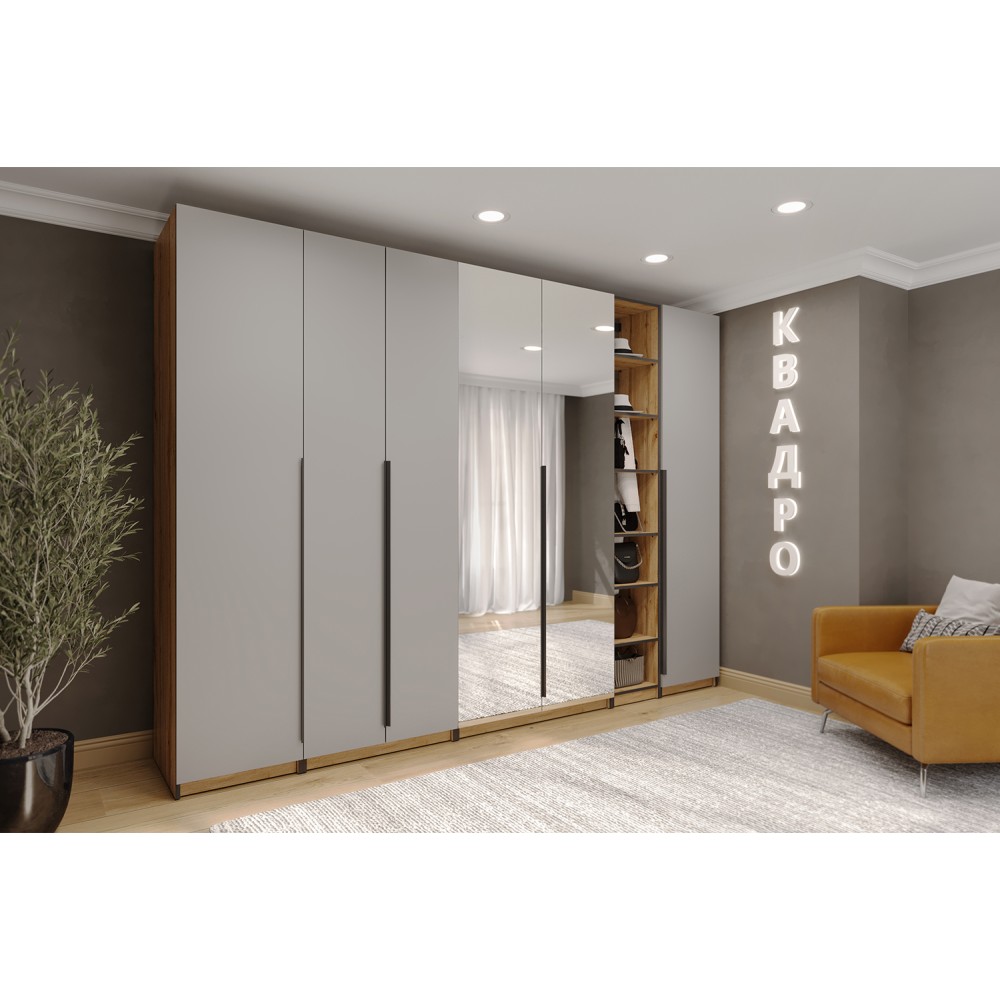 Гардеробная система Квадро это максимальная лаконичность и высокая рациональность современного стиля. Продуманное внутреннее наполнение модели навсегда решит вопрос с хранением предметов гардероба – просторные полки, платяные отделения и выдвижные ящики легко разместят все необходимое. Шариковые направляющие обеспечат комфортное бесшумное выдвижение ящиков. Качественные петли с доводчиком защитят от громких хлопков фасадов. Стильная черная фурнитура послужит интересным акцентом.