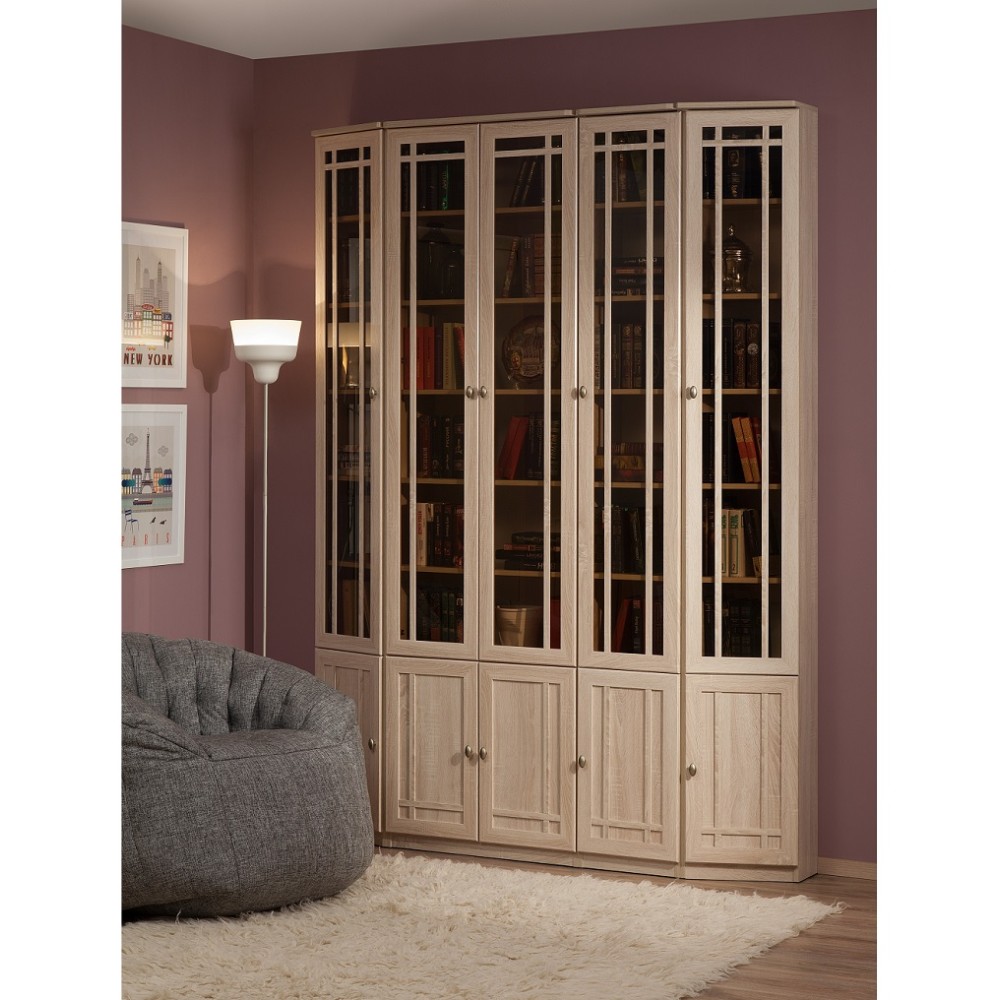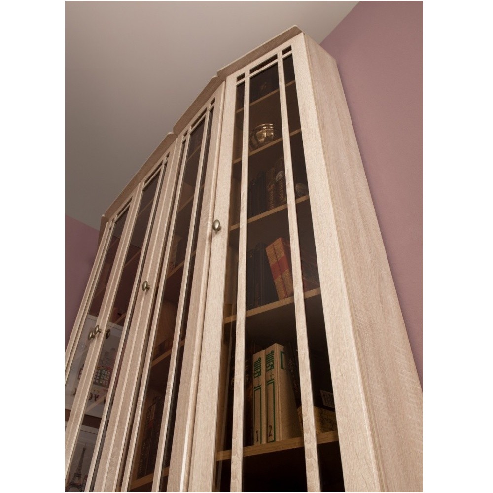 Идеальным местом для обустройства библиотеки в квартире является домашний кабинет. В нем Вы сможете заняться важными делами в спокойной обстановке или просто почитать любимую книгу. Благодаря модульности, библиотеку SHERLOCK можно расположить в Вашем домашнем кабинете, выбрав для компоновки именно те модули, которые Вам нужны. Письменный стол, расположенный у окна, сделает чтение и работу с документами максимально комфортным. В высоких изящных шкафах библиотеки SHERLOCK поместятся книги любого формата: от самых маленьких книг до больших иллюстрированных альбомов, поскольку Вы сами можете регулировать высоту полок. Тонированные стекла фасадов высоких книжных шкафов защитят книги от прямых солнечных лучей, пожелтения страниц, пыли и позволят без проблем найти нужную книгу. Завершающие модули библиотеки SHERLOCK: SHERLOCK 34 и 35 Шкаф для книг, позволят создать гармоничную и, в то же время, изысканную атмосферу в кабинете. Библиотека выполнена в одном декоре и стиле с гостиной SHERLOCK — Дуб Сонома. Поэтому из е