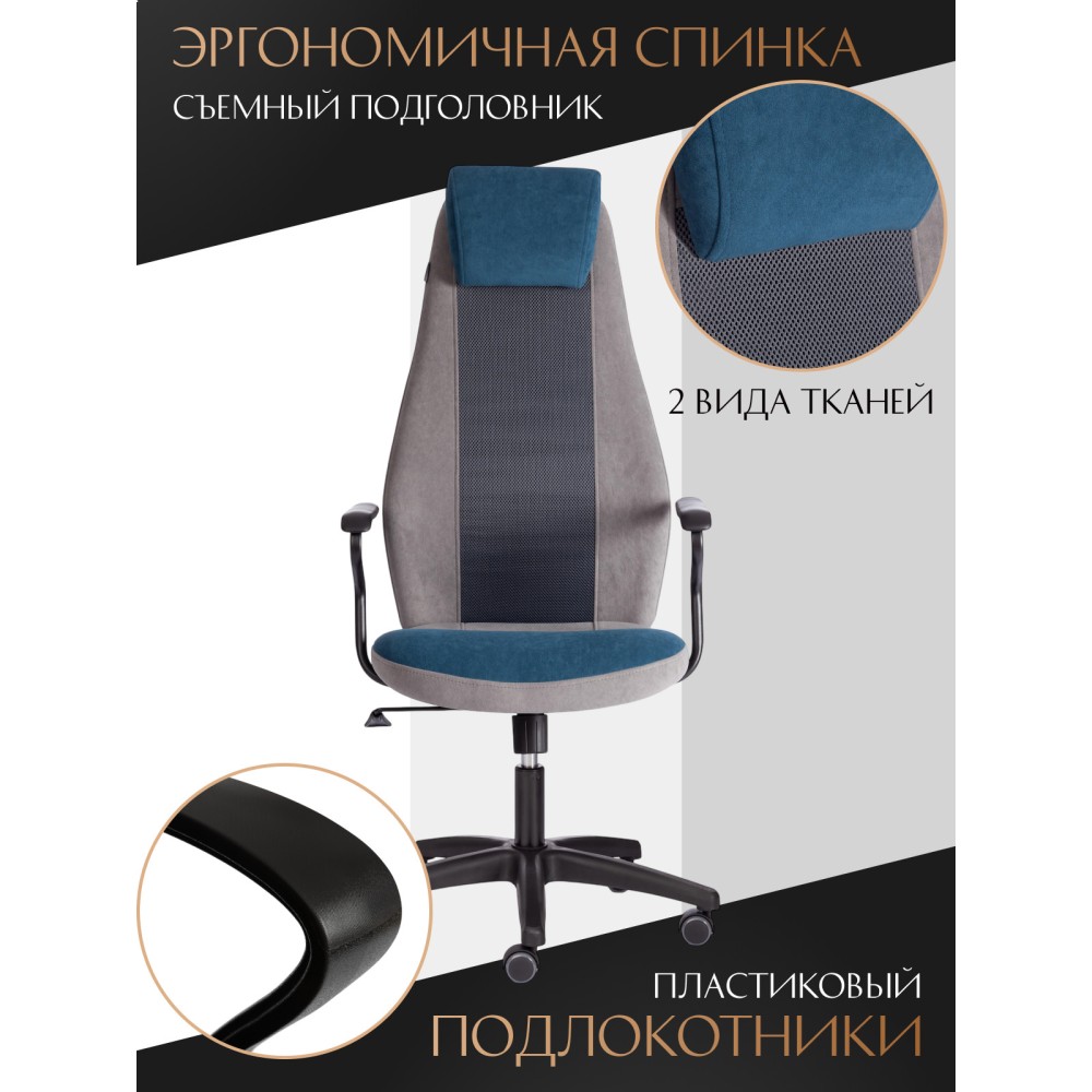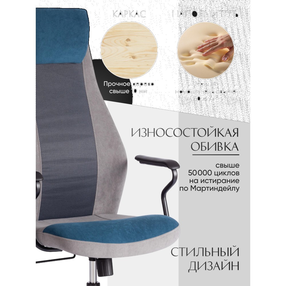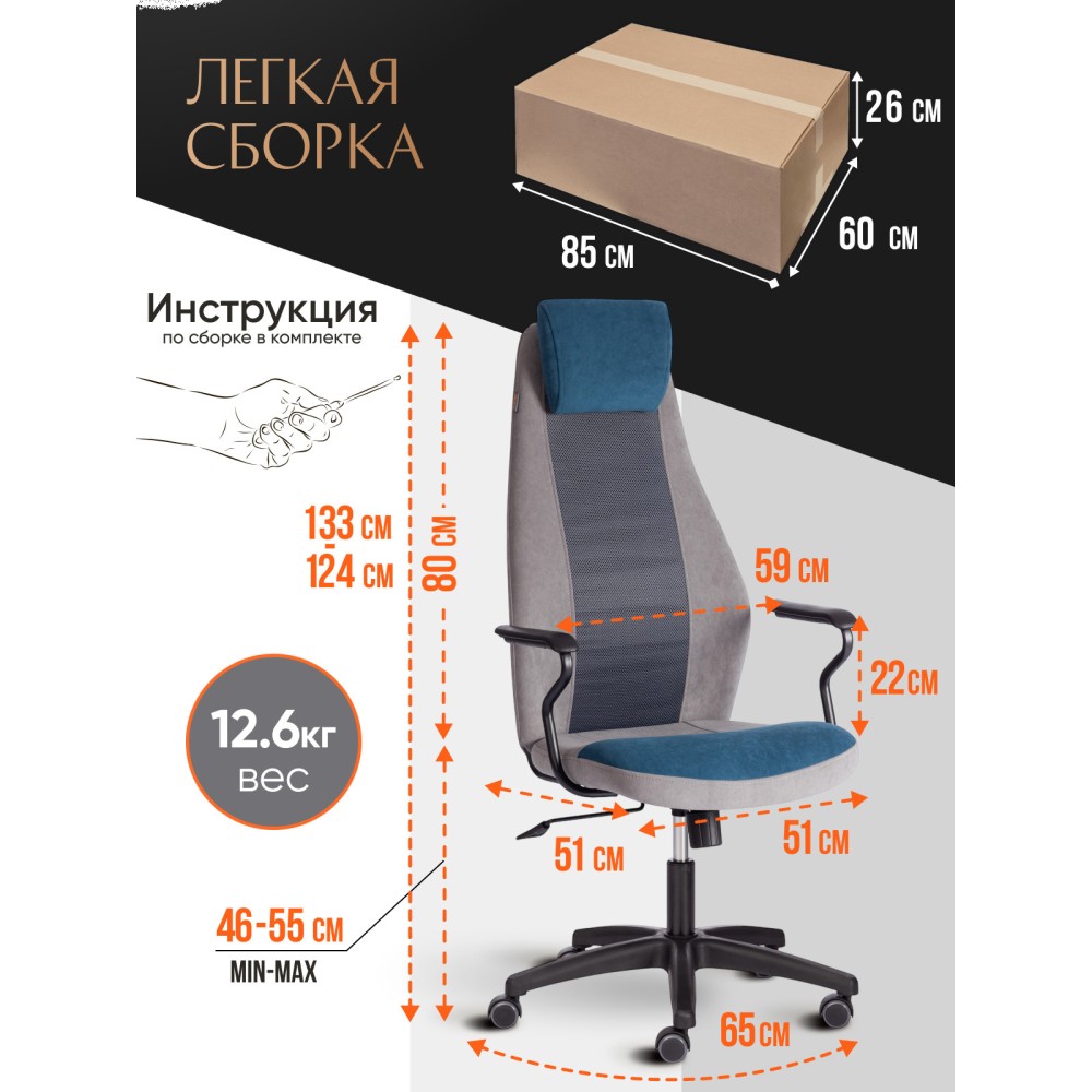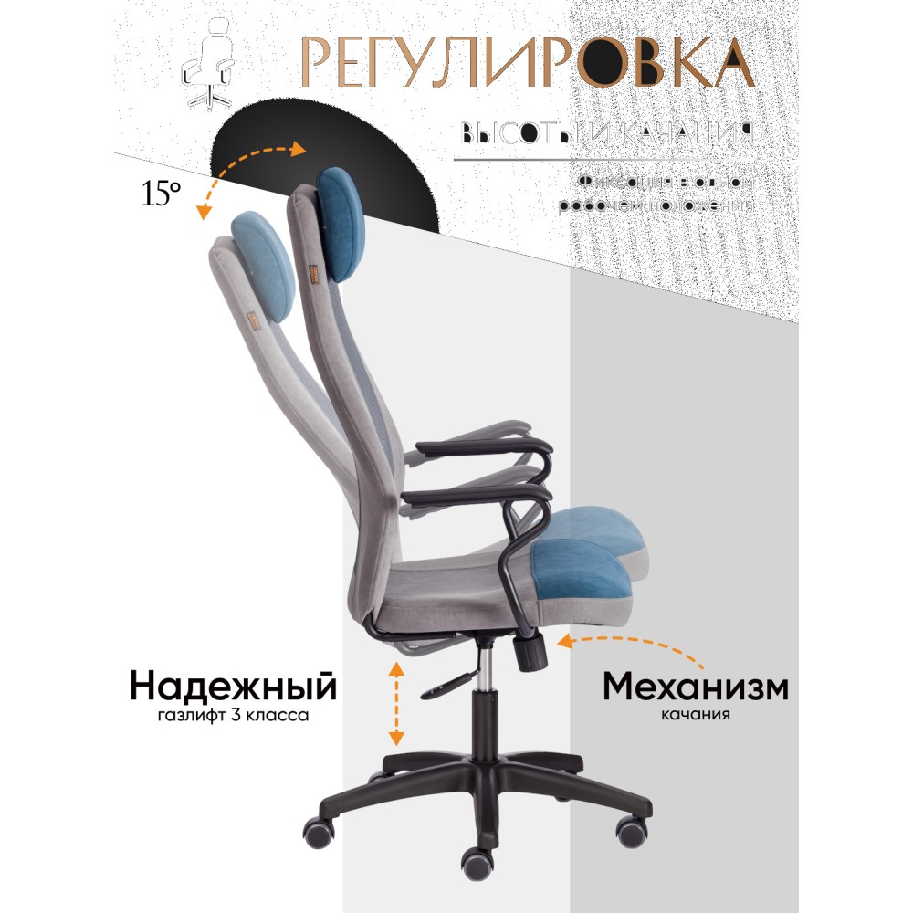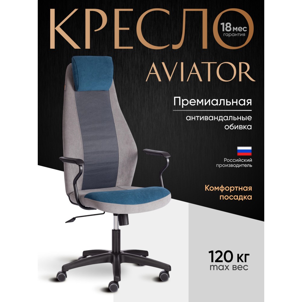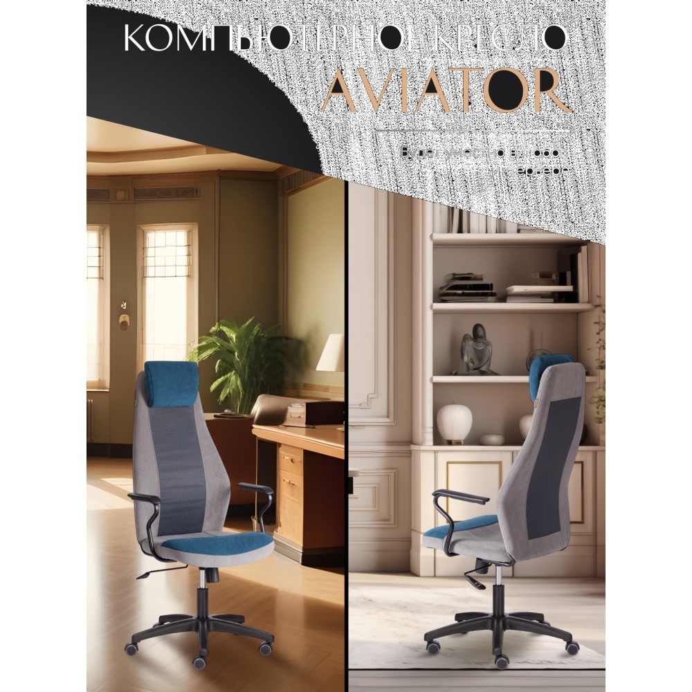 Компьютерное кресло AVIATOR - удачное сочетание привлекательности, эргономичности и функциональности. Стильная модель будет отлично смотреться в любом рабочем кабинете. 5-лучевая крестовина диаметром 650 мм устойчива, прочна и имеет долгий срок службы. Фиксированные подлокотники из металлической трубы диаметром 19 мм с пластиковой накладкой, механизм изменения высоты сиденья и угла наклона до 15 градусов с возможностью фиксации в рабочем положении, настраиваемый подголовник на липучке позволят принять комфортную позу, снять напряжение с позвоночника. Высококачественные полиамидные ролики дополнительно прорезинены для предотвращения повреждения напольного покрытия. Отлично подходят для использования на паркете и ламинате. Диаметр штока ролика – 11 мм. Для максимального удобства кресло оснащено наполнителем из пенополиуретана (ППУ) плотностью не менее 30 кг/м3. Модель обита износостойким флоком плотностью 320 г/м2 с водоотталкивающей пропиткой. Такой материал не требует сложного ухода, долговечен, выглядит стильно и привлекательно. Однослойная сетчатая обивка плотностью 280 г/м2 обеспечит вентиляцию и добавит комфорт в жаркое время года. Кресло оборудовано надежным газлифтом 3 класса с ходом 100 мм. Серый и синий цвета отлично сочетаются между собой, подчёркивая элегантность и уникальность модели. Компьютерное кресло AVIATOR станет незаменимым предметом интерьера, прекрасно впишется в рабочий кабинет офиса или дома, удивит вас своей долговечностью, удобством и отличными эксплуатационными качествами. Модель поставляется в разобранном виде. Необходима простая сборка по прилагаемой инструкции. Максимальная нагрузка 120 кг.