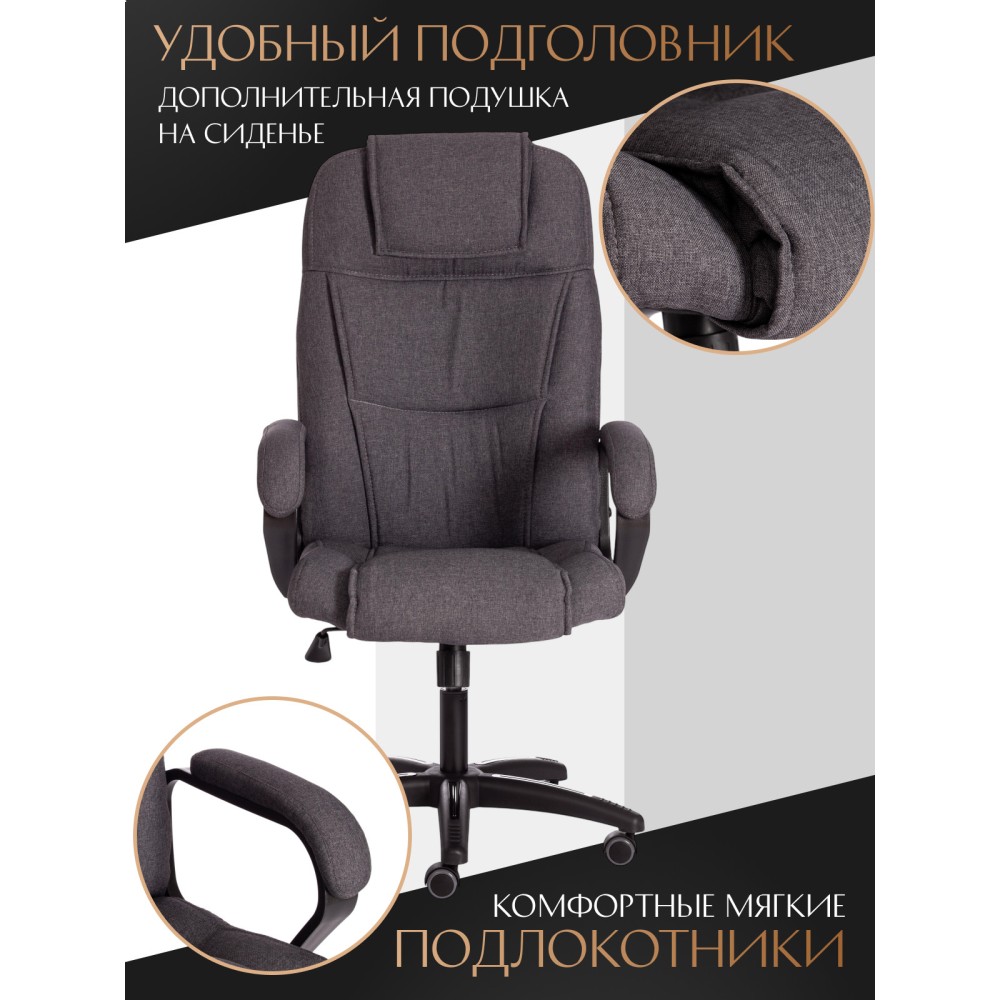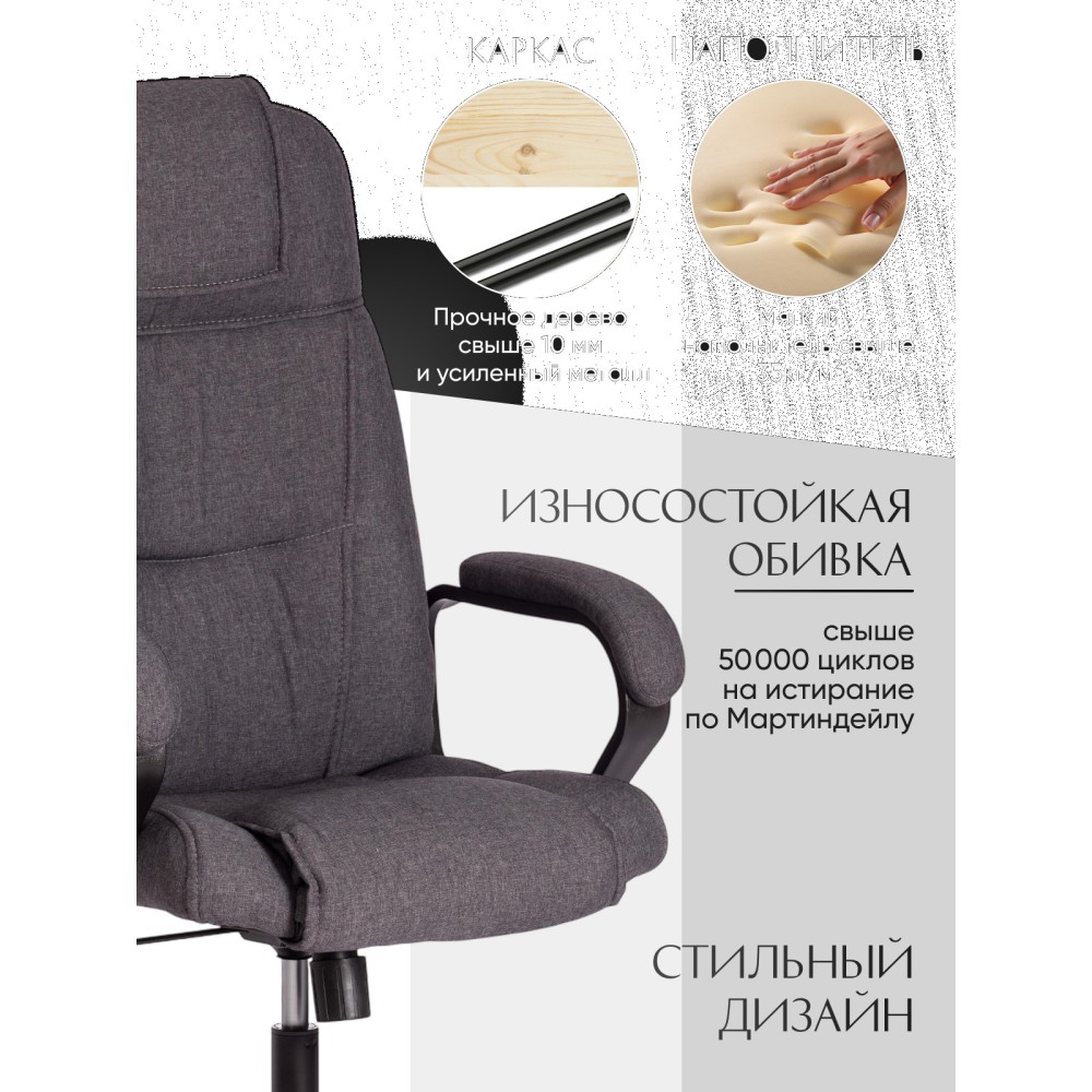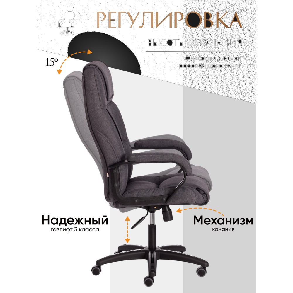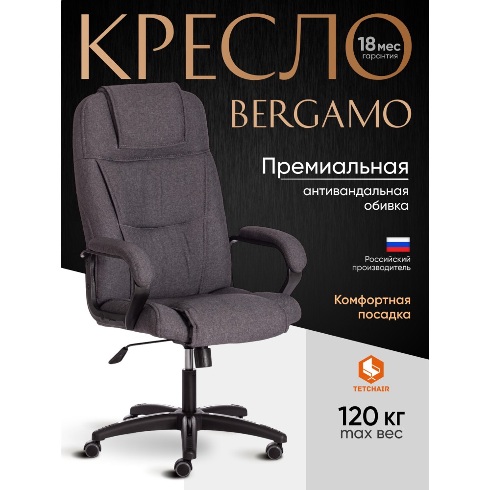 Стильное компьютерное кресло BERGAMO (22) из коллекции OFFICE идеально дополнит интерьер вашего рабочего кабинета в квартире, доме или офисе. Благодаря уникальному внешнему виду модели кабинет руководителя или переговорная комната будет выглядеть презентабельно и непревзойденно. Каркас выполнен из экологически чистой фанеры толщиной более 10 мм, придающей офисному креслу прочность и долговечность. Сиденье с наполнителем из пенополиуретана (до 35 кг/м2) стандартной плотности может принимать необходимую форму и быстро возвращаться в исходное состояние. Пластиковая крестовина с декоративными вставками надежна, устойчива к частому использованию и усиленной эксплуатации. Фиксированные пластиковые подлокотники с мягкими накладками уменьшат дискомфорт в плечах и шее при длительной работе. Кресло регулируется по высоте. Механизм качания с фиксацией в одном положении поможет расслабиться и принять удобную позу. Полиуретановые ролики с прорезиненными вставками имеют тихий ход, подходят для использования на ламинате и паркете. Ролики и крестовина в креслах бренда TETCHAIR соответствуют стандарту BIFMA. Во всех креслах бренда TETCHAIR используются газлифты 3 класса, он способен выдерживать вес до 120 кг. Эргономичное компьютерное кресло, обитое износостойкой высокопрочной экокожей или приятным на ощупь флоком, представлено в коричневом, черном, бежевом, сером и синем цветах. Экокожа, используемая при изготовлении кресла, выдерживает до 50 000 циклов на истирание по Мартиндейлу, ткань флок также выдерживает до 50 000 циклов. Ткани с прочностью более 35 000 циклов являются самыми долговечными. Элегантное кресло BERGAMO (22) выглядит привлекательно, эстетично и стильно, характеризует безупречный вкус и статус своего владельца. Модель поставляется в разобранном виде. Необходима простая сборка по прилагаемой инструкции. Максимальная нагрузка 120 кг.