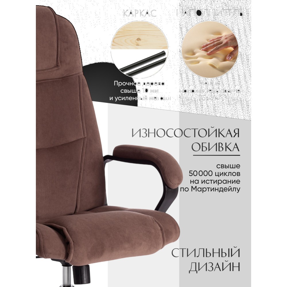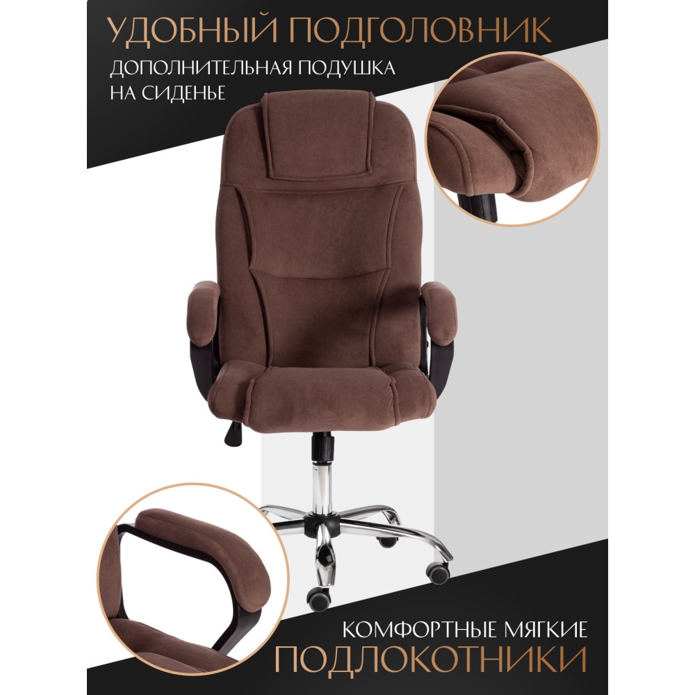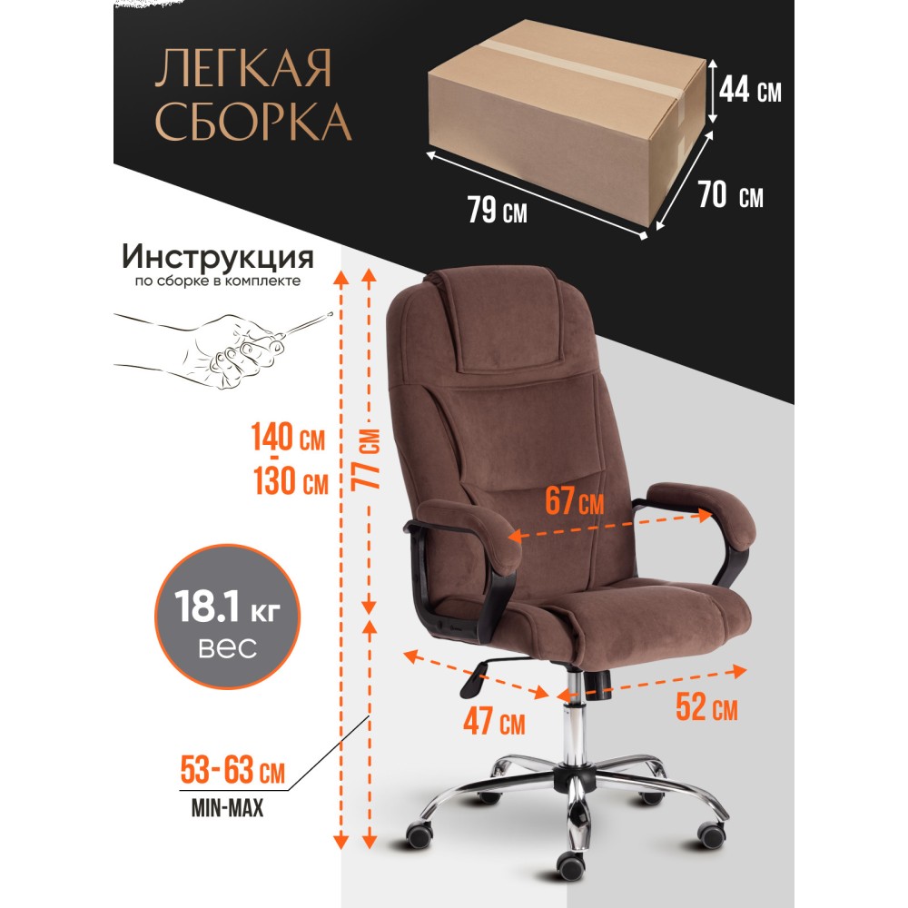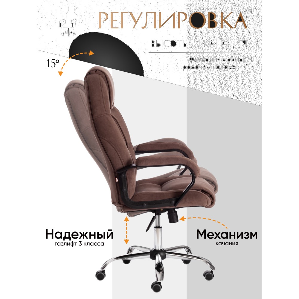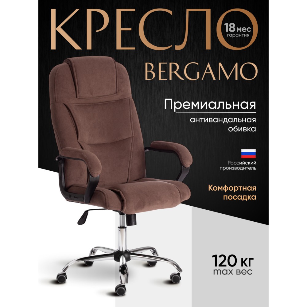 Стильный дизайн кресла BERGAMO хром (22) из коллекции OFFICE станет прекрасным дополнением в интерьере офиса, переговорной комнаты или кабинета руководителя. Модель, имеющая привлекательный дизайн и элегантный внешний вид, понравится даже самому требовательному владельцу. Надежный каркас выполнен из усиленной фанеры толщиной более 10 мм. Такой материал отличается практичностью, прочностью и основательностью. Сиденье и спинка с мягким наполнителем из пенополиуретана (до 35 кг/м2) стандартной плотности обладают долгим сроком службы, не деформируются, пропускают воздух, отводят влагу и не накапливают пыль. Хромированная крестовина устойчива, способна выдерживать большие нагрузки. Офисное кресло регулируется по высоте и наклону с фиксацией в одном положении. Бесшумные полиуретановые колесики с прорезиненными вставками позволяют легко перемещаться с места на место, не повреждая ламинат или паркет. Ролики и крестовина в креслах бренда TETCHAIR соответствуют стандарту BIFMA. Во всех креслах бренда TETCHAIR используются газлифты 3 класса, он способен выдерживать вес до 120 кг. Фиксированные пластиковые подлокотники с мягкими накладками помогут снять напряжение с плеч и шеи при длительной работе. Благодаря обивке из износостойкой высокопрочной экокожи и прочного флока модель не требует сложного ухода, не теряет своего первоначального вида долгие годы, обладает отличными эксплуатационными качествами. Экокожа, используемая при изготовлении кресла, выдерживает до 50 000 циклов на истирание по Мартиндейлу, ткань флок также выдерживает до 50 000 циклов. Ткани с прочностью более 35 000 циклов являются самыми долговечными. Компьютерное кресло BERGAMO хром (22) изготавливается в коричневом, черном, бежевом, сером, синем и белом цветах. Эргономичная модель подчеркнет безупречный вкус владельца, будет радовать своей долговечностью, красотой и практичностью продолжительное время. Офисное кресло поставляется в разобранном виде. Необходима простая сборка по прилагаемой инструкции. Максимальная нагрузка 120 кг.