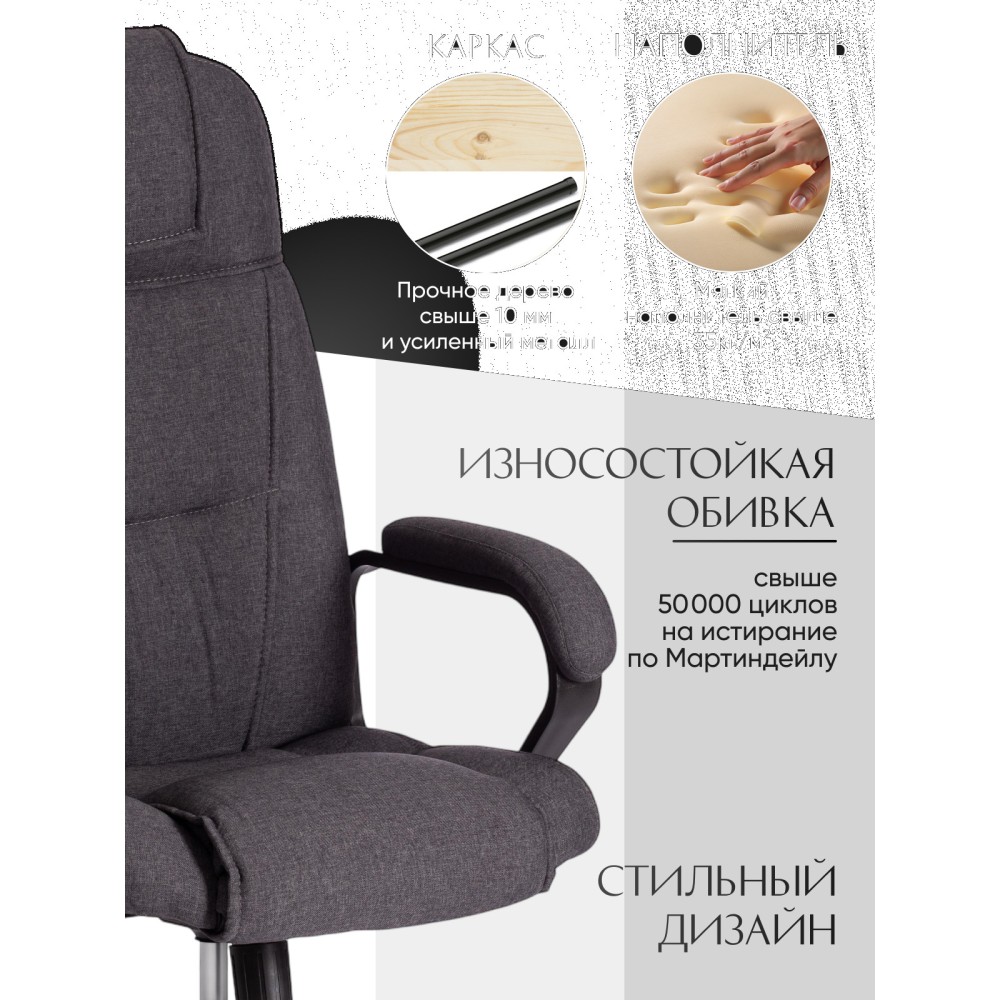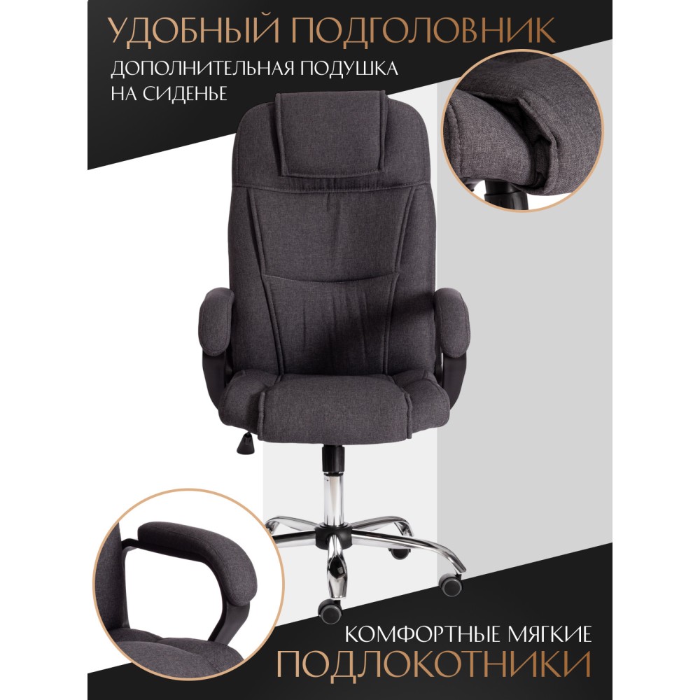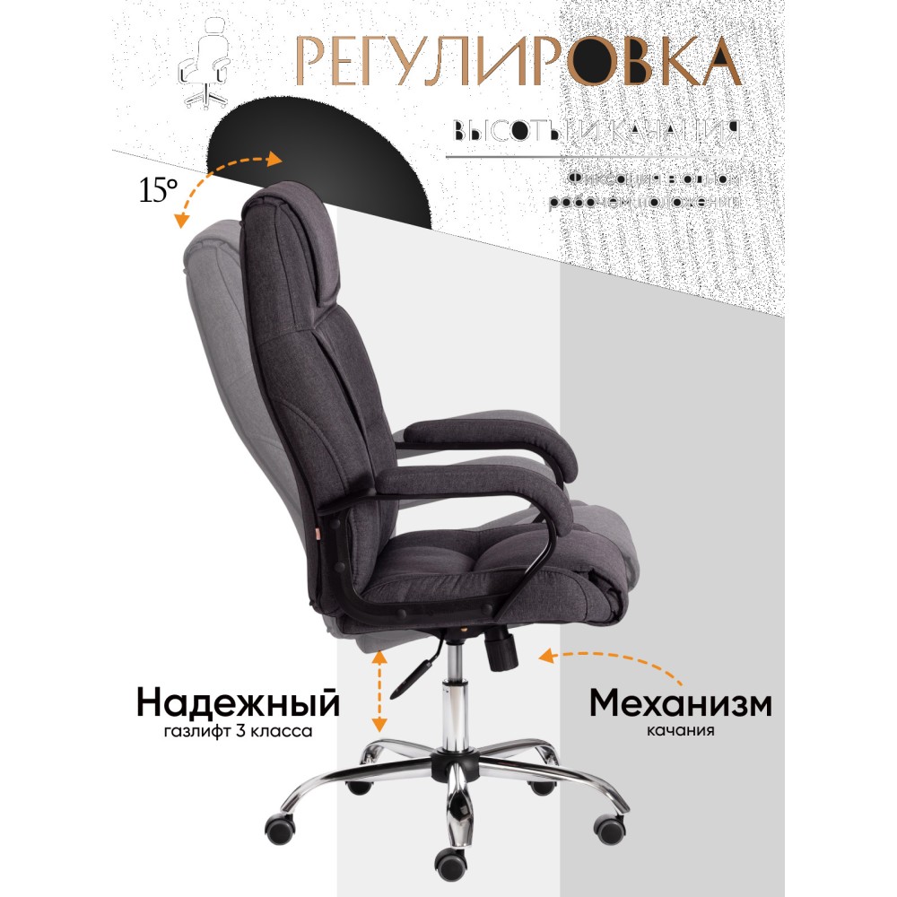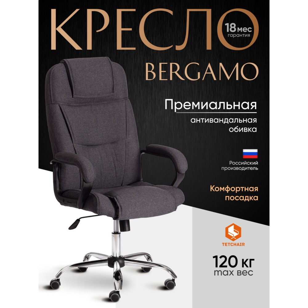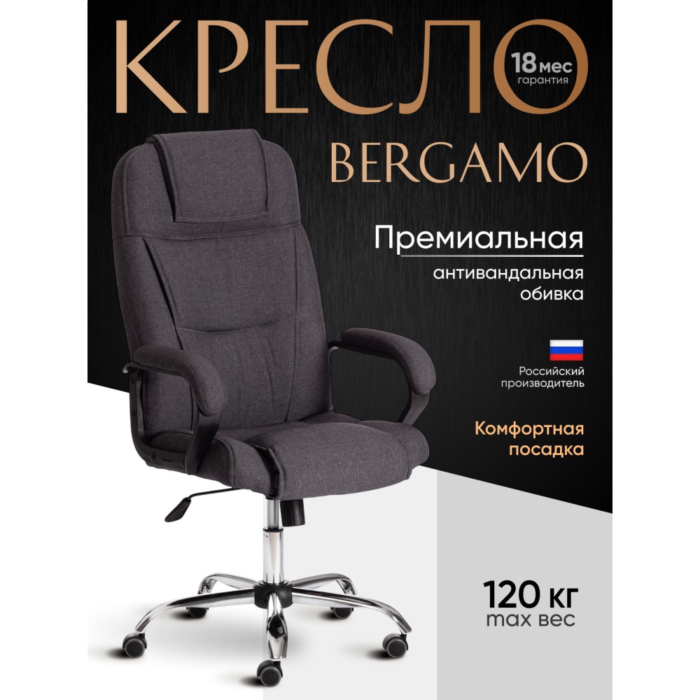 Стильный дизайн кресла BERGAMO хром (22) из коллекции OFFICE станет прекрасным дополнением в интерьере офиса, переговорной комнаты или кабинета руководителя. Модель, имеющая привлекательный дизайн и элегантный внешний вид, понравится даже самому требовательному владельцу. Надежный каркас выполнен из усиленной фанеры толщиной более 10 мм. Такой материал отличается практичностью, прочностью и основательностью. Сиденье и спинка с мягким наполнителем из пенополиуретана (до 35 кг/м2) стандартной плотности обладают долгим сроком службы, не деформируются, пропускают воздух, отводят влагу и не накапливают пыль. Хромированная крестовина устойчива, способна выдерживать большие нагрузки. Офисное кресло регулируется по высоте и наклону с фиксацией в одном положении. Бесшумные полиуретановые колесики с прорезиненными вставками позволяют легко перемещаться с места на место, не повреждая ламинат или паркет. Ролики и крестовина в креслах бренда TETCHAIR соответствуют стандарту BIFMA. Во всех креслах бренда TETCHAIR используются газлифты 3 класса, он способен выдерживать вес до 120 кг. Фиксированные пластиковые подлокотники с мягкими накладками помогут снять напряжение с плеч и шеи при длительной работе. Благодаря обивке из износостойкой высокопрочной экокожи и прочного флока модель не требует сложного ухода, не теряет своего первоначального вида долгие годы, обладает отличными эксплуатационными качествами. Экокожа, используемая при изготовлении кресла, выдерживает до 50 000 циклов на истирание по Мартиндейлу, ткань флок также выдерживает до 50 000 циклов. Ткани с прочностью более 35 000 циклов являются самыми долговечными. Компьютерное кресло BERGAMO хром (22) изготавливается в коричневом, черном, бежевом, сером, синем и белом цветах. Эргономичная модель подчеркнет безупречный вкус владельца, будет радовать своей долговечностью, красотой и практичностью продолжительное время. Офисное кресло поставляется в разобранном виде. Необходима простая сборка по прилагаемой инструкции. Максимальная нагрузка 120 кг.