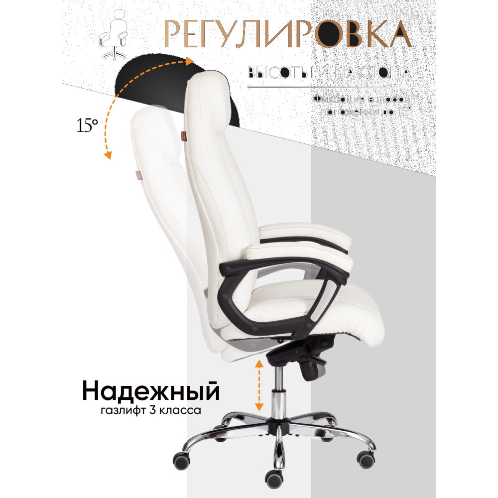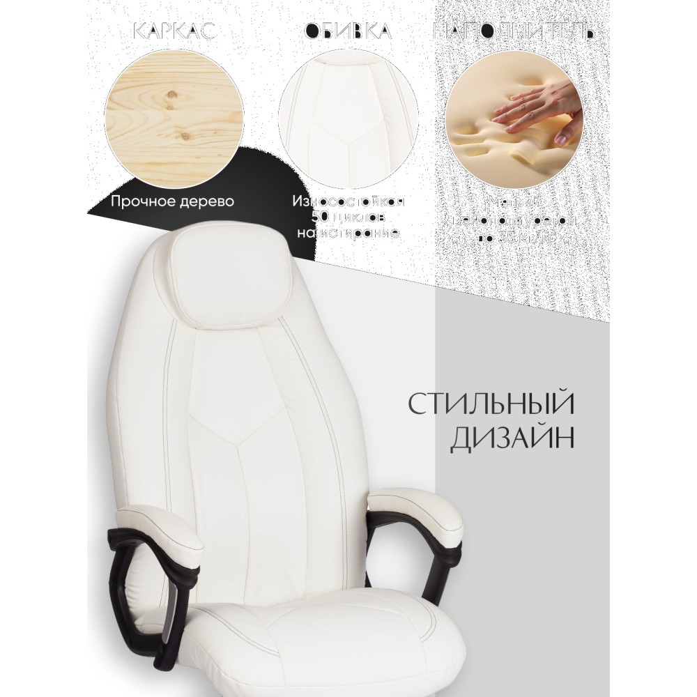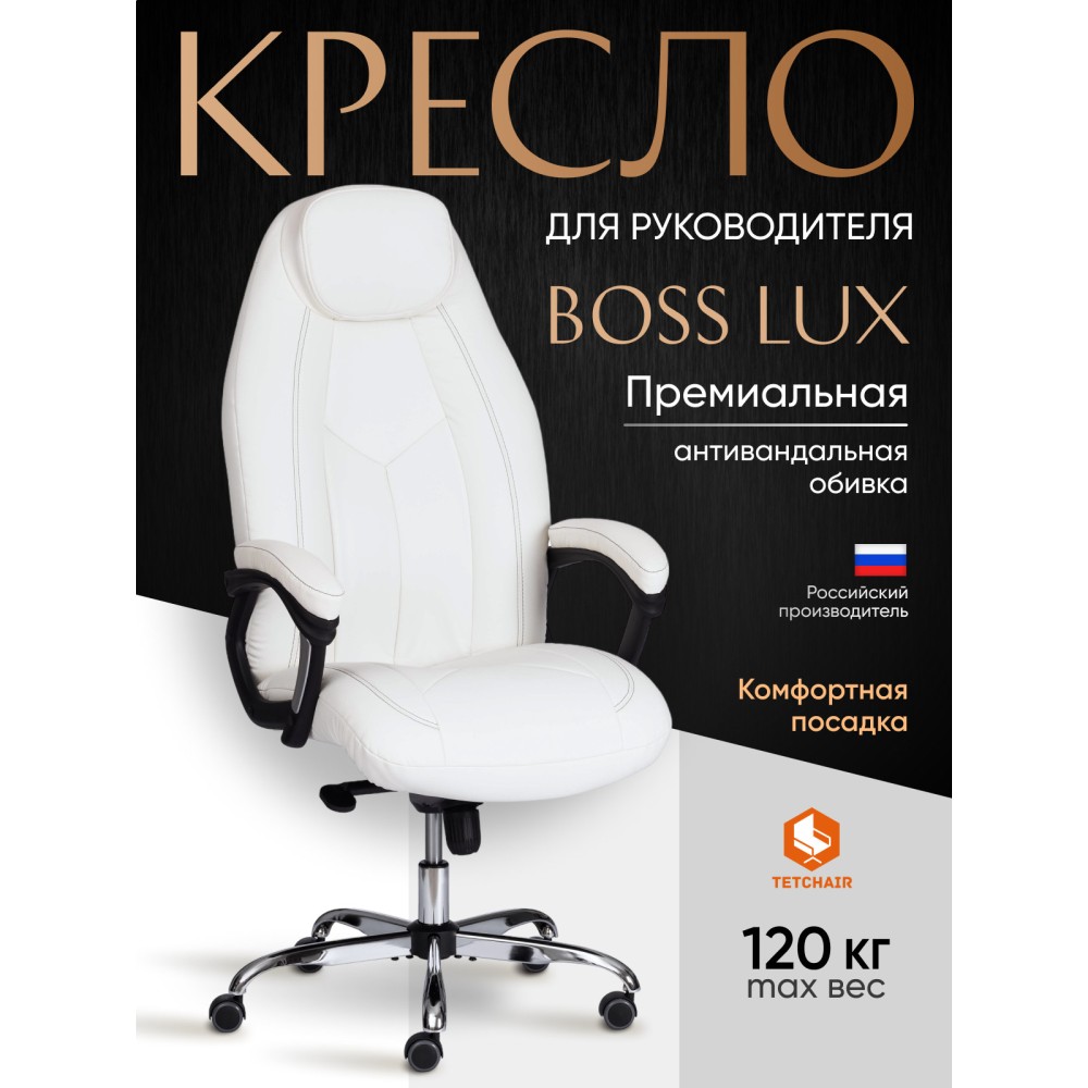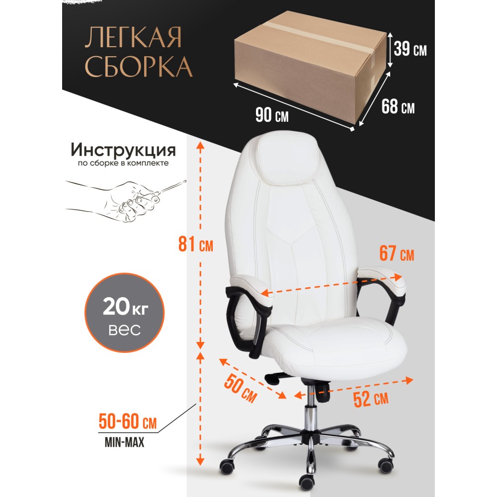 Практичное и функциональное компьютерное кресло BOSS lux из коллекции OFFICE – необычный акцент в пространстве вашего дома или офиса. Модель прекрасно подойдет как для кабинета руководителя, так и для переговорной комнаты. Сиденье с мягким наполнителем из пенополиуретана стандартной плотности (до 35 кг/м2) уменьшит усталость при длительной работе. Каркас офисного кресла изготовлен из фанеры толщиной до 15 мм. Такой материал обладает отличными эксплуатационными качествами, прочностью и долговечностью. Кресло регулируется по высоте и наклону с фиксацией в нескольких положениях до 15 градусов. Жесткость механизма качания настраивается при помощи специального барабана. Металлическая хромированная крестовина надежна, основательна и устойчива. Ролики из полиуретана с прорезиненными вставками не шумят при перемещении, не оставляют следов на напольном покрытии. Ролики и крестовина в креслах бренда TETCHAIR соответствуют стандарту BIFMA. Во всех креслах бренда TETCHAIR используются газлифты 3 класса, он способен выдерживать вес до 120 кг. Удобный подголовник и фиксированные пластиковые подлокотники с мягкими накладками снизят нагрузку на шею и плечевой пояс. Оригинальное офисное кресло BOSS lux, обитое высокопрочной износостойкой экокожей или флоком, представлено в нескольких вариантах: коричневом, бежевом, черном, белом, сером, зеленом цветах. Экокожа , используемая при изготовлении кресла, выдерживает до 50 000 циклов на истирание по Мартиндейлу, мягкая ткань рогожка выдерживает до 40 000 циклов. Ткани с прочностью более 35 000 циклов являются самыми долговечными. Эргономичная модель подчеркнет безупречный вкус владельца, будет радовать своей долговечностью, презентабельностью и практичностью продолжительное время. Максимальная нагрузка 120 кг. Модель поставляется в разобранном виде. Требуется простая сборка по прилагаемой инструкции.