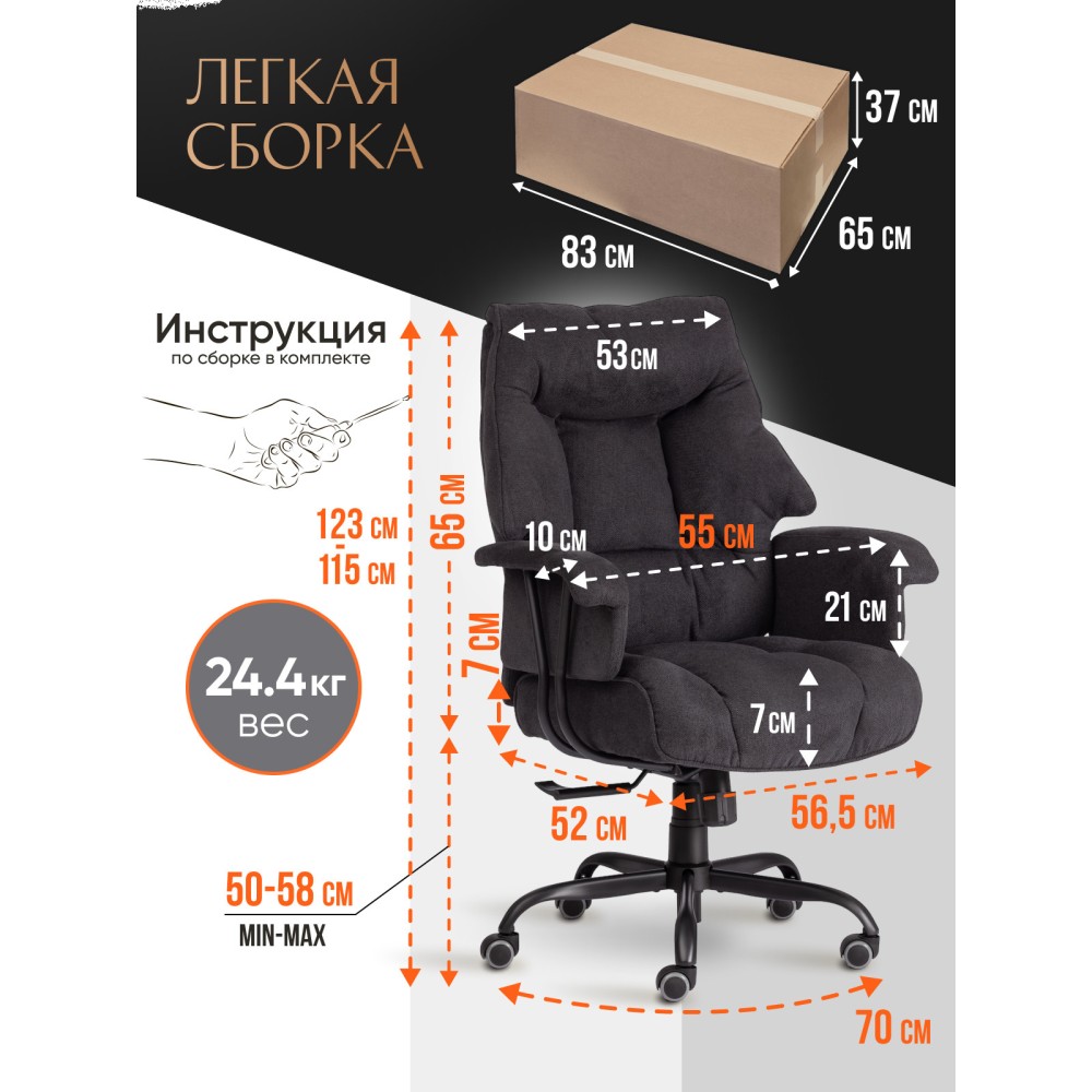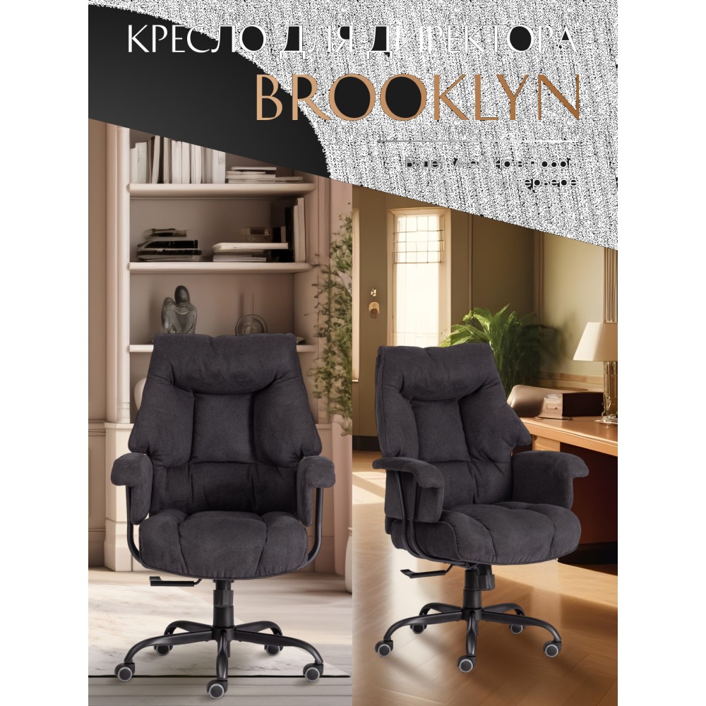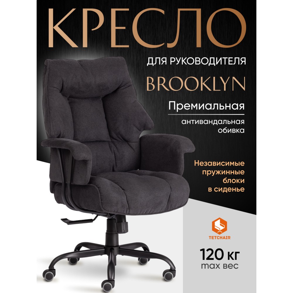 Удобное и функциональное компьютерное кресло BROOKLYN прекрасно подойдет для кабинета руководителя и переговорной комнаты, подчеркнет безупречный вкус владельца и придаст интерьеру презентабельный вид как в офисе так и в квартире. 5-лучевая стальная разборная крестовина диаметром 700 мм надежна и устойчива к усиленной эксплуатации. Вместительное сиденье и анатомическая спинка с мягким наполнителем из пенополиуретана плотностью не менее 30 кг/м3 с независимым пружинным блоком легко подстраиваются под контуры тела, не теряют форму на протяжении длительного времени. Обивка из износостойкой мебельной ткани черного цвета не требует сложного ухода, долговечна, выдерживает до 50 000 циклов на истирание по Мартиндейлу. Широкие мягкие подлокотники, механизм регулировки высоты сиденья и угла наклона до 15 градусов с возможностью фиксации в трех положениях позволят провести длинный рабочий день без усталости, а также снять напряжение с поясницы и позвоночника. Элегантное кресло оборудовано надежным газлифтом 3 класса с ходом 60 мм. Высококачественные полиамидные прорезиненные ролики не повреждают поверхность, подойдут для использования на паркете и ламинате. Диаметр штока – 11 мм. Компьютерное кресло BROOKLYN – это сочетание комфорта, функциональности, практичности и привлекательности. Модель поставляется в разобранном виде. Необходима простая сборка по прилагаемой инструкции. Максимальная нагрузка 120 кг.